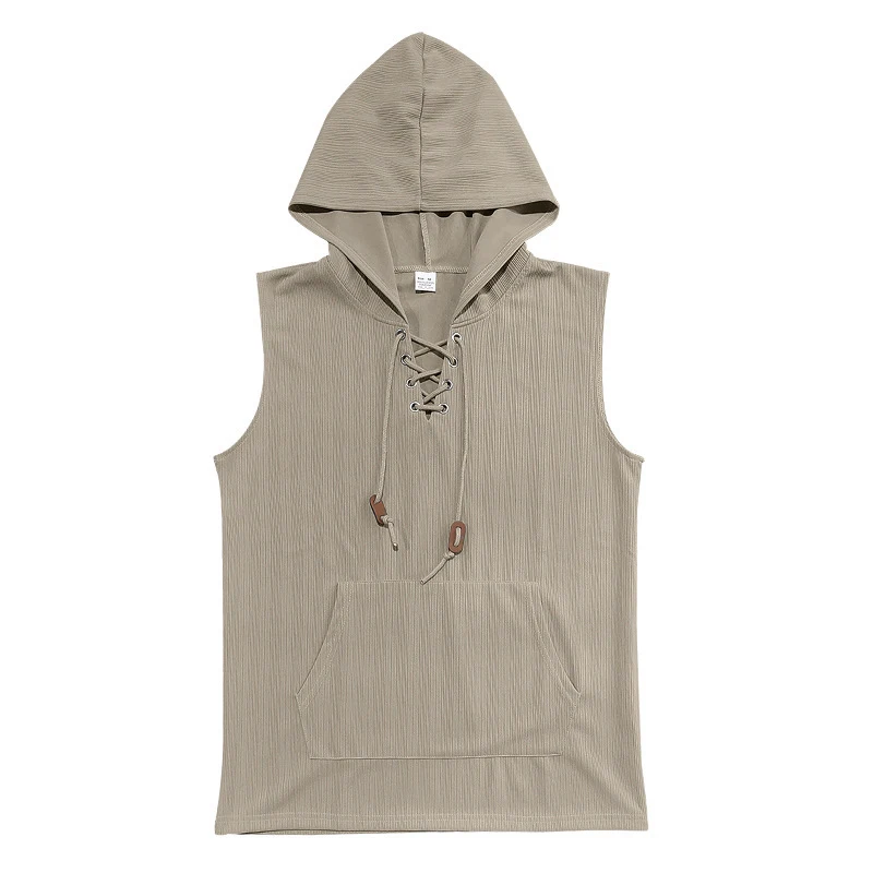 Wiaofellas - Fashion Ribbed Textured Tank Tops Mens Hoodie Sleeveless V Neck Drawstring Hooded Vest Summer Men Loose Solid Color Camisoles