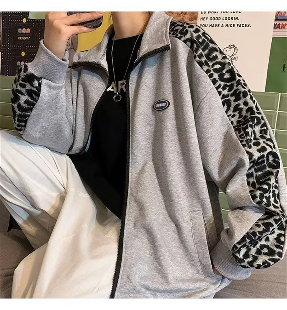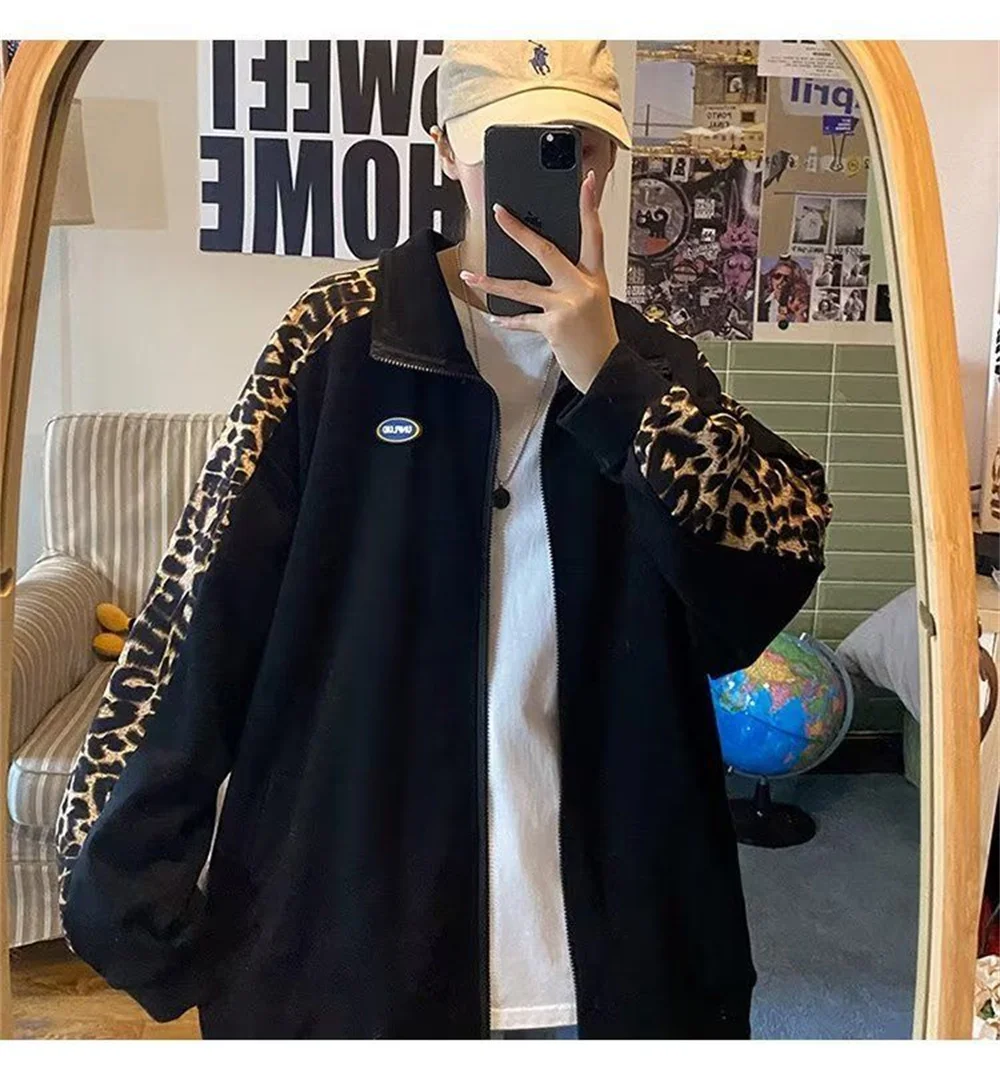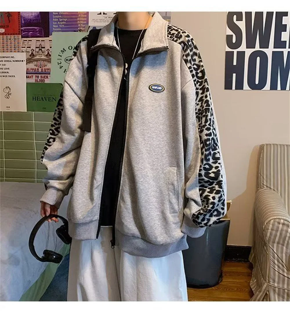 Wiaofellas - Jackets, men's leopard print jackets, spring and autumn new American style loose hooded zippered cardigan hoodies