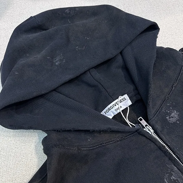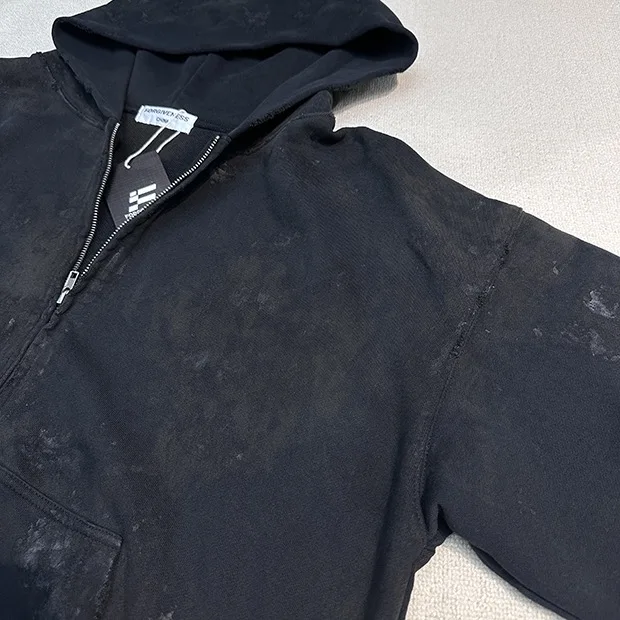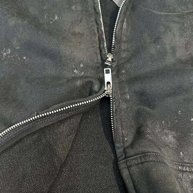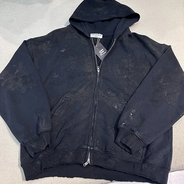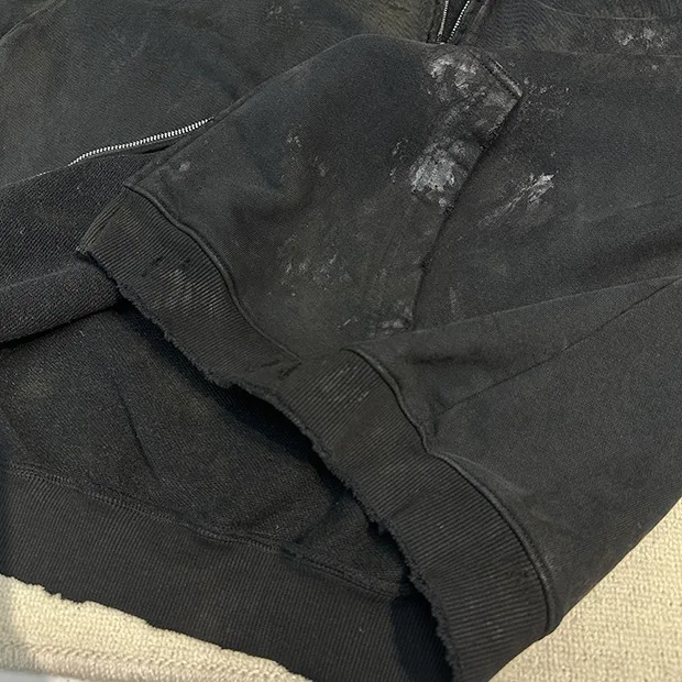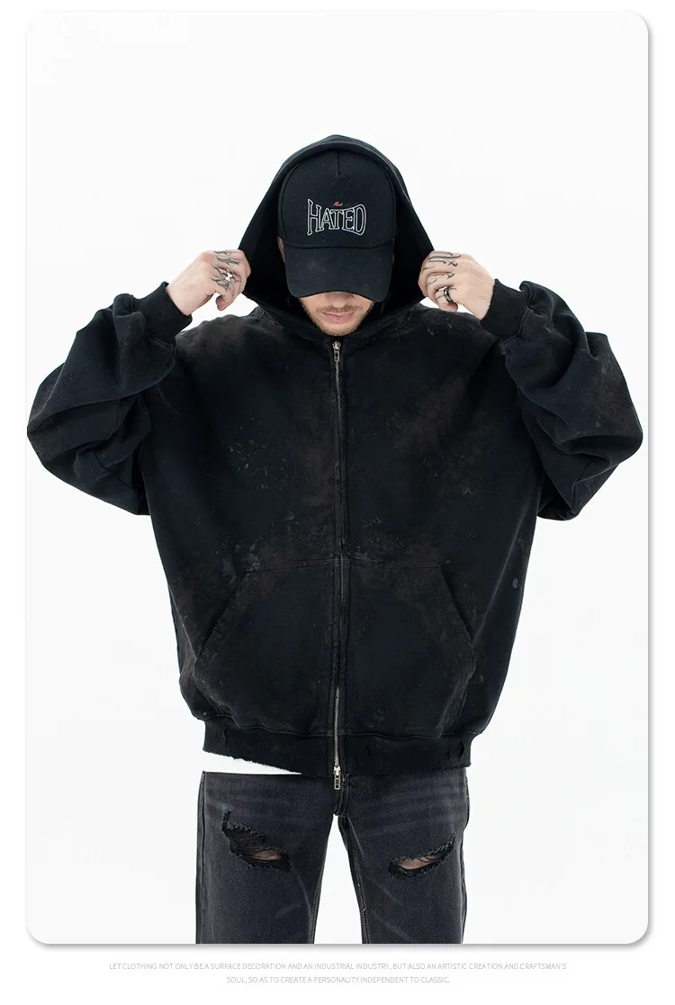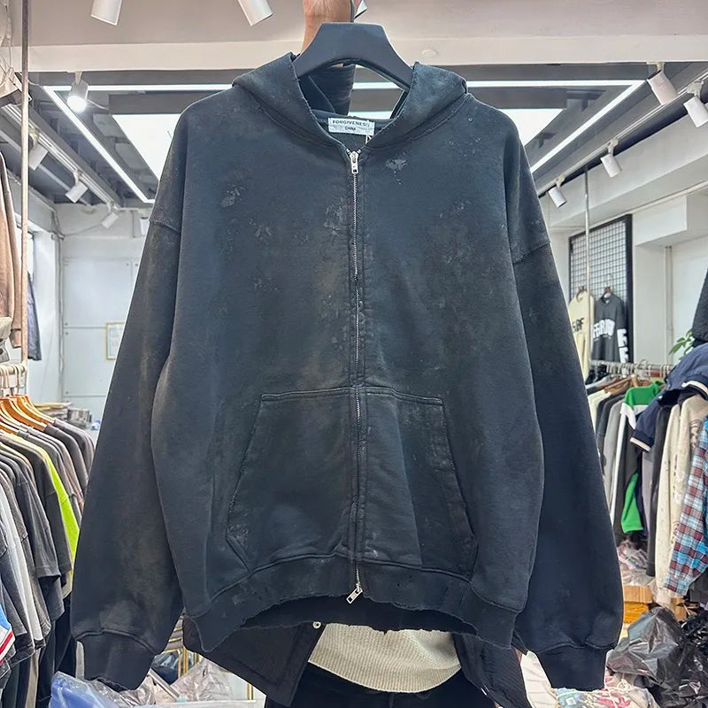 Wiaofellas - Worn scuffed and stained loose zippered hoodie