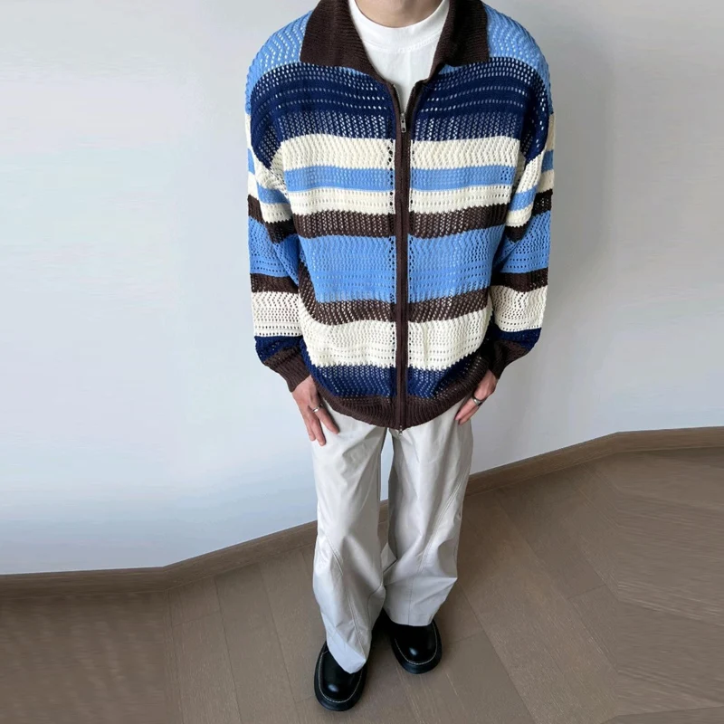 Wiaofellas - Casual Zipper High Street Oversize Sweater Coats Fashion Men's Long Sleeve Knitted Jacket Turn Down Collar Striped Knitwear