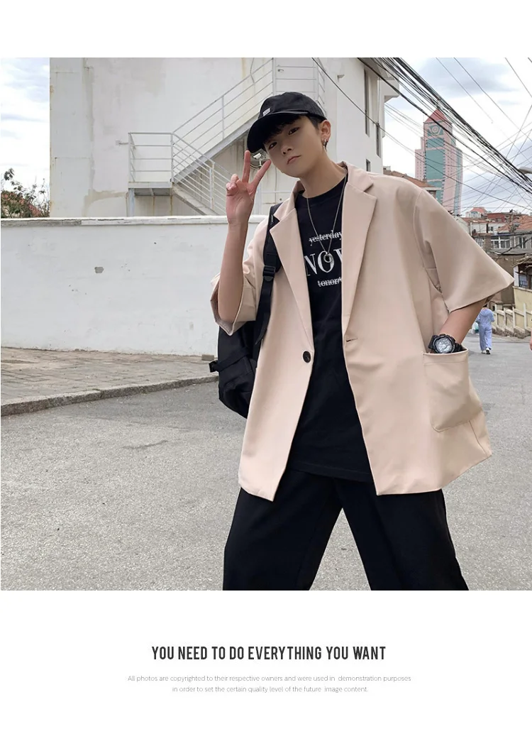 Wiaofellas - Men City Boy Summer Blazer Half Sleeve Streetwear Handsome Loose Draped Single Button Coat Jackets Shirts Solid Chic Tops Blouse
