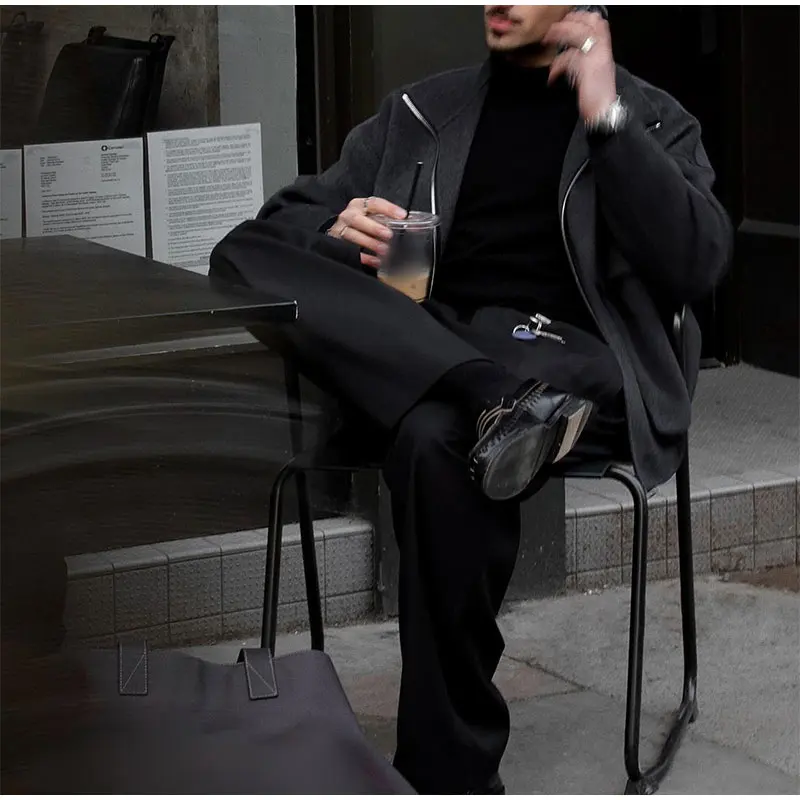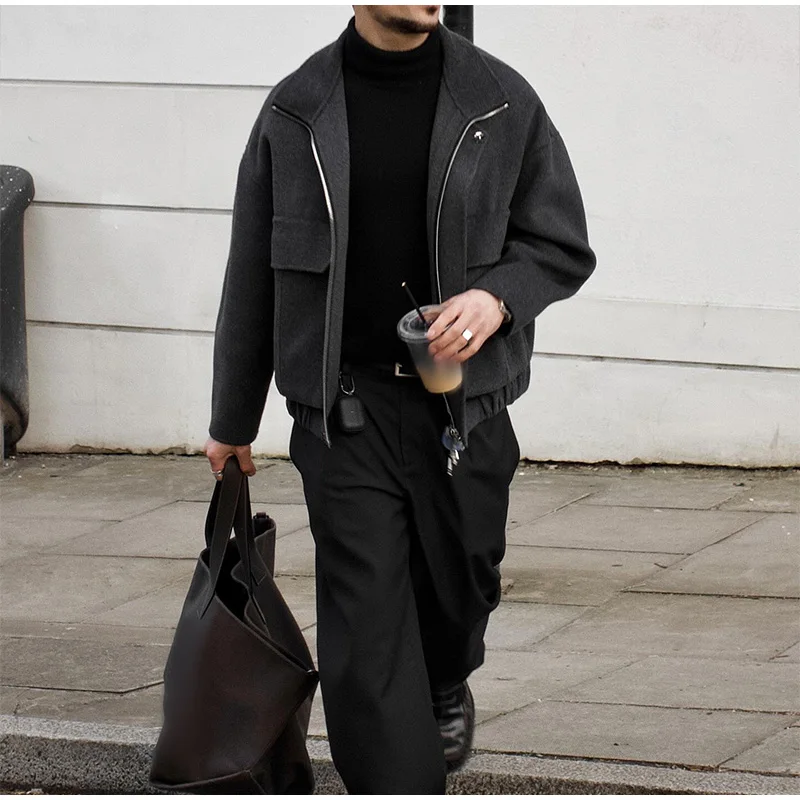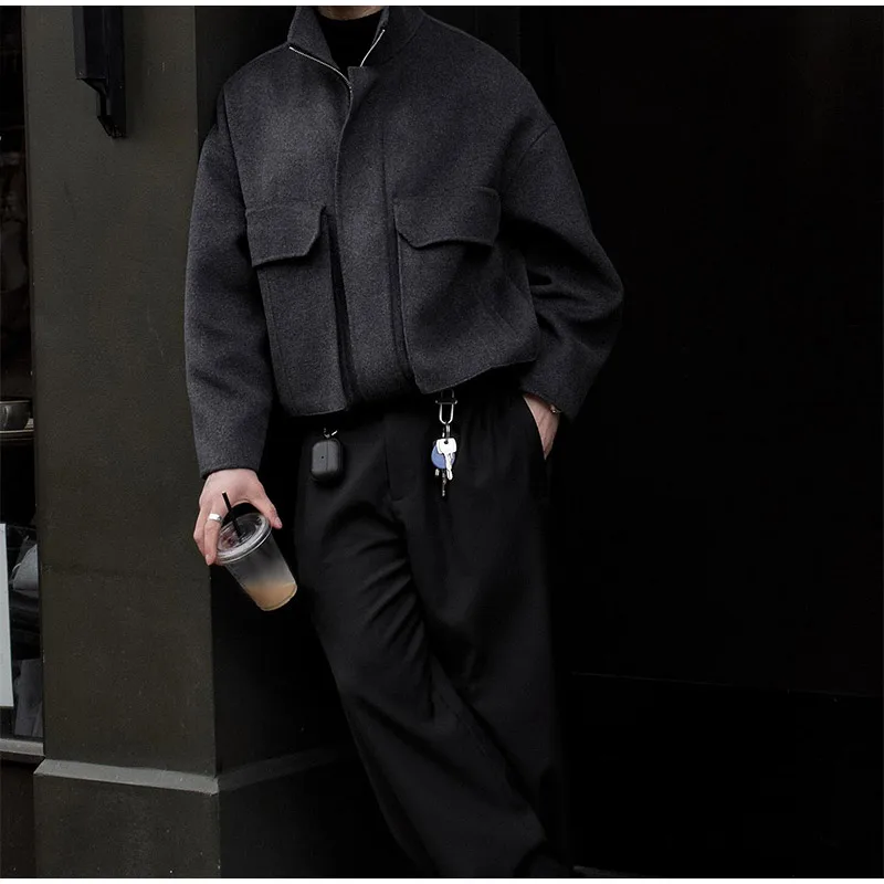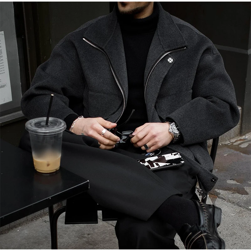 Wiaofellas - Men's Trendy Woolen Jacket 204 Autumn Winter Long Sleeve Pocket Zipper Thicked Coat Male Cropped Trench Thicken Woollen Overcoat