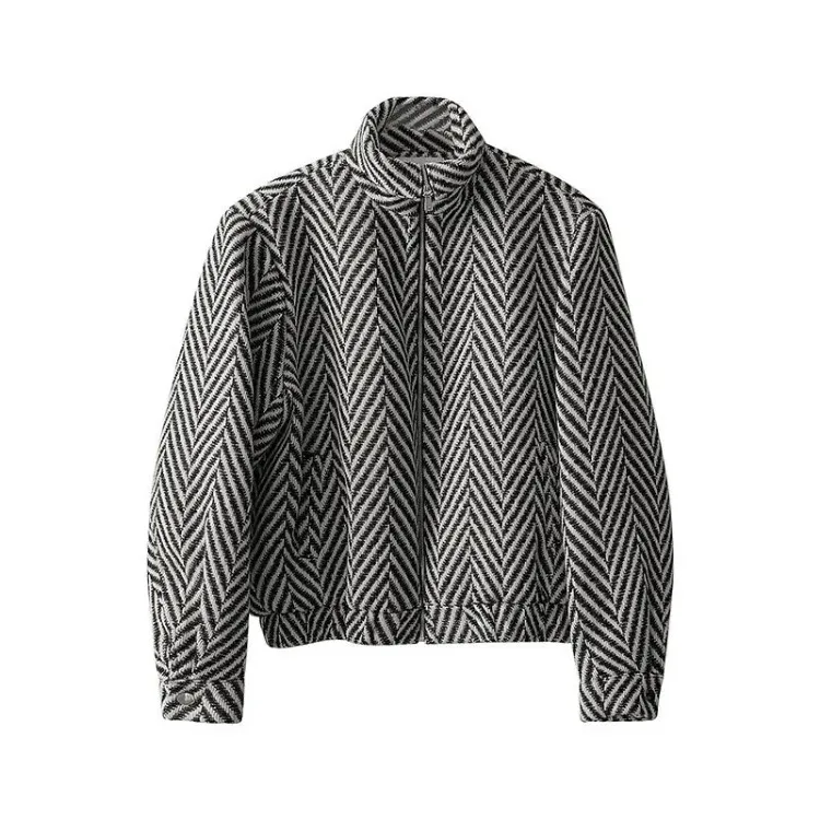 Wiaofellas British Style Black White Striped Jacket Autumn Classic Stand Collar Thick Wool Jackets Gentlemen Broad Shoulder Knitted Coats