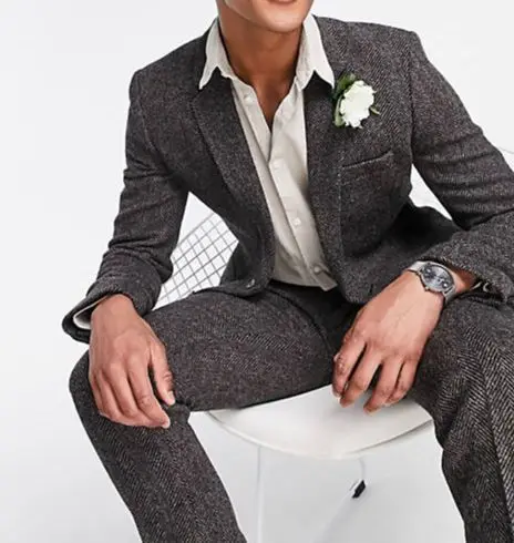 Wiaofellas - (Jacket+Pants) Tailor-Made Dark Grey Herringbone Male Work Set 2 Piece Grooms Party Outfit For Man Jscket Coat Custom Made