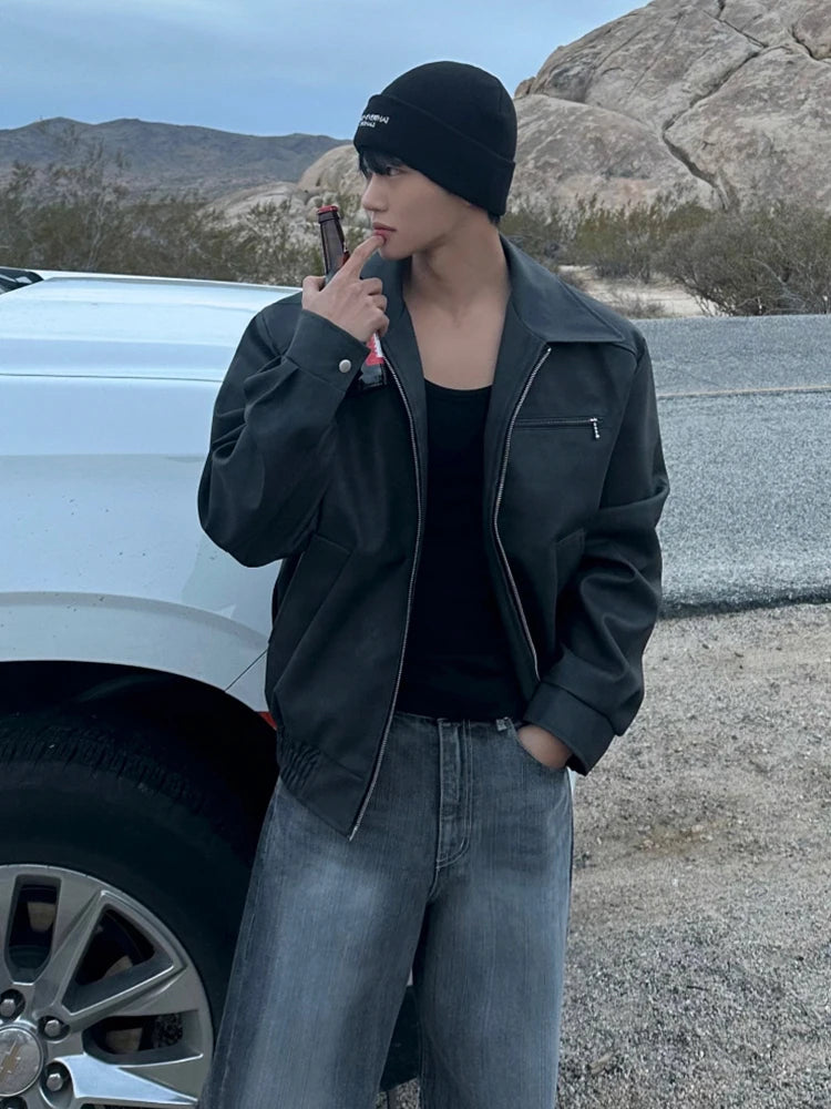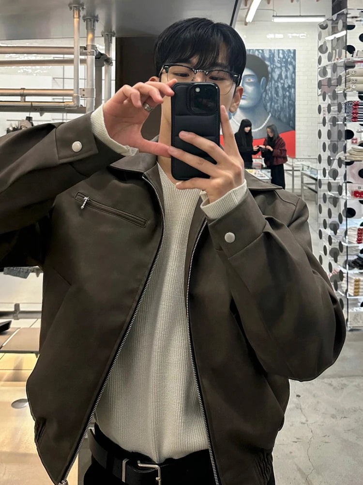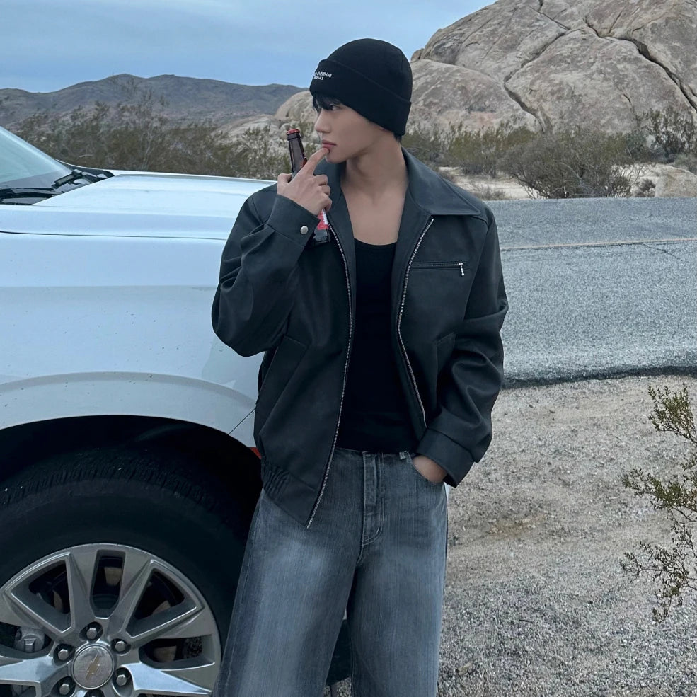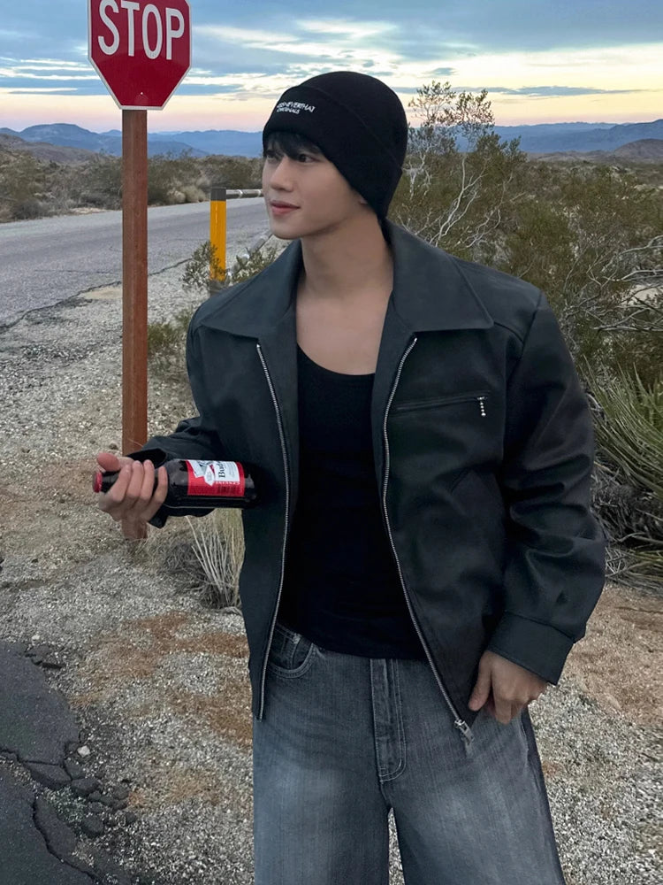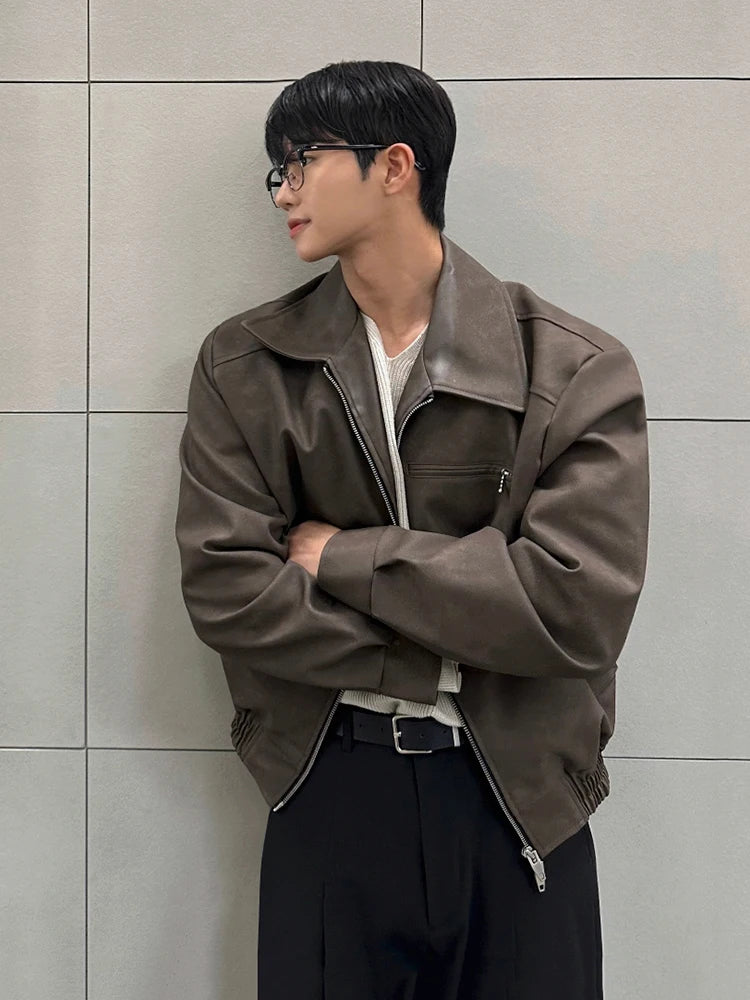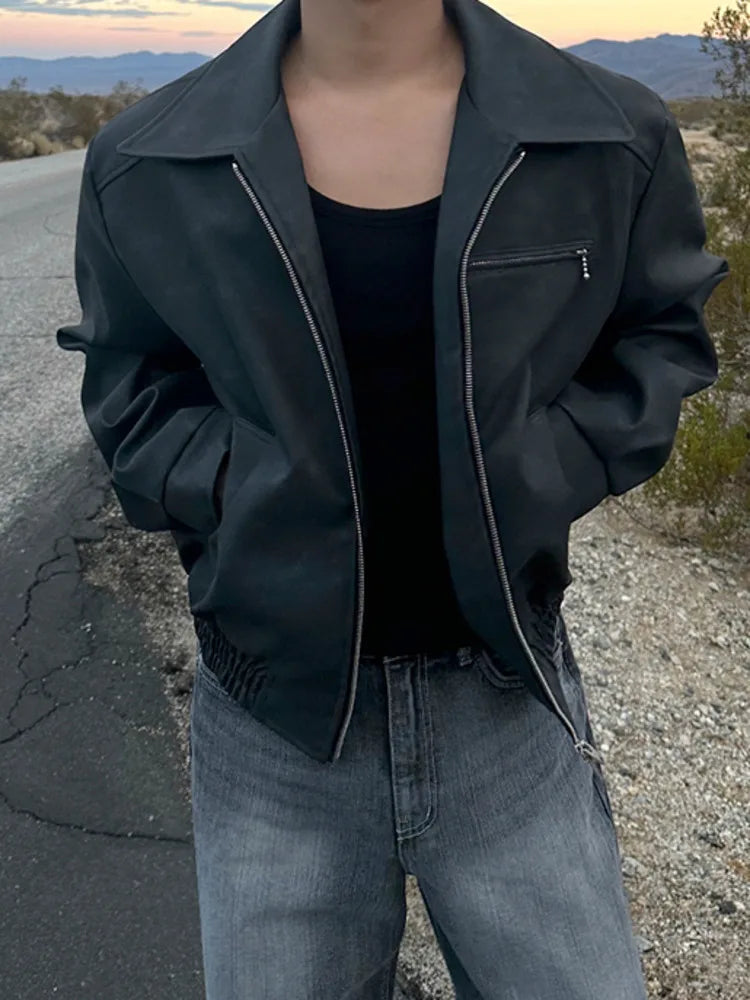 WIAOFELLAS - Korean Style Men's Jackets PU Leather Solid Color Turn-down Collar Loose Menswear Casual Zipper Male Coats 2025 Spring