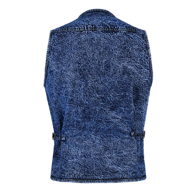 WIAOFELLAS - Men Vest Denim Waistcoat Jacket Deep Blue Male Sleeveless Coat Spring Autumn Multi-Pocket Jeans Gilet Outwear New Chalecos