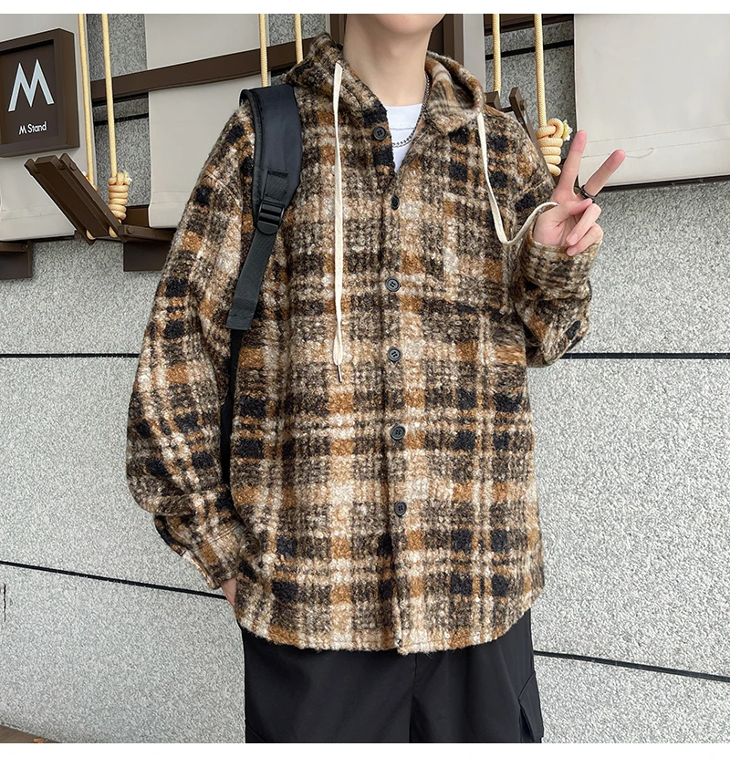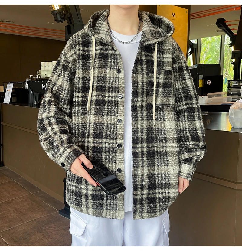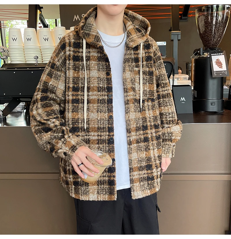 WIAOFELLAS - Plus Size Men Hooded Shirt Coats Winter Autumn Plaid Thicken Warm Woolen Unisex Jackets Fashion Trendy Mens Clothing Streetwear