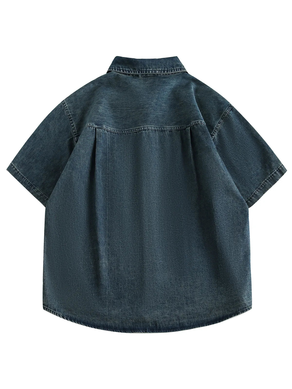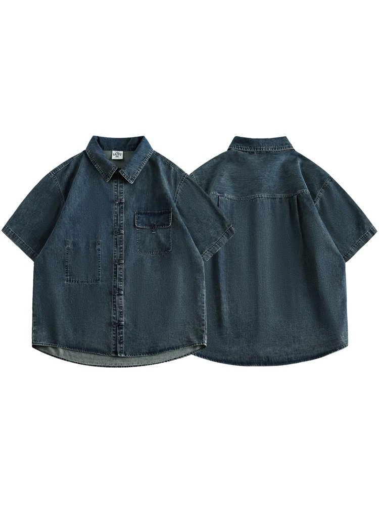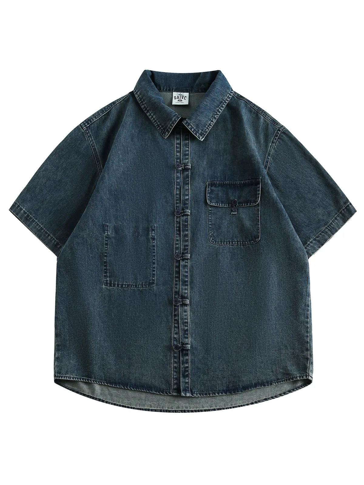 WIAOFELLAS - Retro Denim Shirts For Men Chinese Style Tang Costume Short Sleeved Top Jacket Coat Summer Oversized Loose Streetwear Shirts