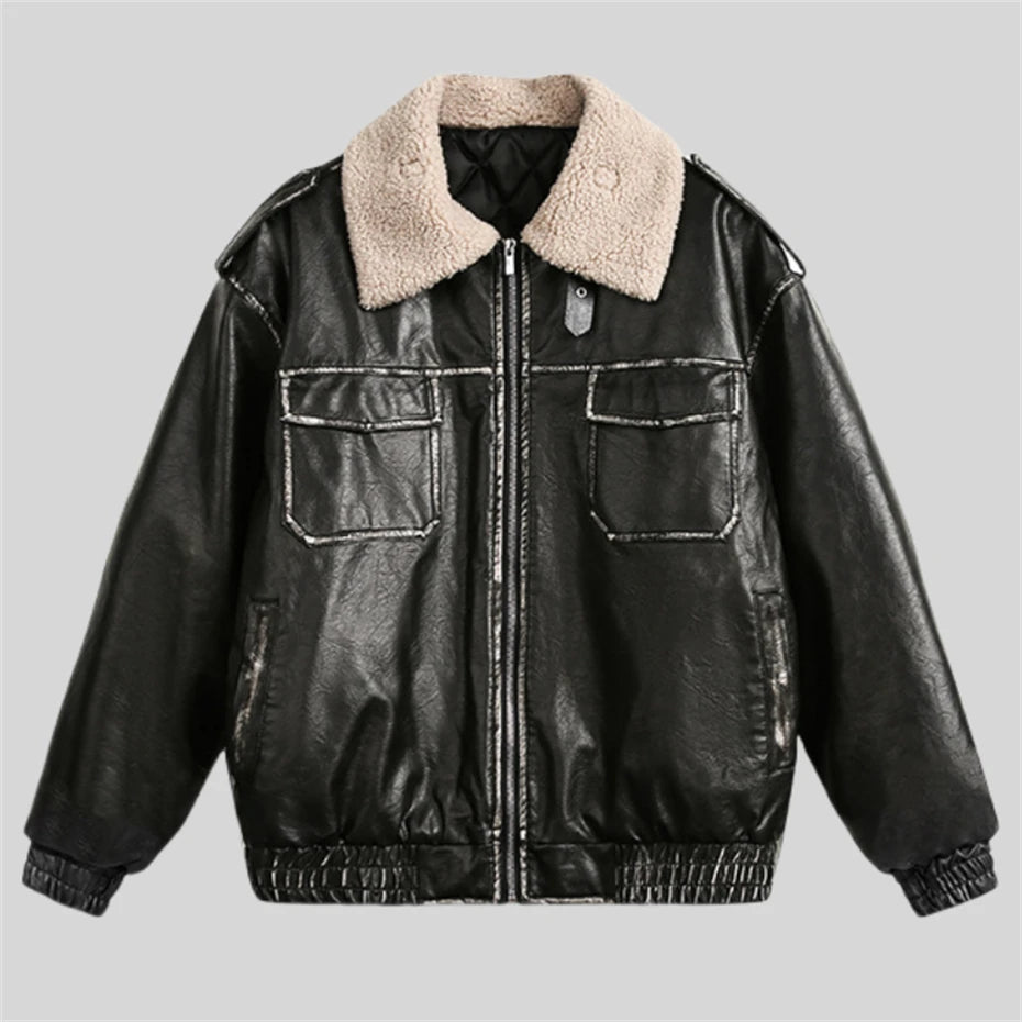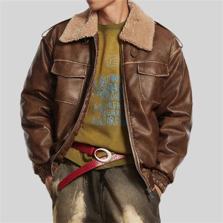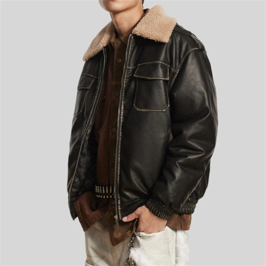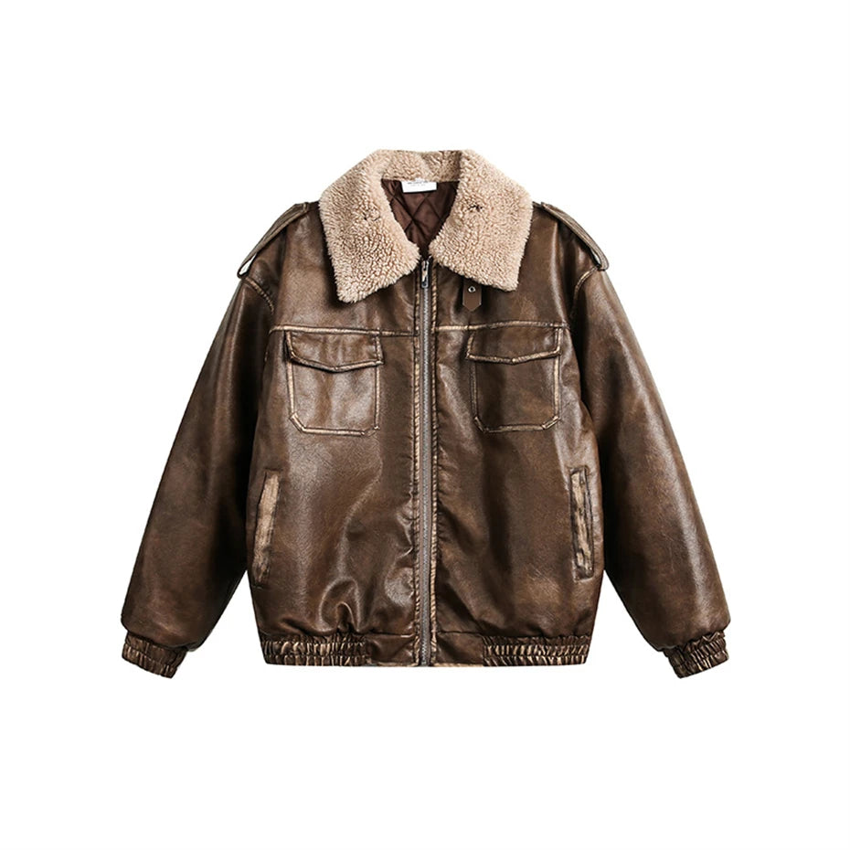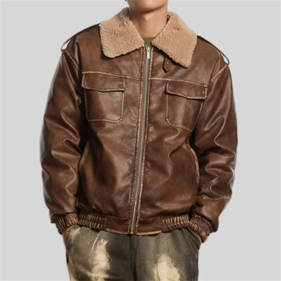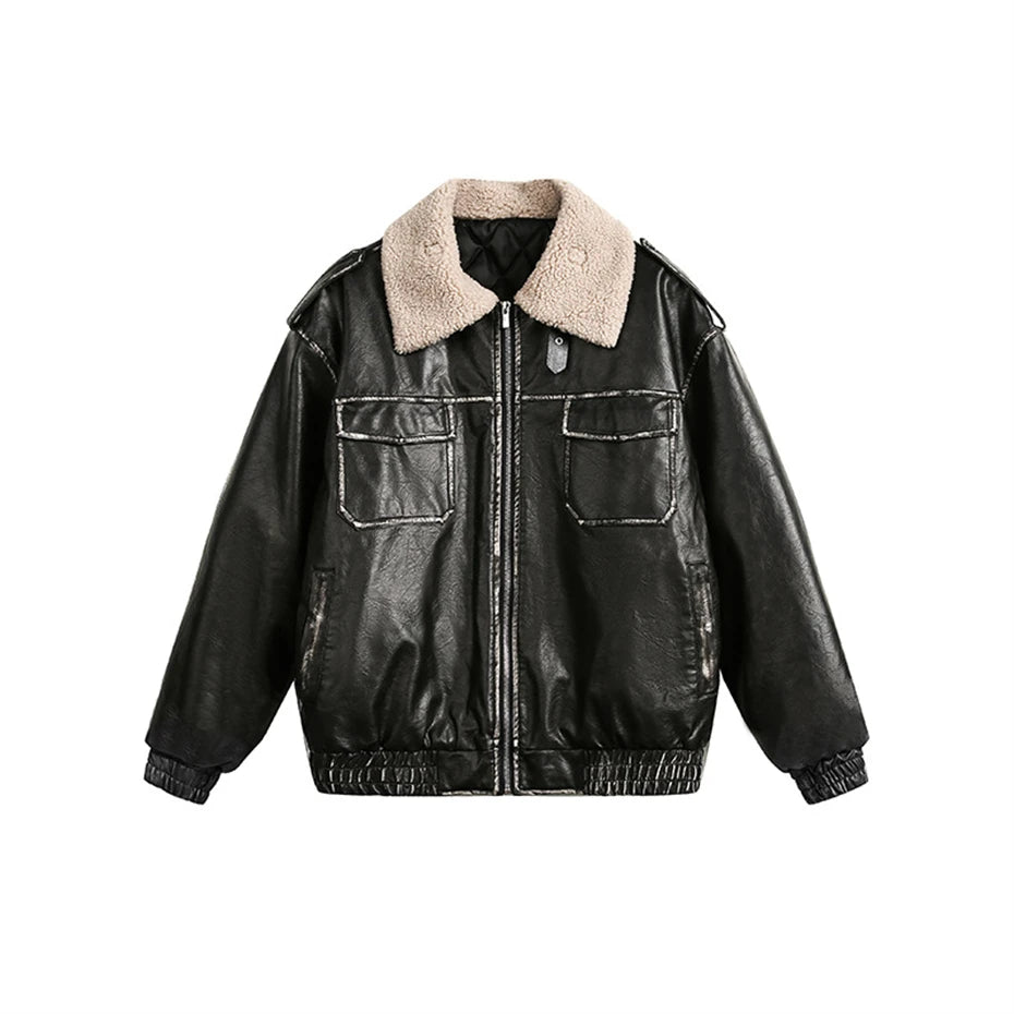 WIAOFELLAS - Retro PU Leather Jacket Men Winter Thick Lamb Jacket Coat Men Oversized Streetwear Hip Hop Zip Up Windbreaker Black Brown Jacket