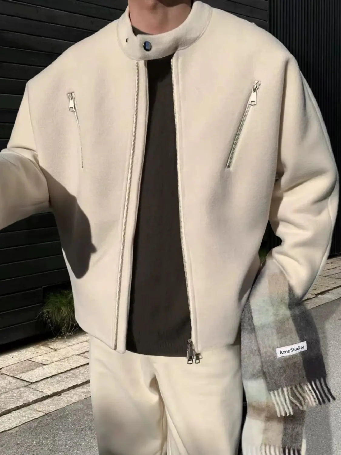 WIAOFELLAS - Retro white moonlight wool short jacket, American high street zipper woolen coat for men and women