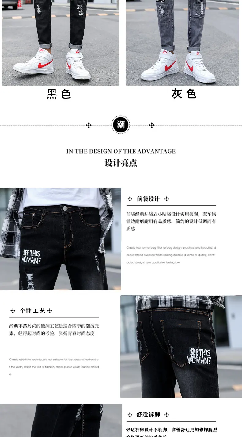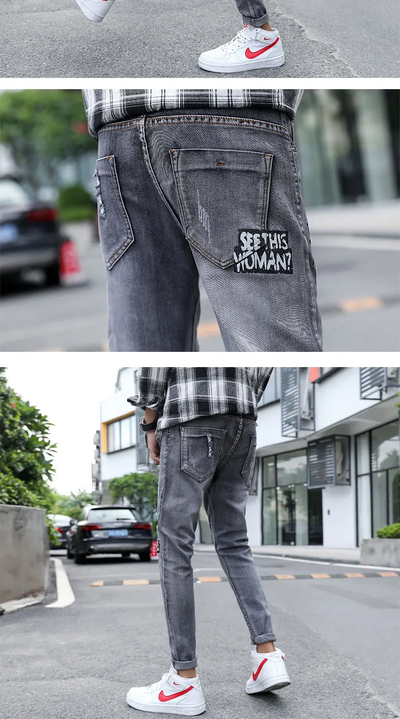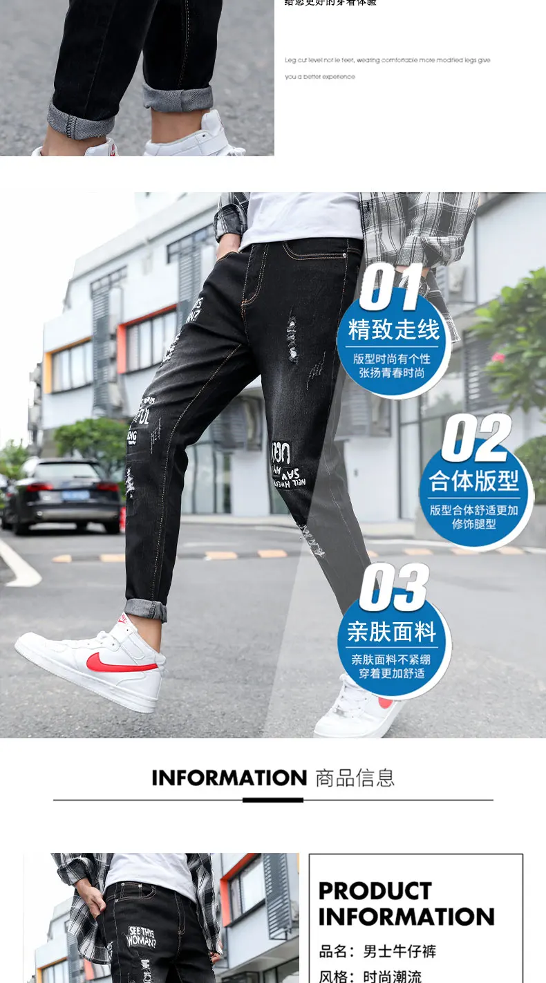 Wiaofellas Men’s Korea Ripped Denim Pants Beggar Style Printed Washed Ankle-length Pencil Jeans Men Fashion Print Jeans