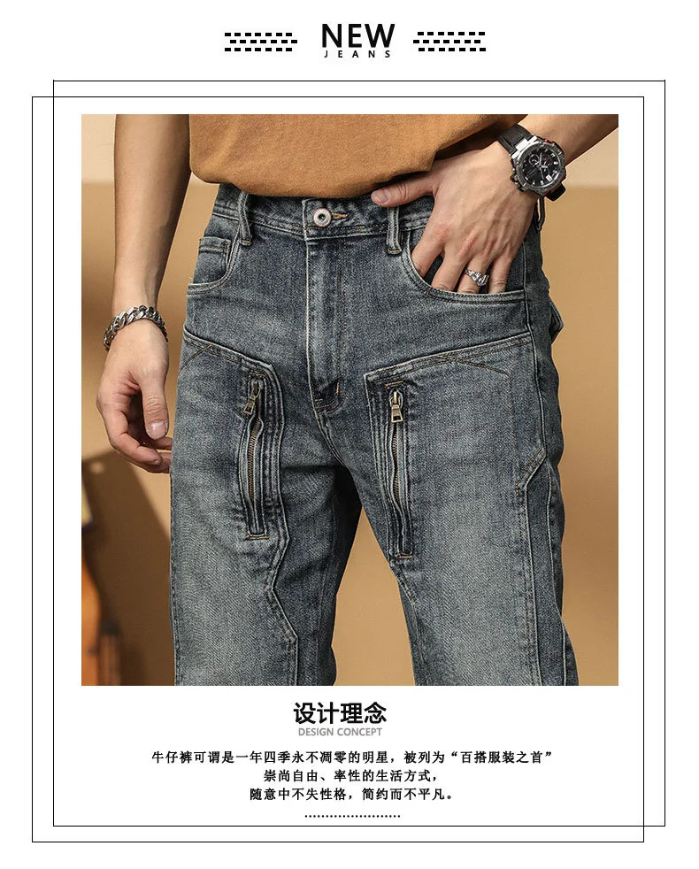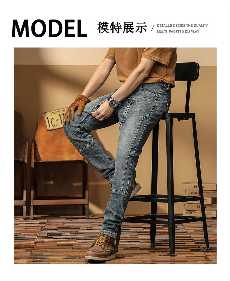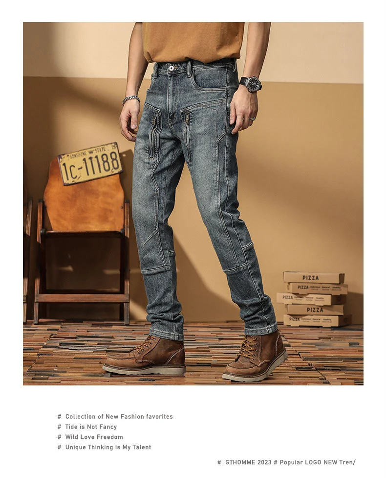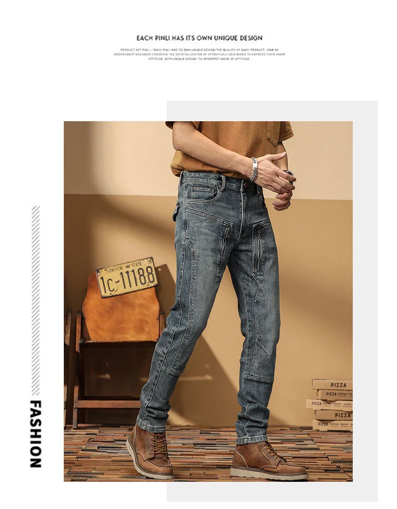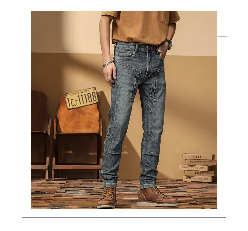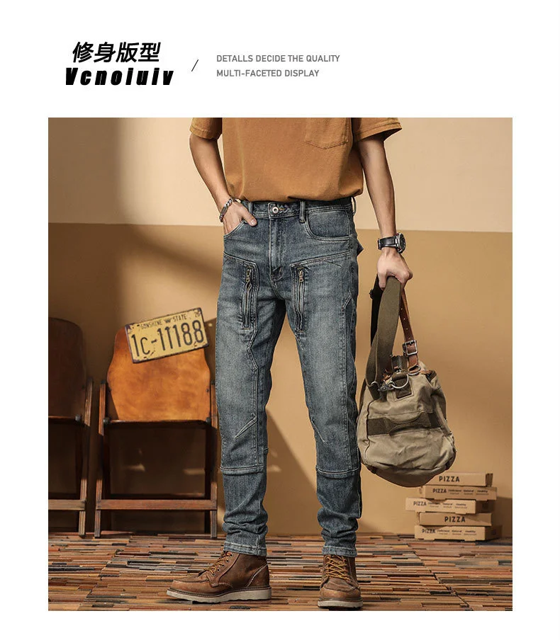 Wiaofellas Trendy Patchwork Zipper BLue Jeans Men Slim Biker Jeans Stretch Denim Slim Pants Men Clothing Casual Multi Pockets Hombres Jeans