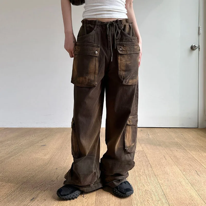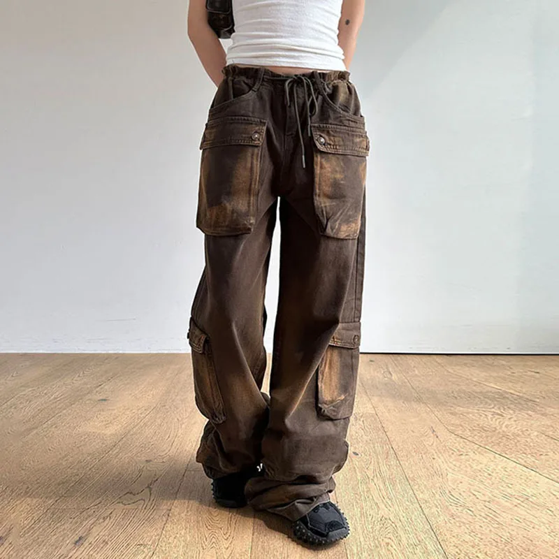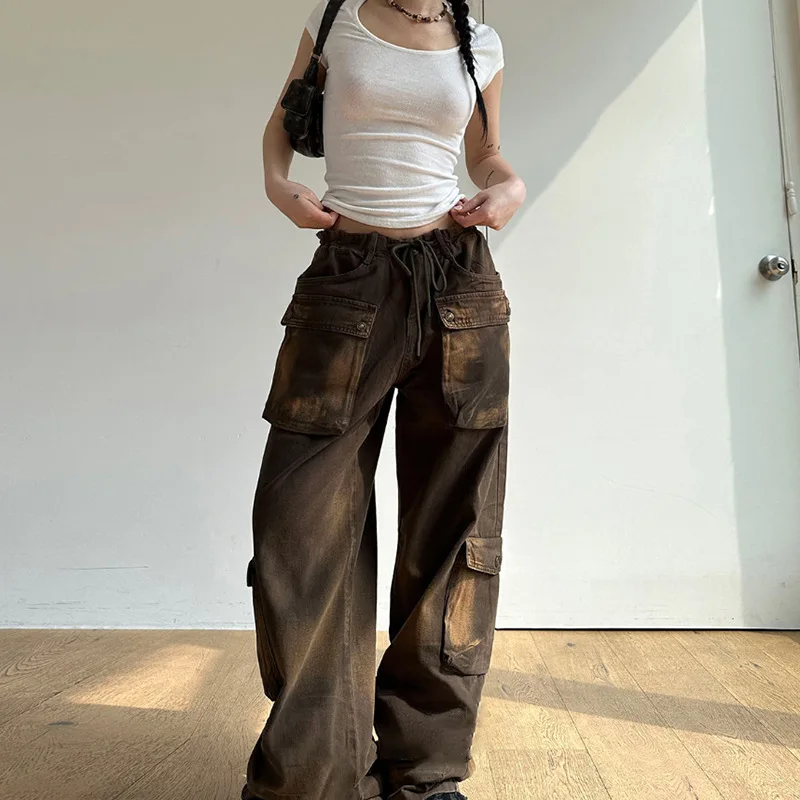 Wiaofellas Distressed Brown Wasteland Style Pocket Stitching Jeans Women Fashion Street Loose Low Waist Straight Leg Pants Y2k Pants