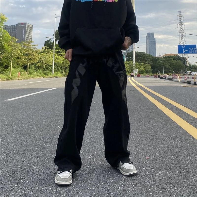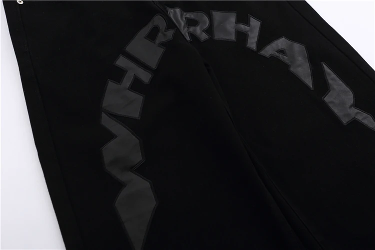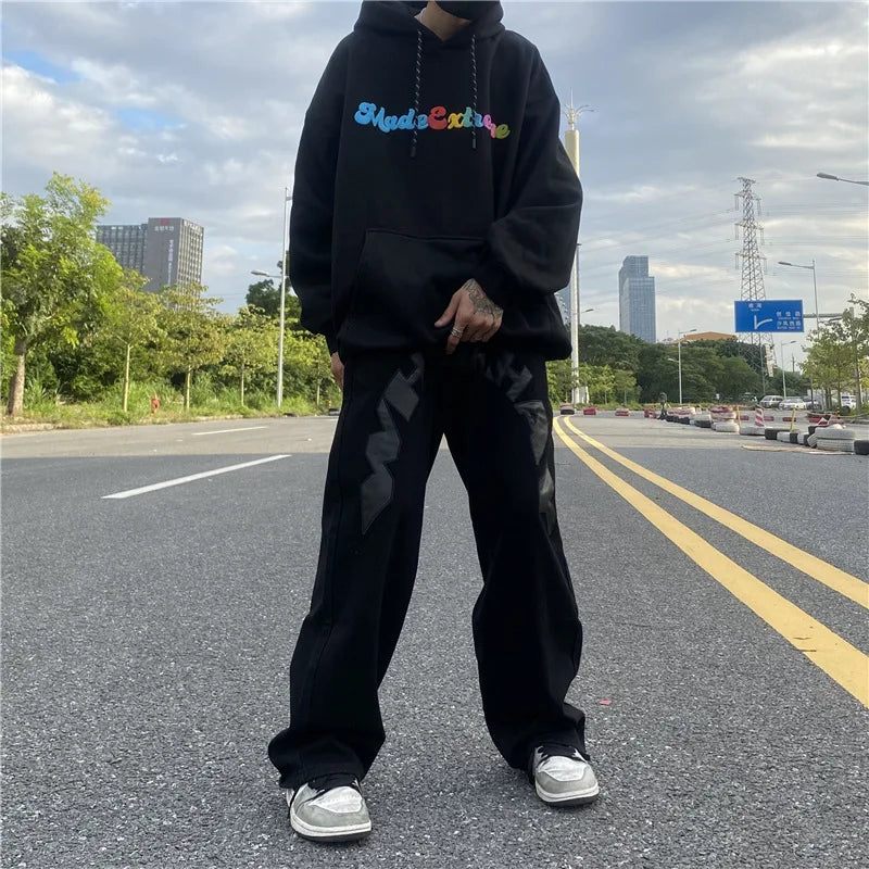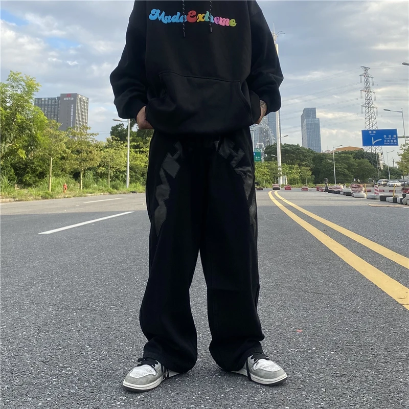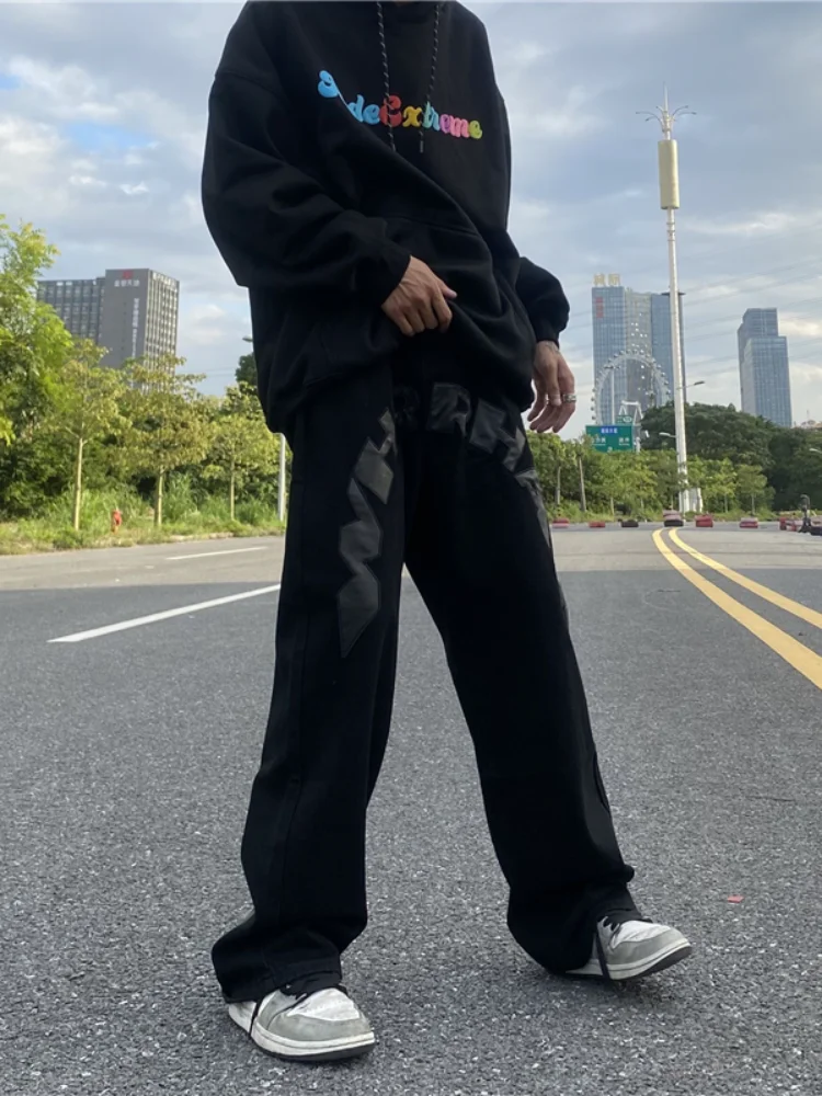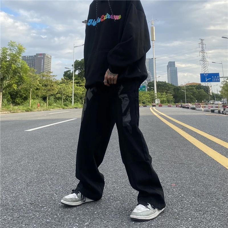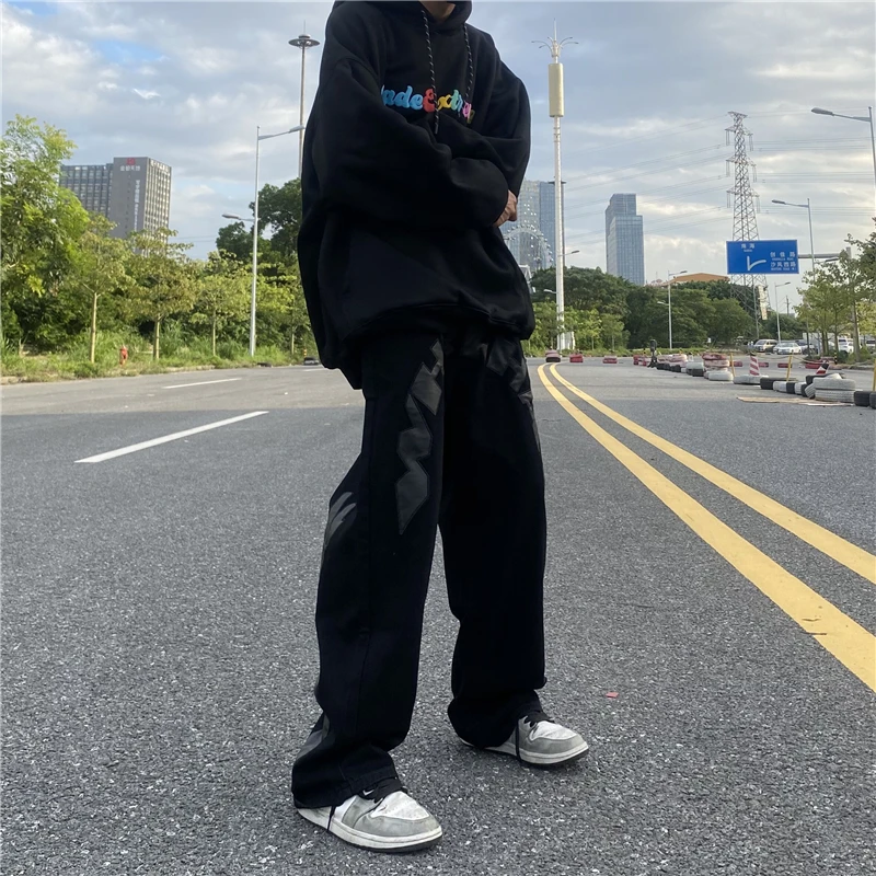 Wiaofellas - High Street Jeans Patch Letter Print Jeans Straight Leg Jeans Men's American Jeans Street Loose Wide Leg Pants