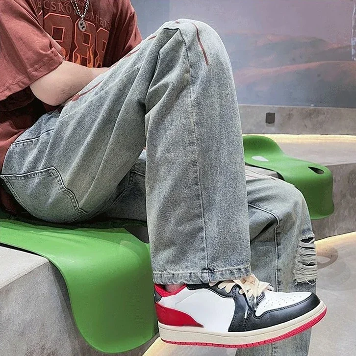 Wiaofellas - Jeans for Men Broken with Holes Trousers Straight Ripped Male Cowboy Pants Hip Hop Print Torn Stylish Soft Casual Fashion