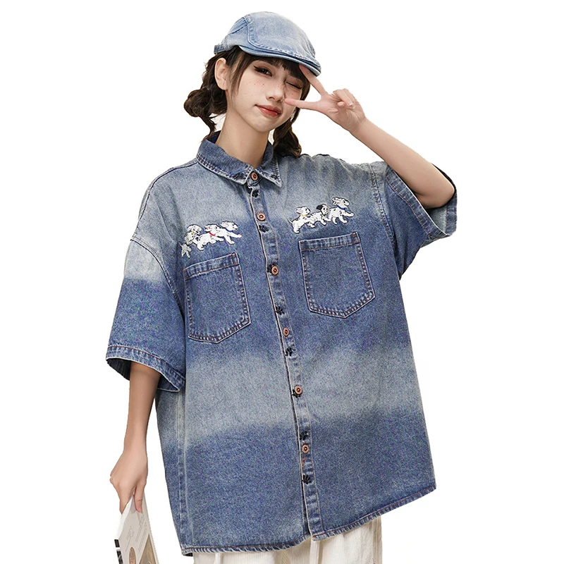 Wiaofellas  -  Men Denim Shirts Streetwear Harajuku Cartoon Embroiderey Short Sleeve ShirtS Fashion Hip Hop Fashion Casual Jean Button Up Coat