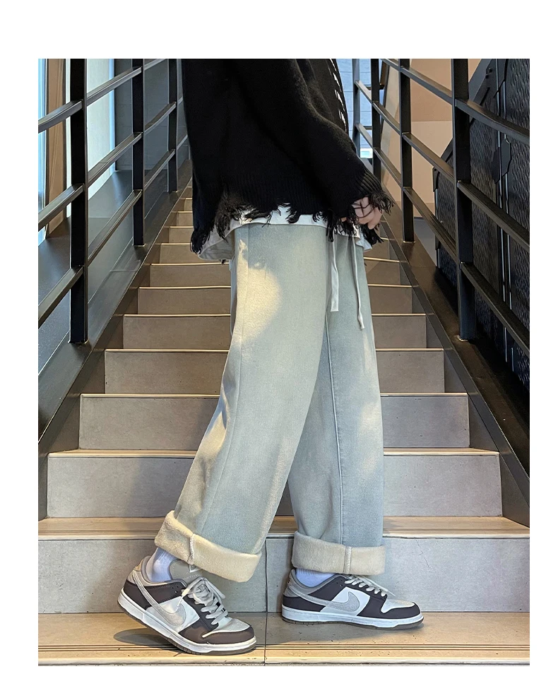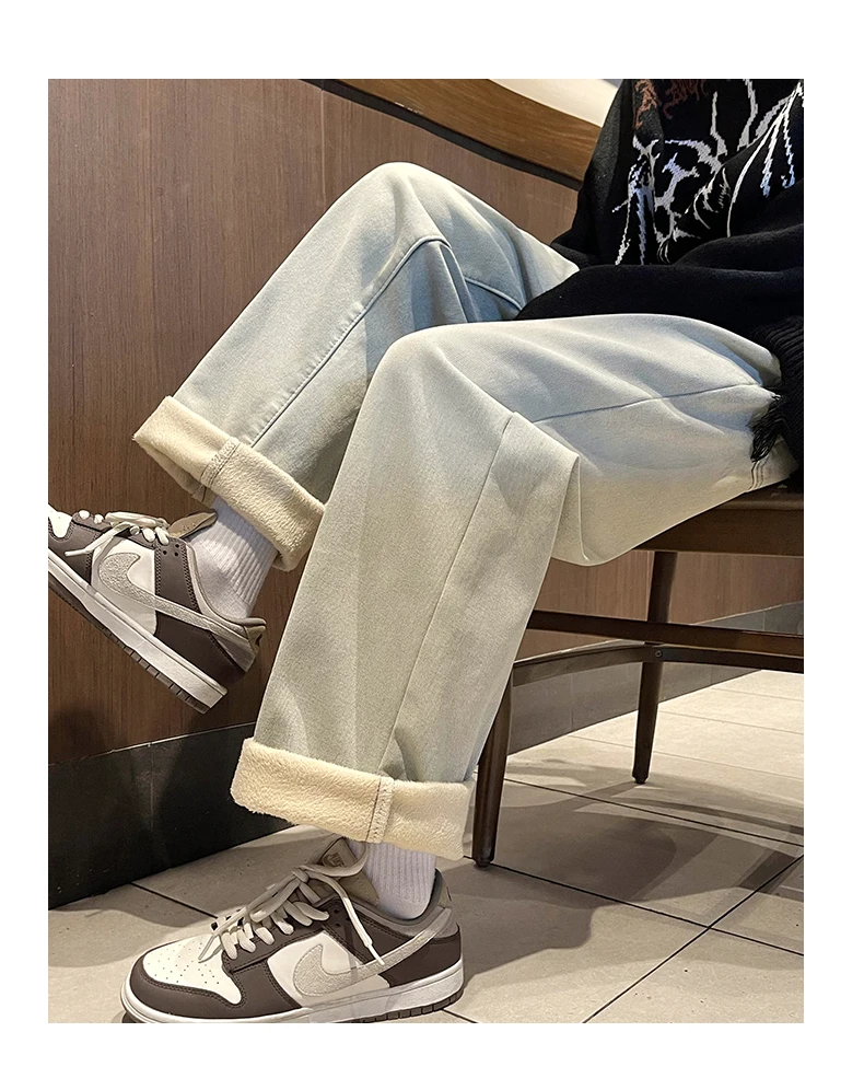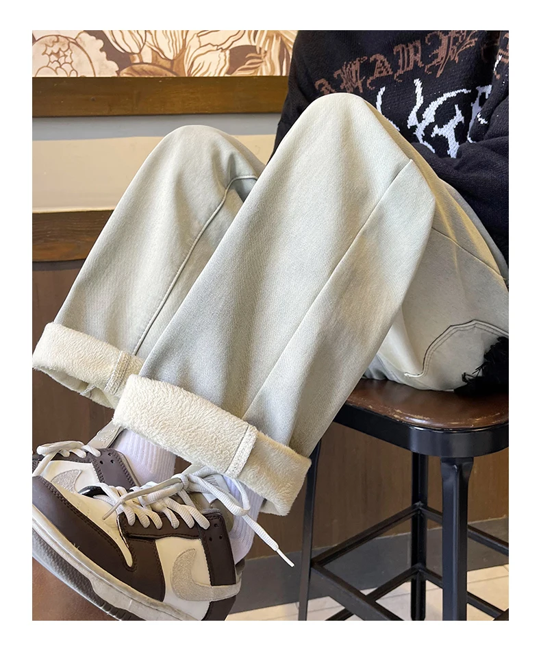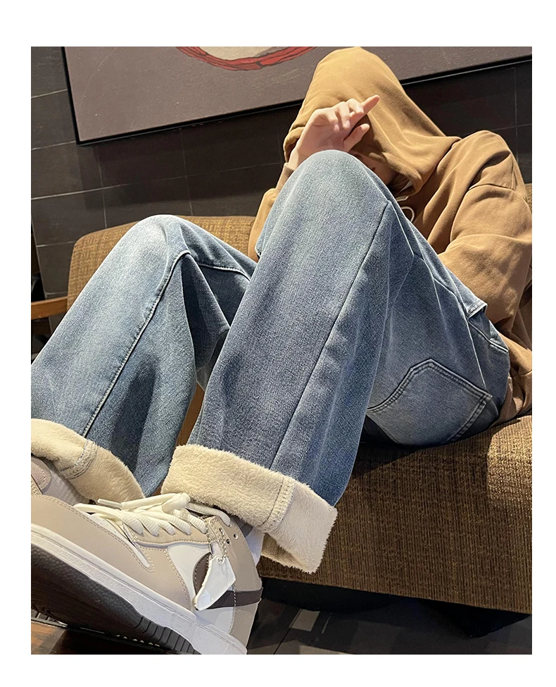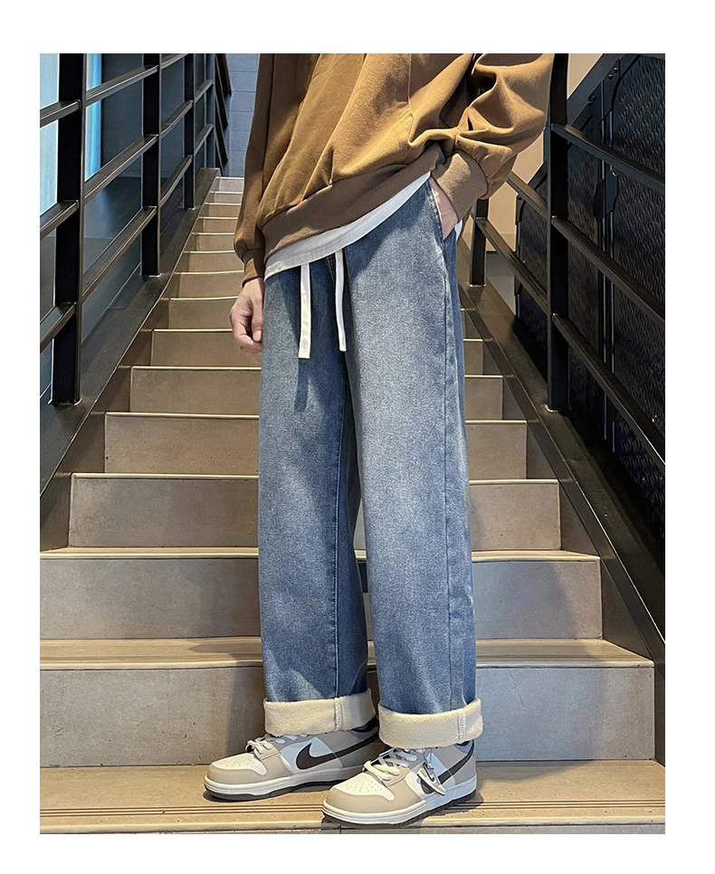 Wiaofellas - Men's Fleece Jeans Winter New Style Straight Tube Loose Wide Leg Pants Fashion Label High Street Elastic Waist Wool Pants