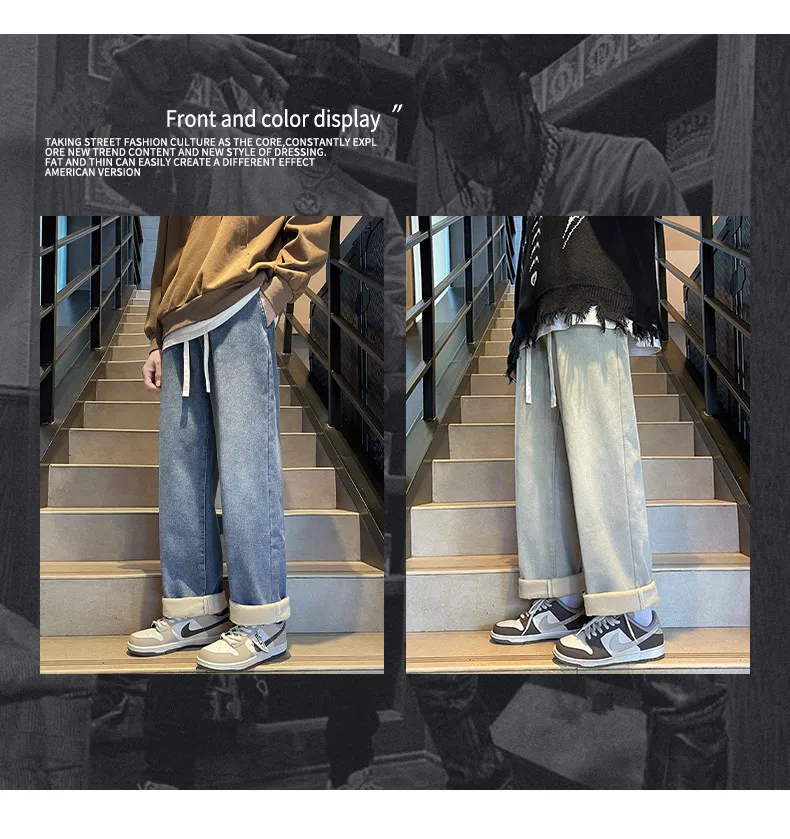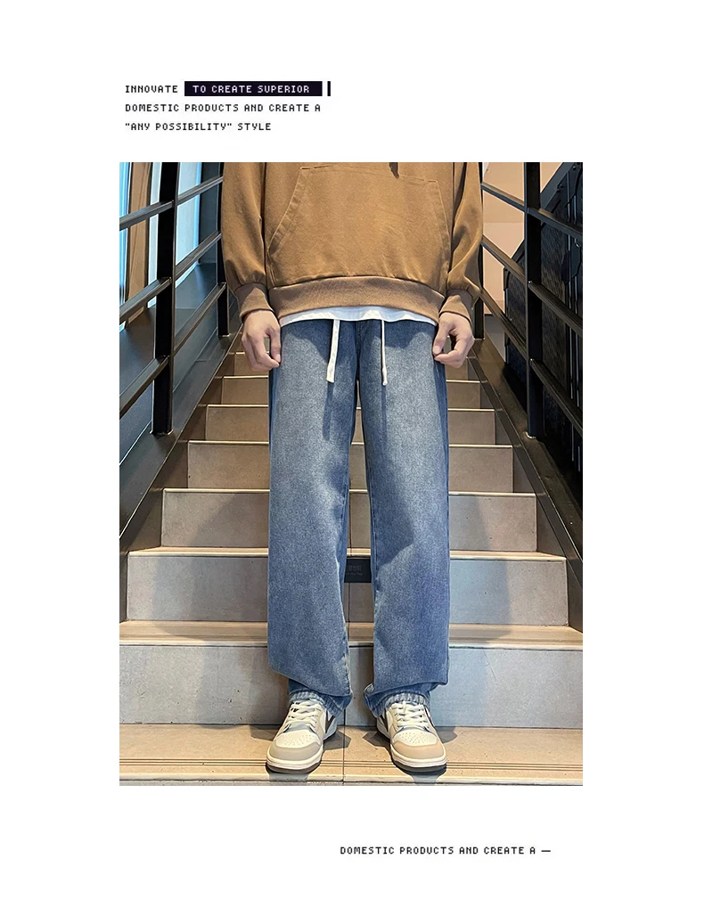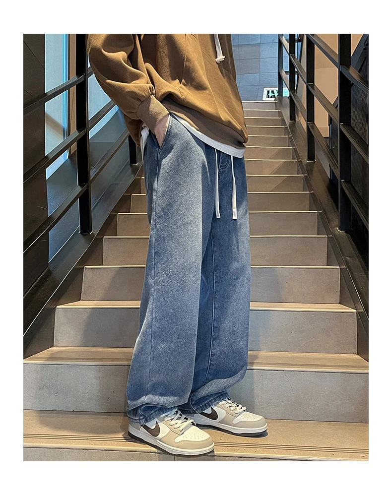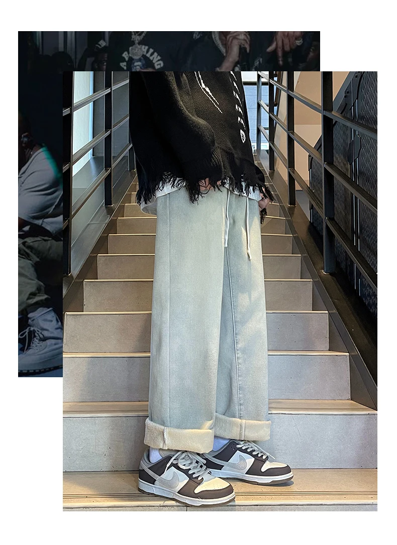 Wiaofellas - Men's Fleece Jeans Winter New Style Straight Tube Loose Wide Leg Pants Fashion Label High Street Elastic Waist Wool Pants