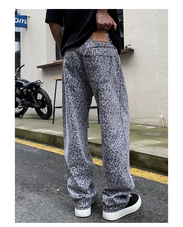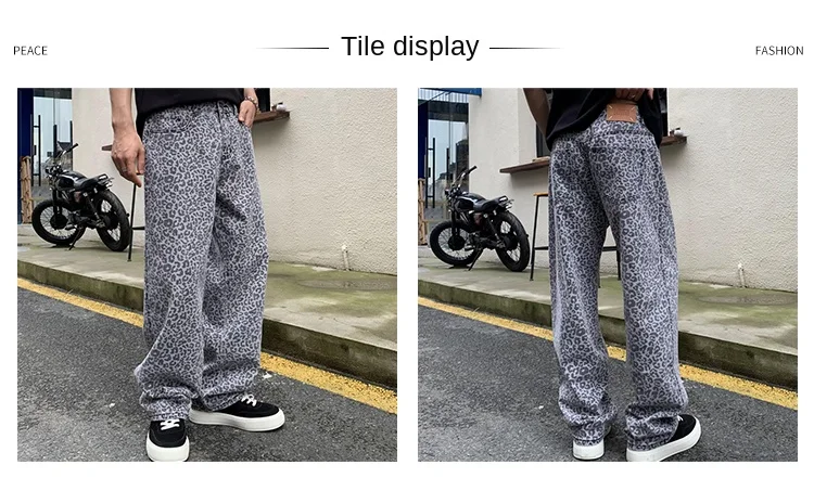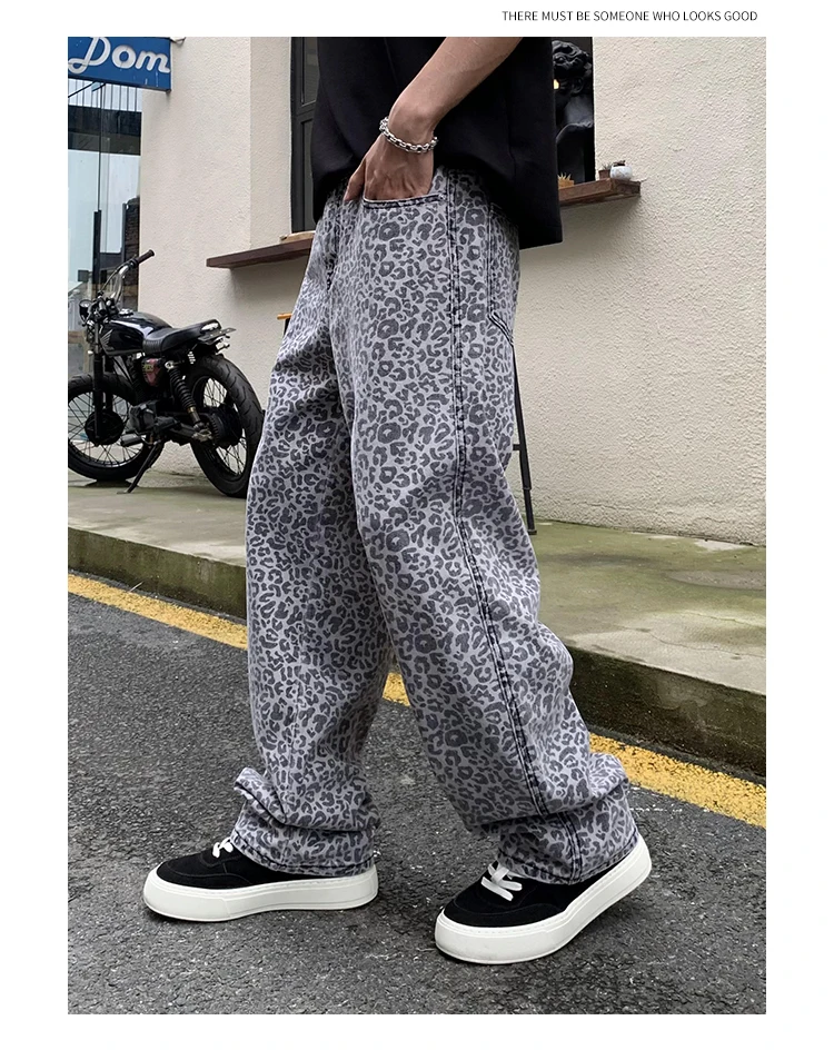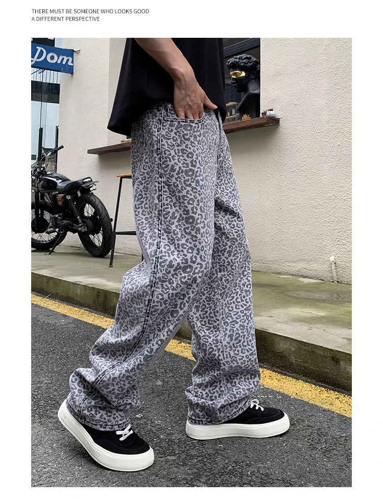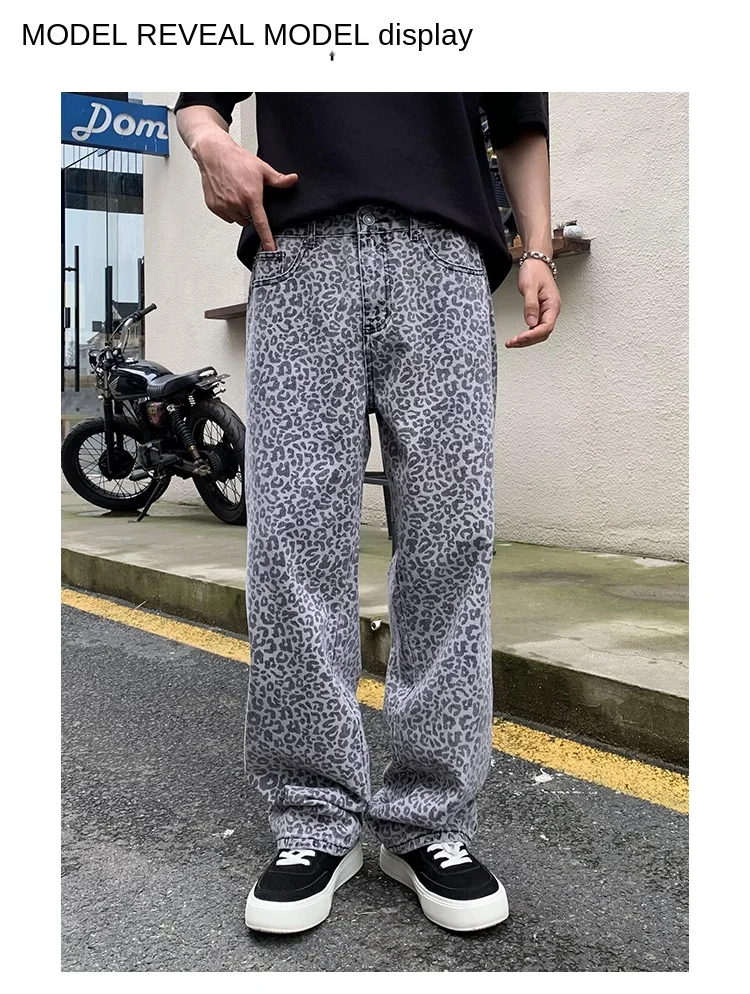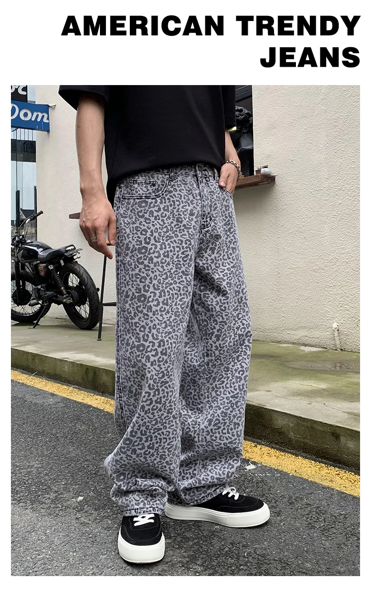 Wiaofellas  -  New high-end jeans for MEN'S FASHION street trend brand leopard print loose straight hip-hop casual washed neutral denim pants.