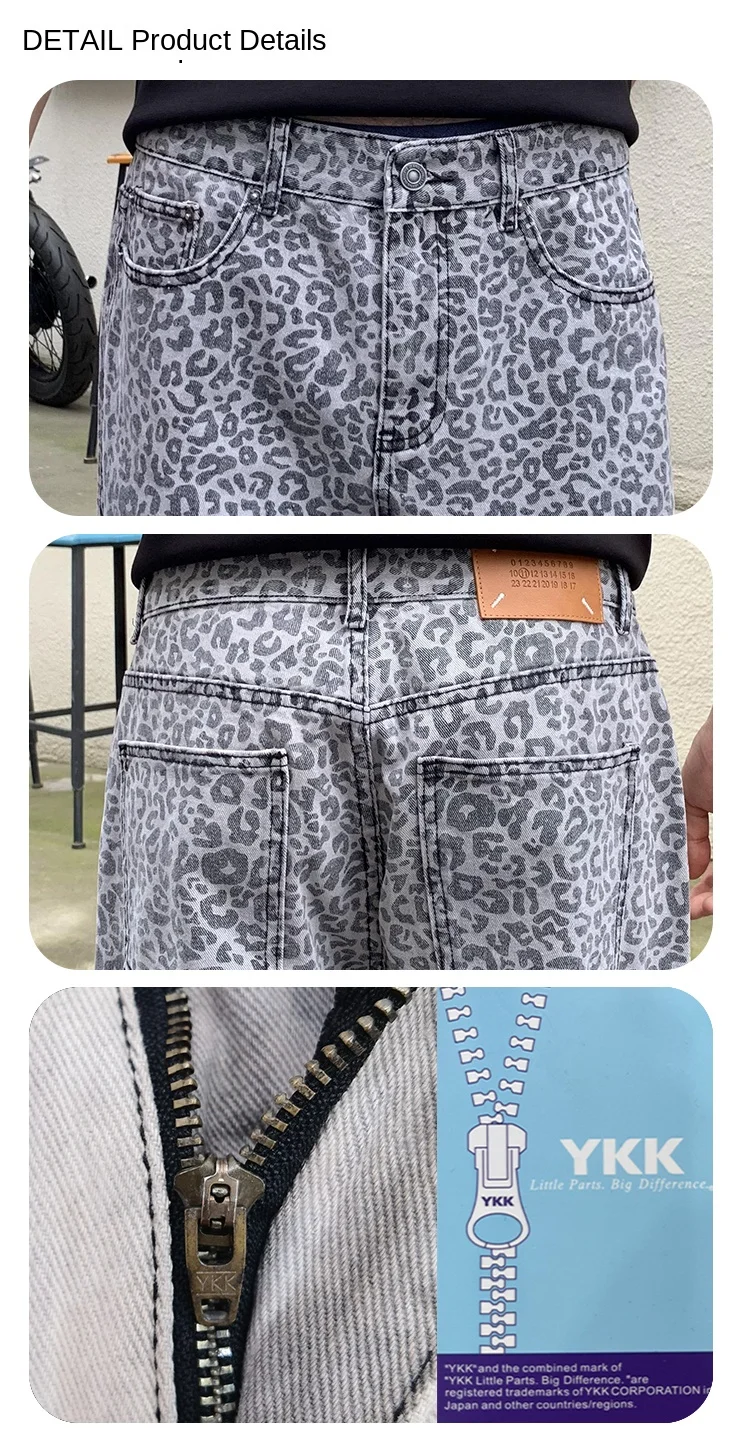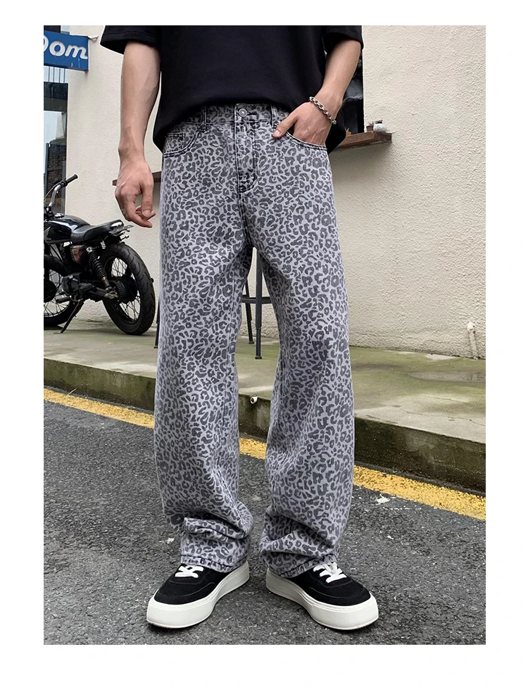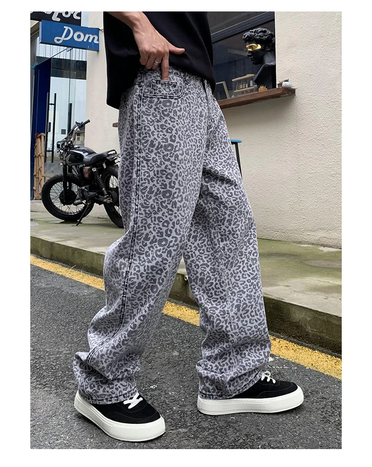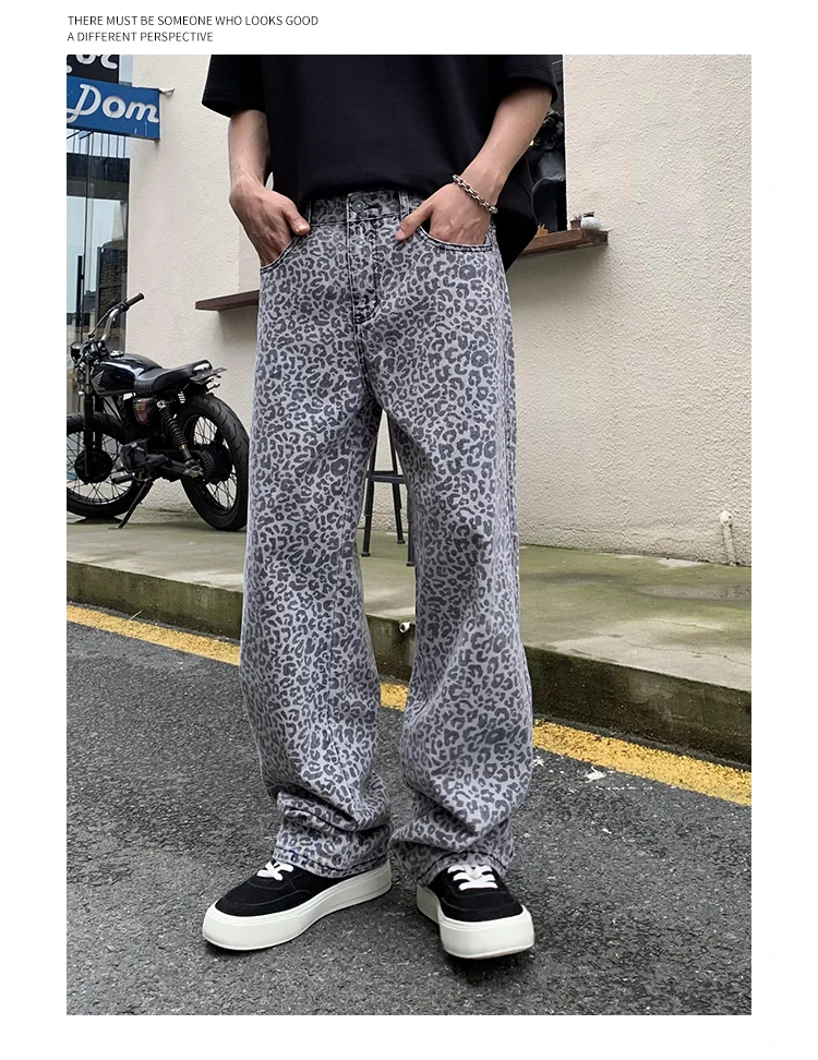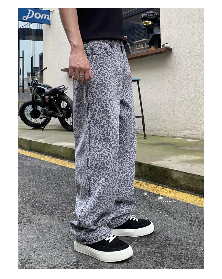 Wiaofellas  -  New high-end jeans for MEN'S FASHION street trend brand leopard print loose straight hip-hop casual washed neutral denim pants.