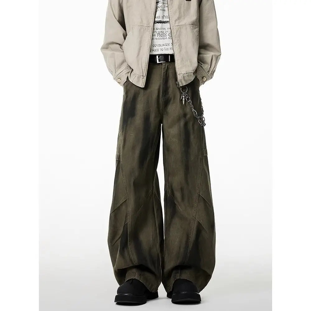 WIAOFELLAS - American retro washing jeans scimitar casual men's trendy brand pleated loose wide-leg work pants