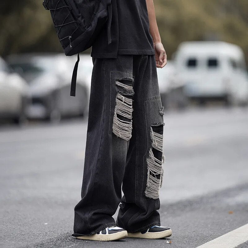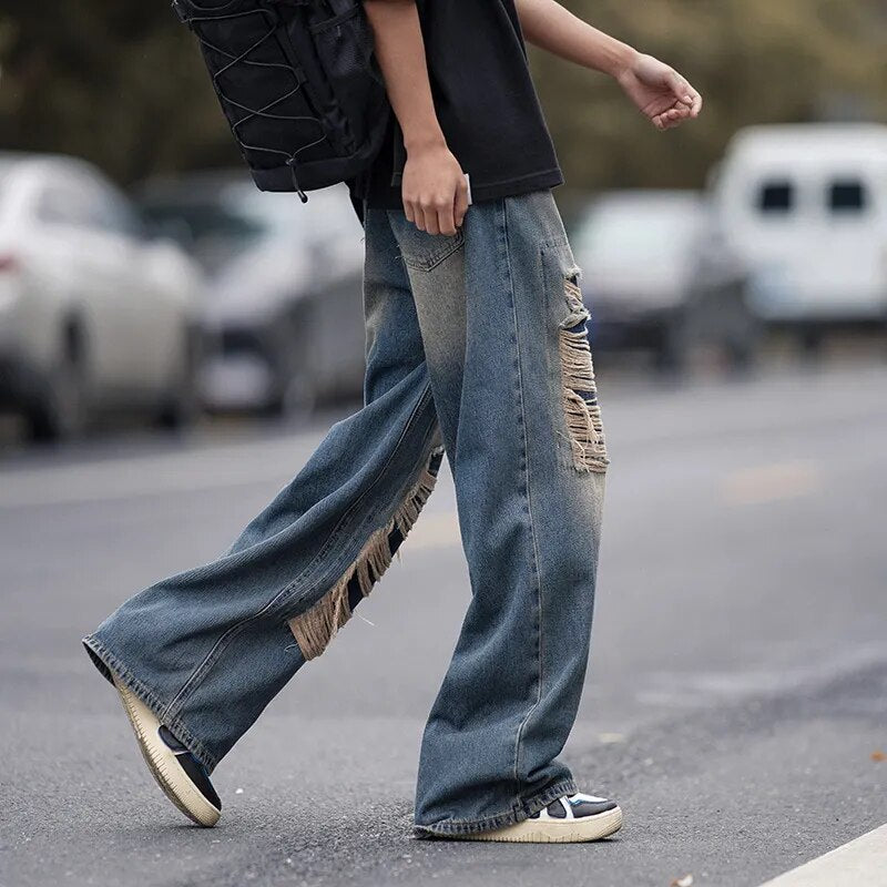 Wiaofellas American style torn jeans, men's summer washed and worn-out, loose fitting wide leg straight tube mop, trendy high street pants