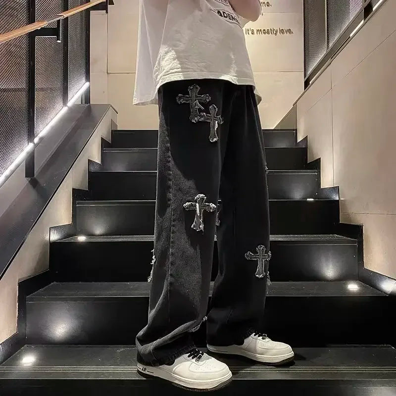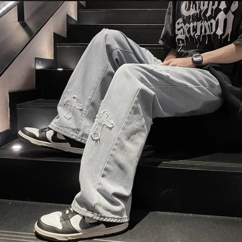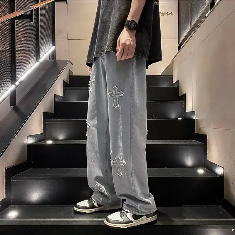 WIAOFELLAS  -  Autumn High Street Cross Jeans Men Punk Denim Trousers Wash Vintage Hiphop Straight Tube Loose Wide Leg Pants