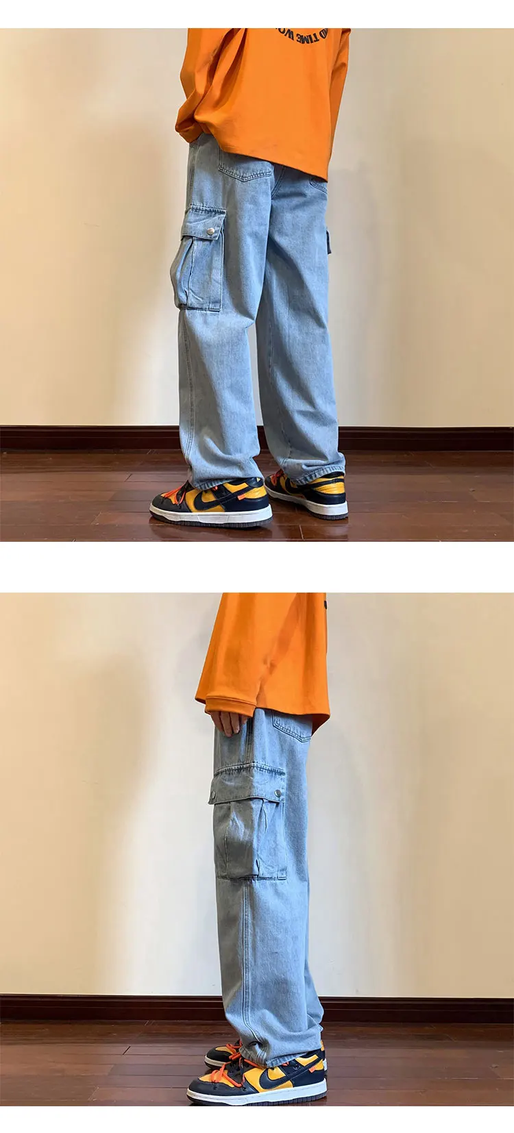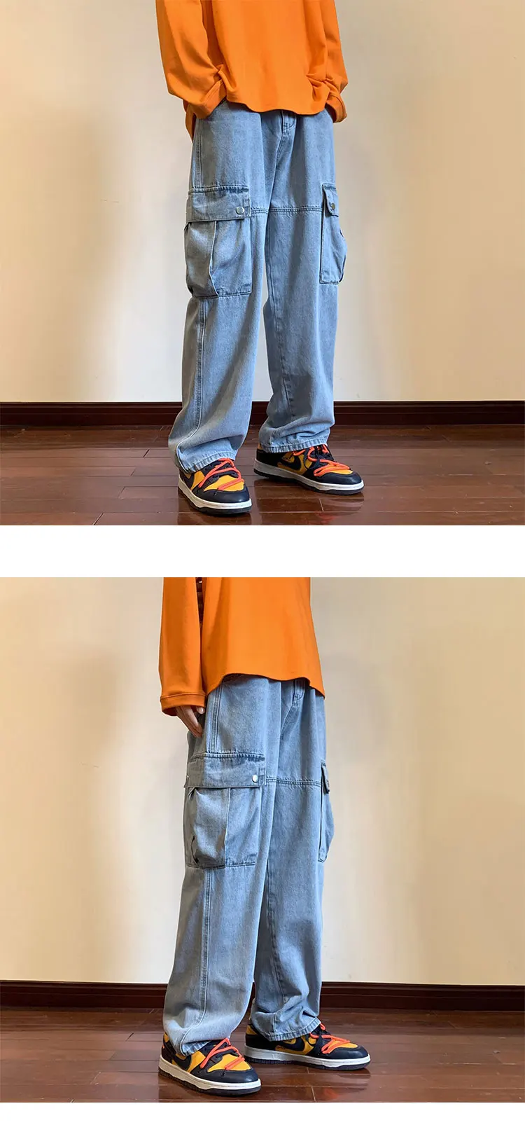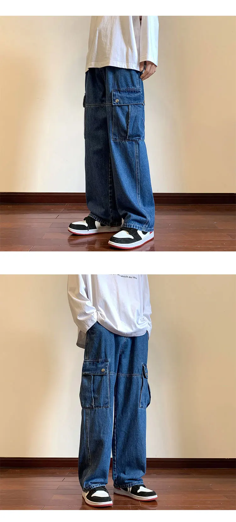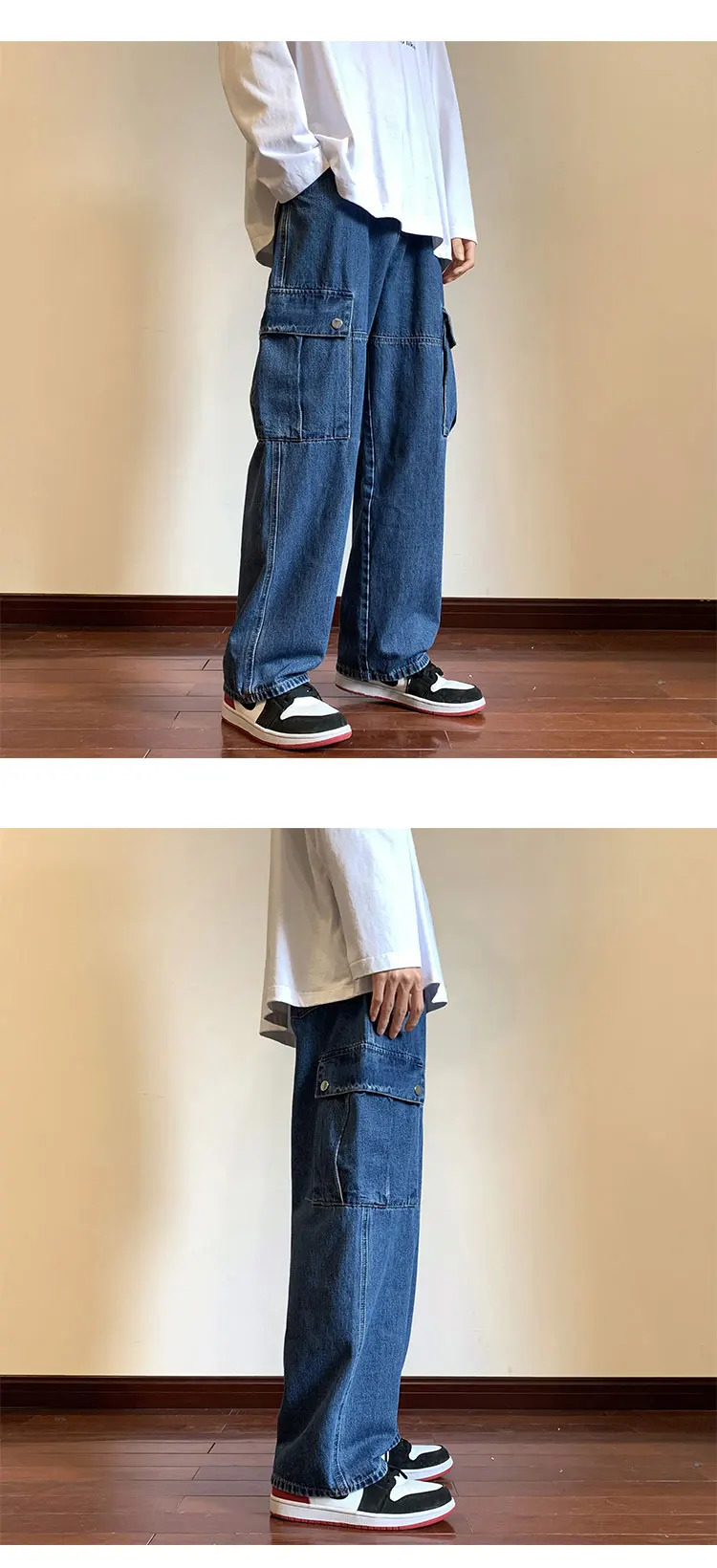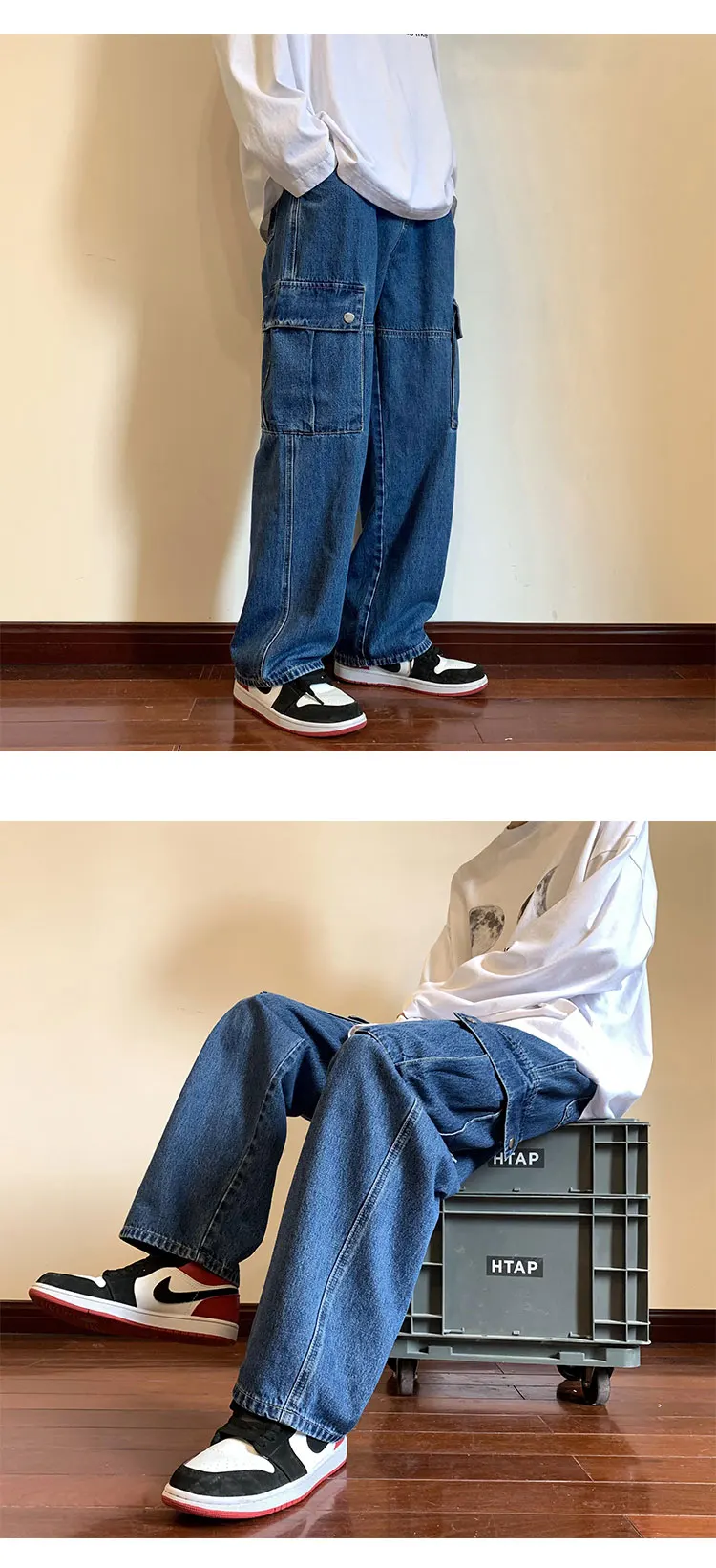 Wiaofellas Blue Black Baggy Jeans Men Fashion Pocket Cargo Jeans Men Japanese Streetwear Hip-hop Loose Straight Denim Pants Mens Trousers