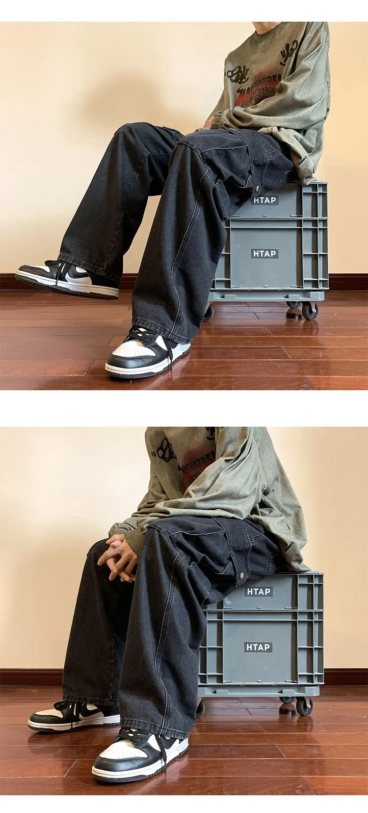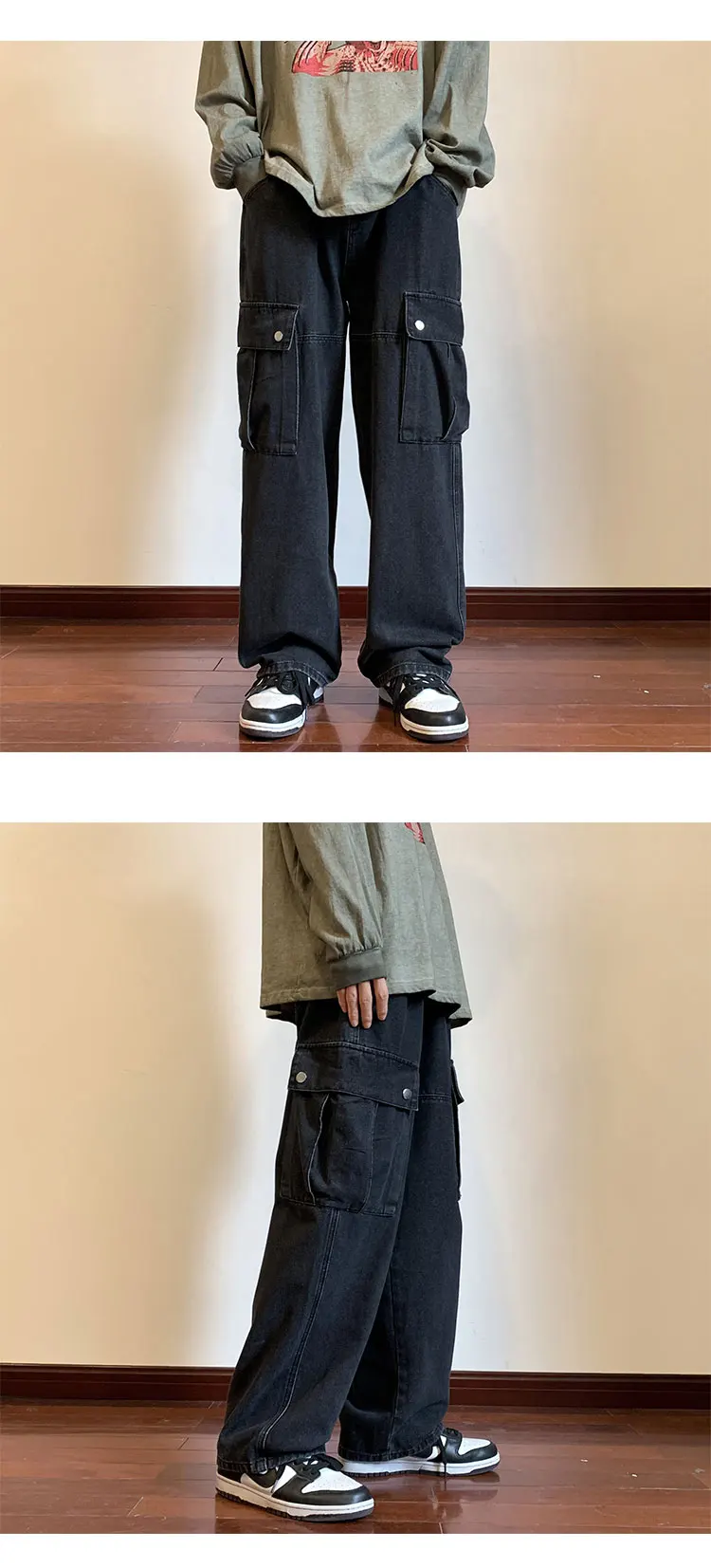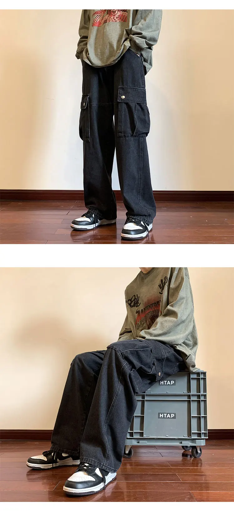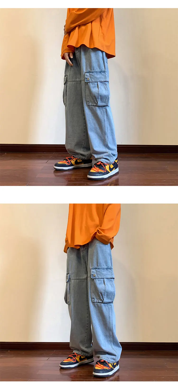 Wiaofellas Blue Black Baggy Jeans Men Fashion Pocket Cargo Jeans Men Japanese Streetwear Hip-hop Loose Straight Denim Pants Mens Trousers