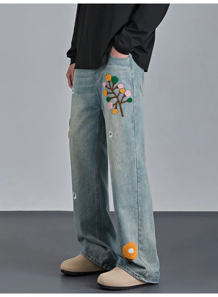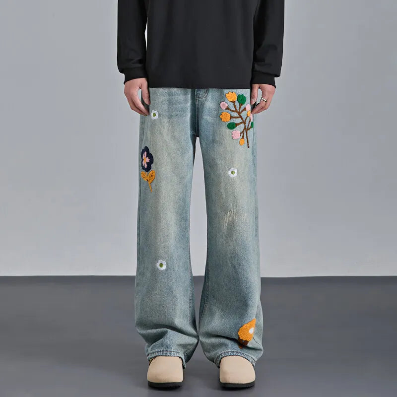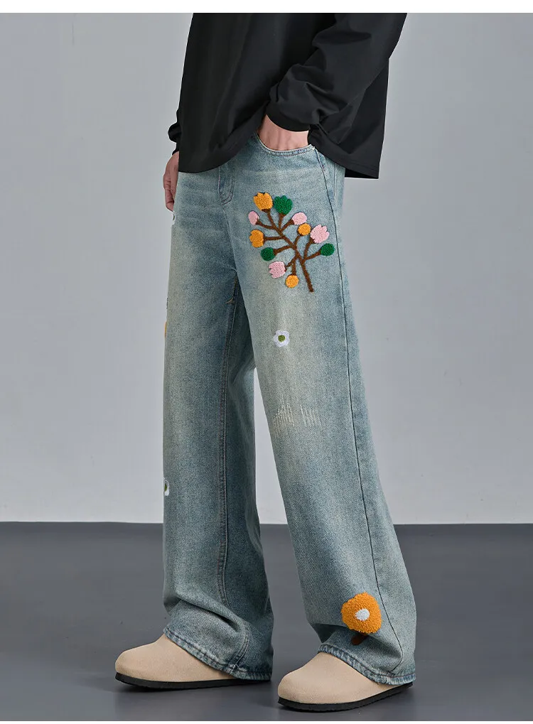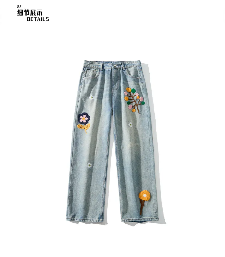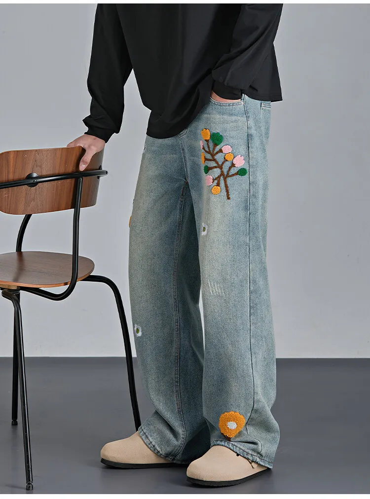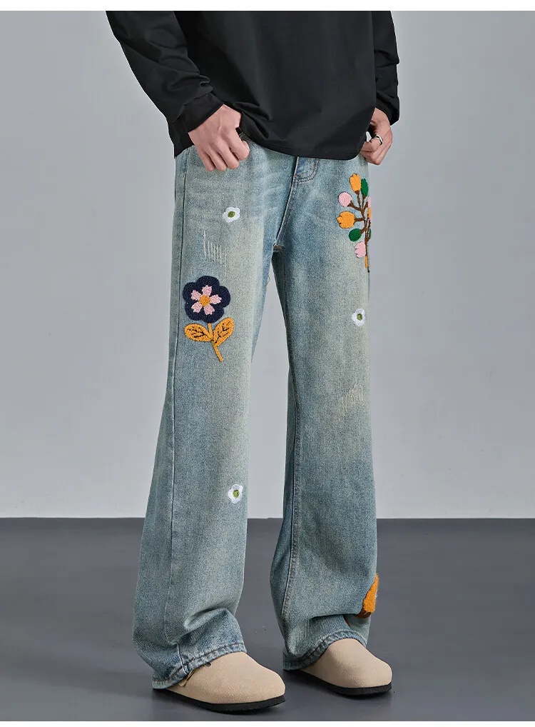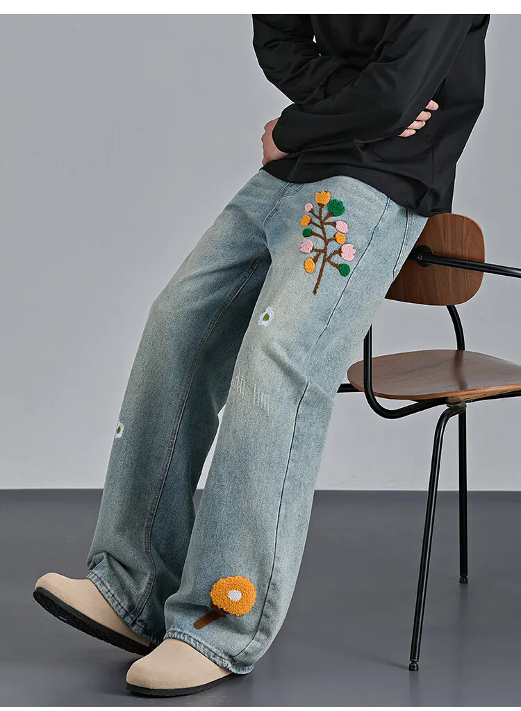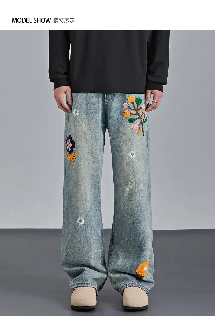WIAOFELLAS - Design sense flower embroidery wash jeans men's spring straight pants couple loose American pants