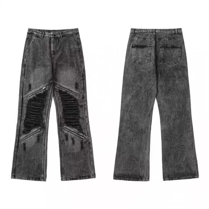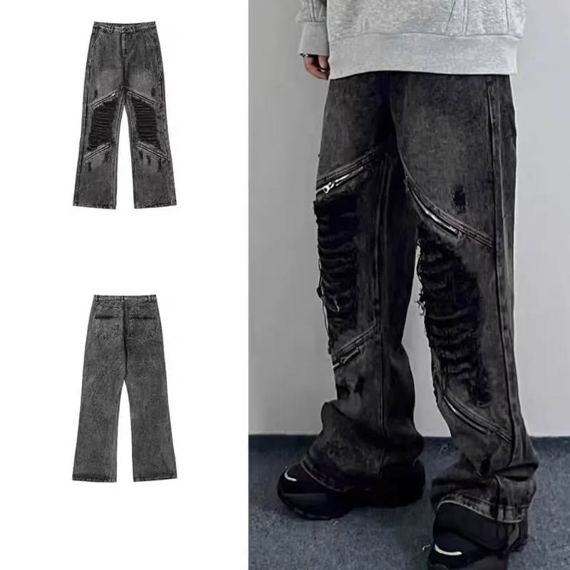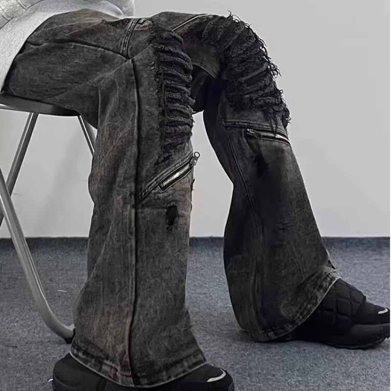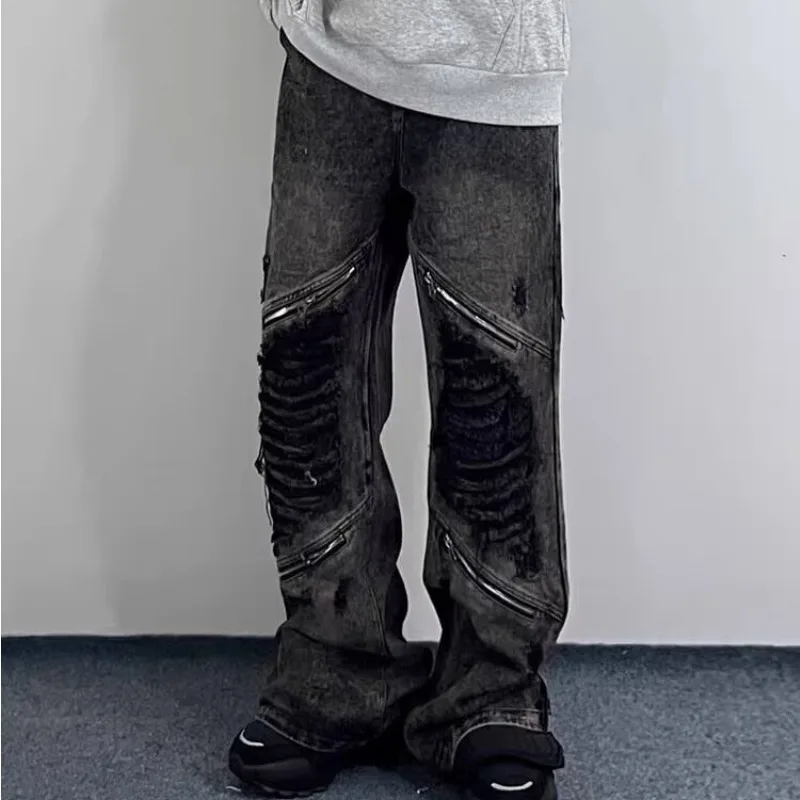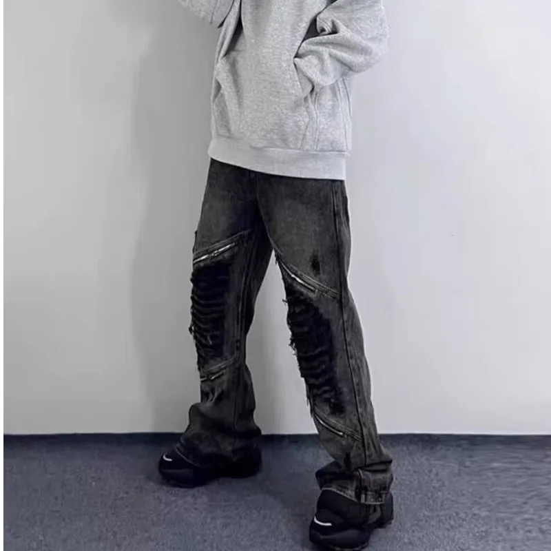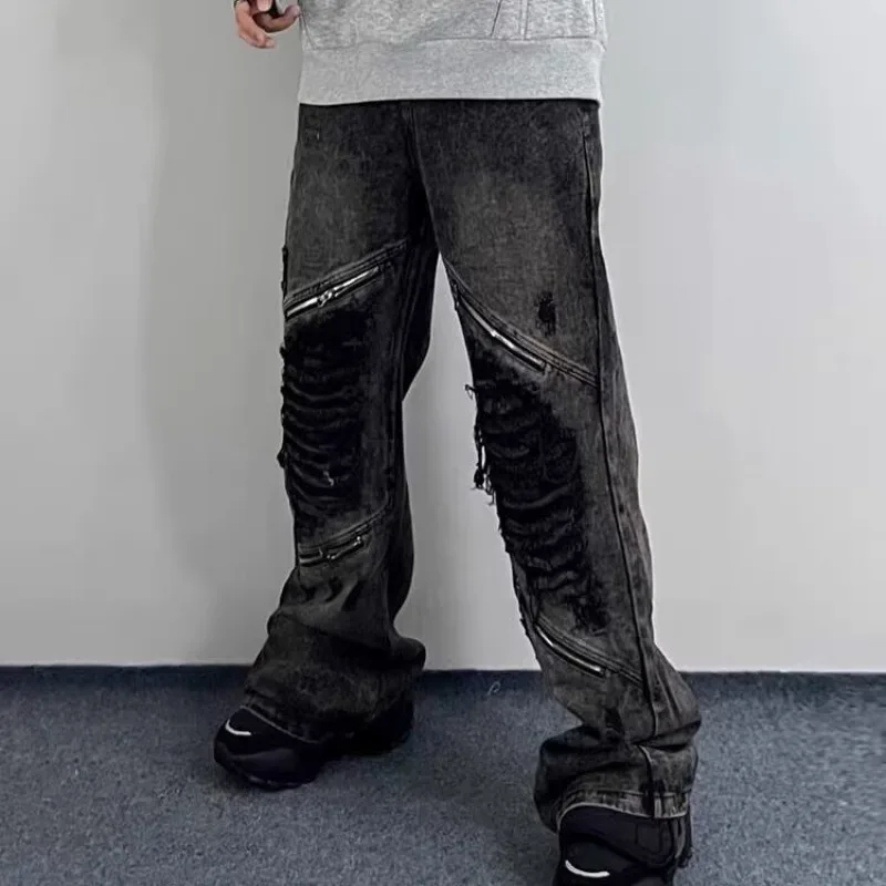 Wiaofellas - Grunge Clothes Y2K Streetwear Washed Black Baggy Ripped Stacked Jeans Pants For Men Kanye Old Luxury Hip Hop Loose Trousers