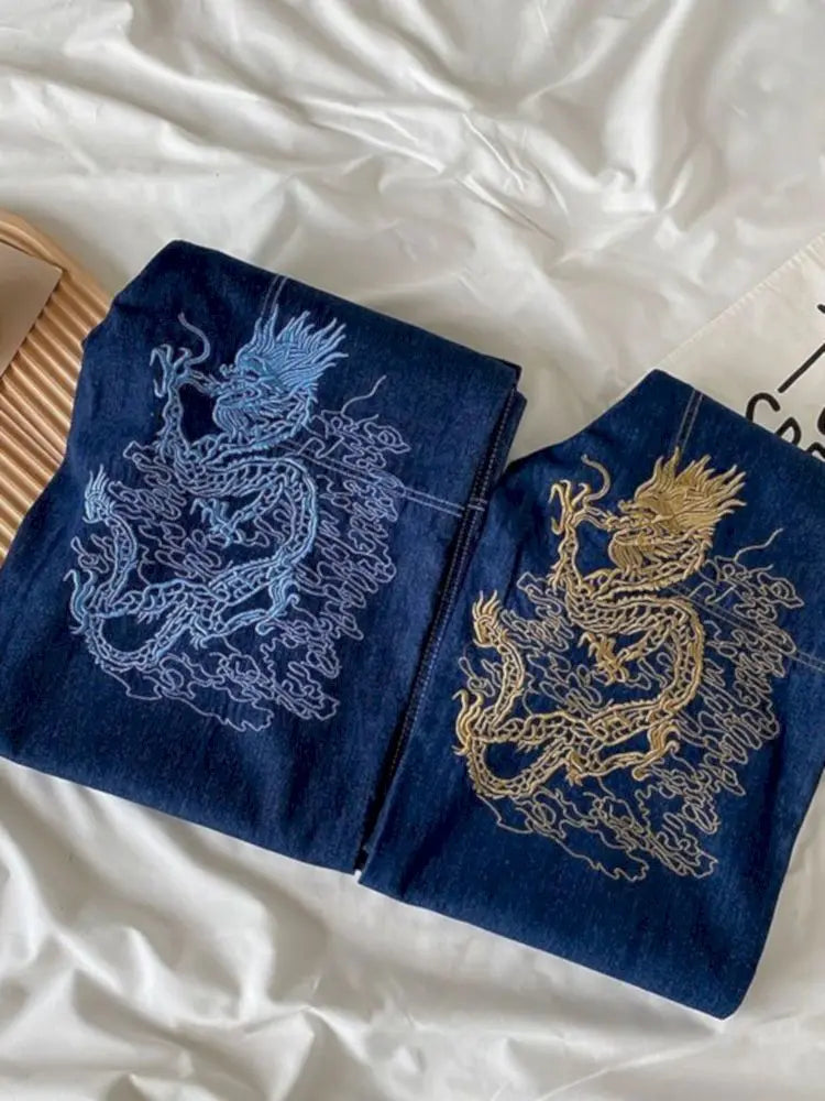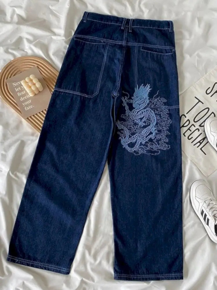WIAOFELLAS - Jeans Men Women Designer Dragon Pattern Embroidered Trousers Versatile Trend Loose Wide Leg Pants Men Boyfriend Jeans