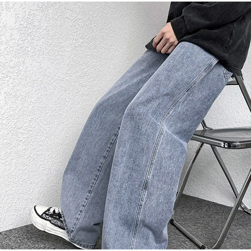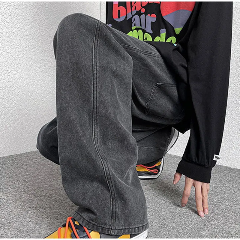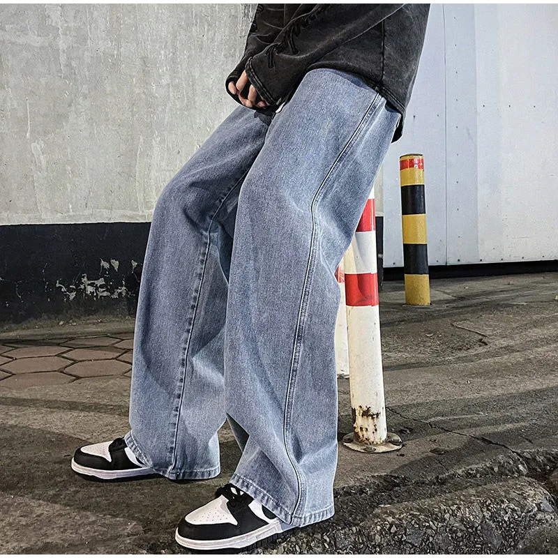 Wiaofellas - Jeans Men's Fashion Brand Spring Autumn Loose Straight Wide Leg Trousers Male High Street Casual Pocket Drawstring Denim Pants