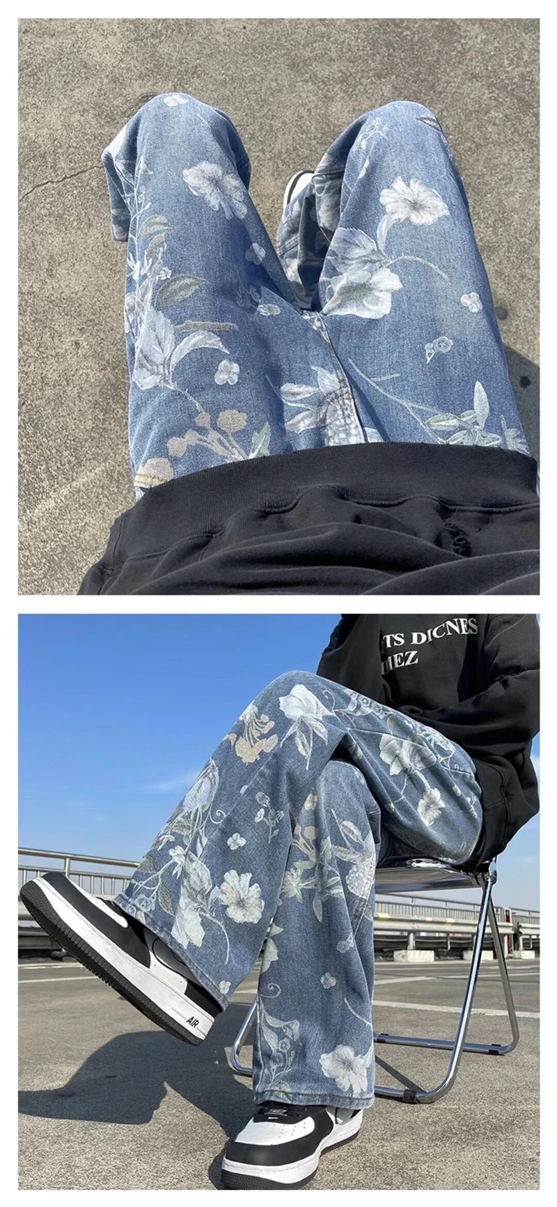 Wiaofellas - Korean Style Mens Fashion Blue Printed Jeans Spring New Floral Denim Pants High Street Loose Straight Couples Trousers