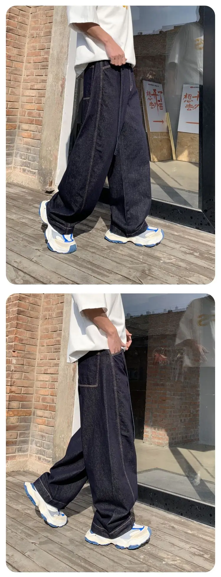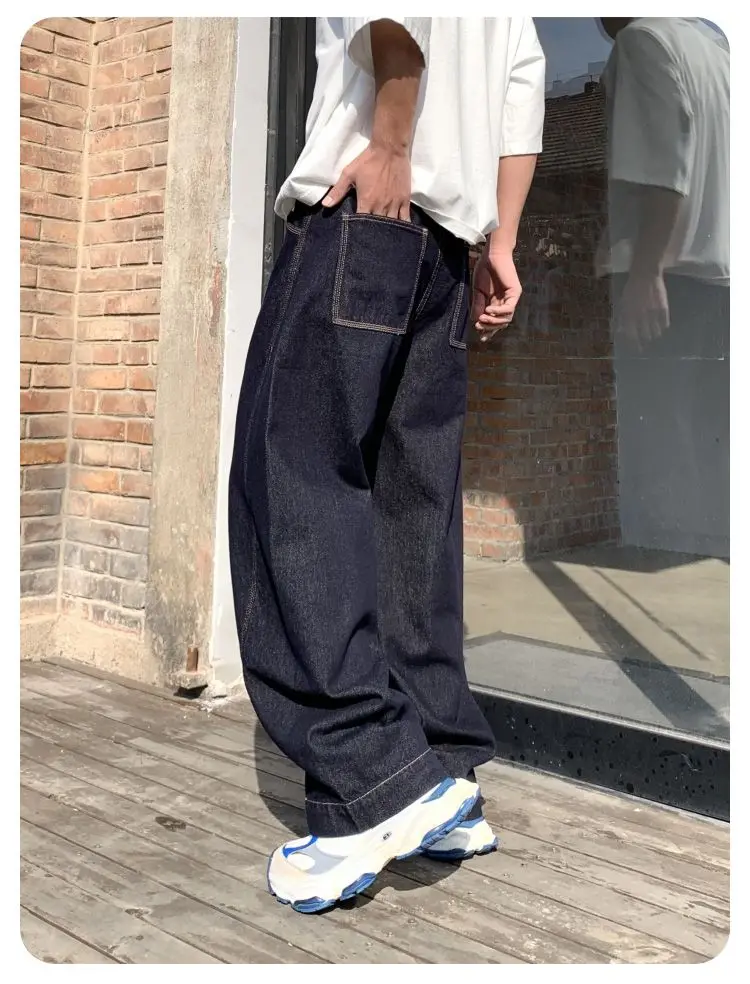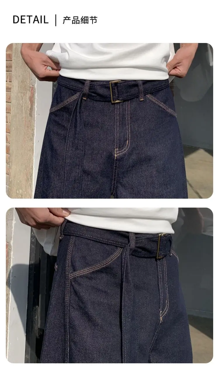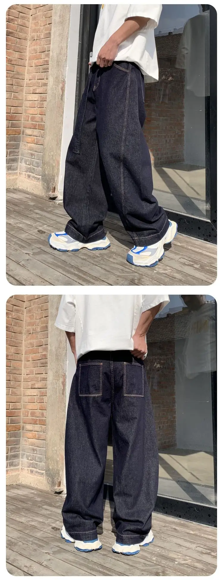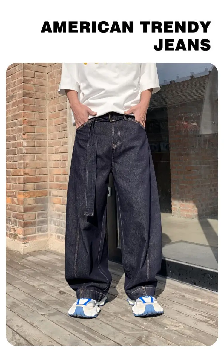 WIAOFELLAS - Latest Style Dark Blue Belted Jeans Men Loosen Fit Pure Color Denim Pants Male's Bagyy Trousers