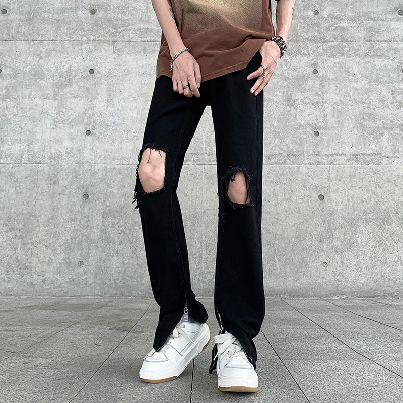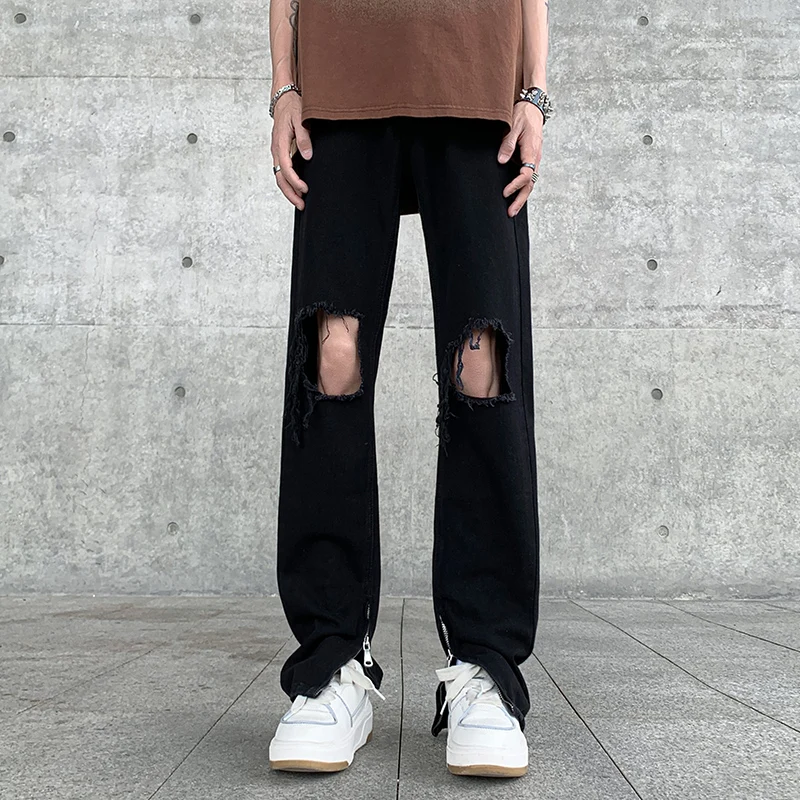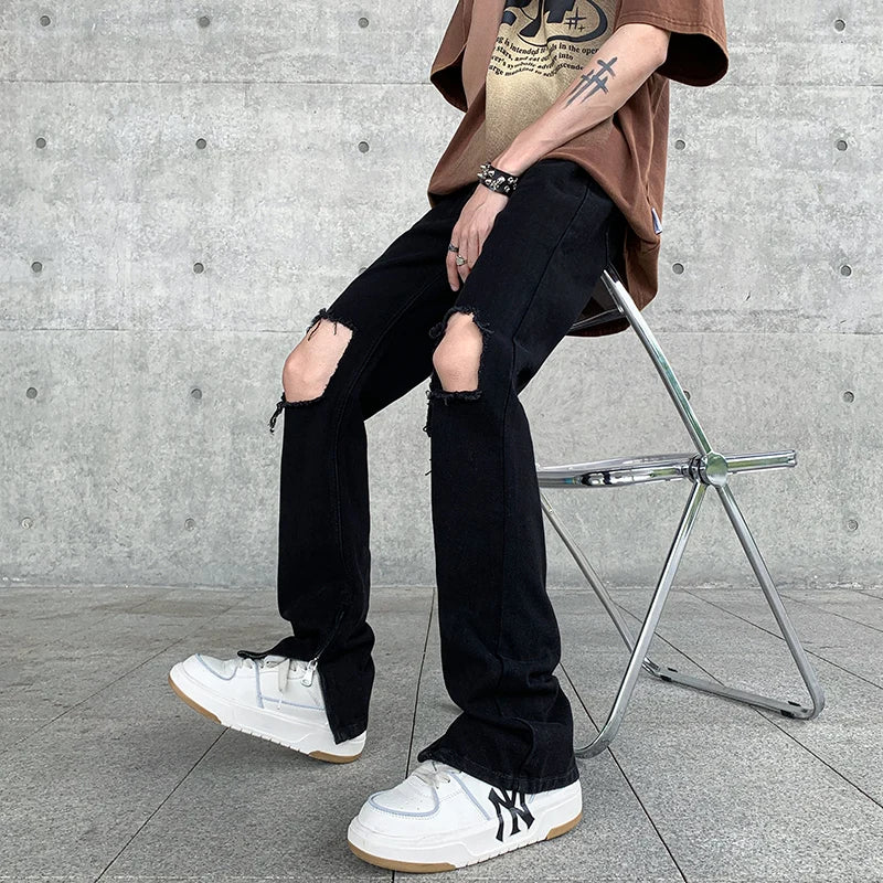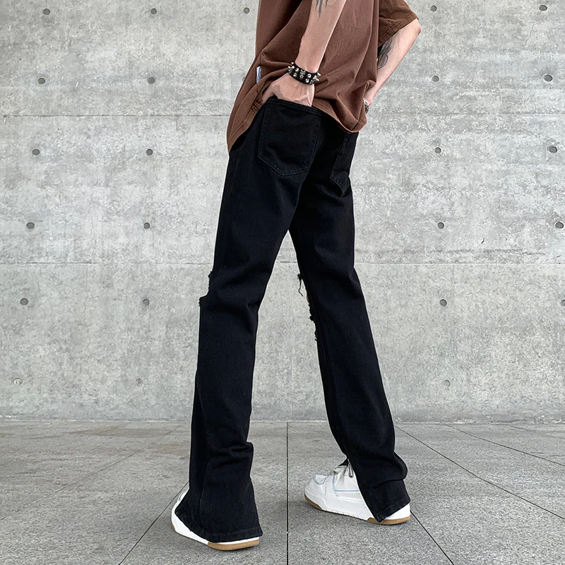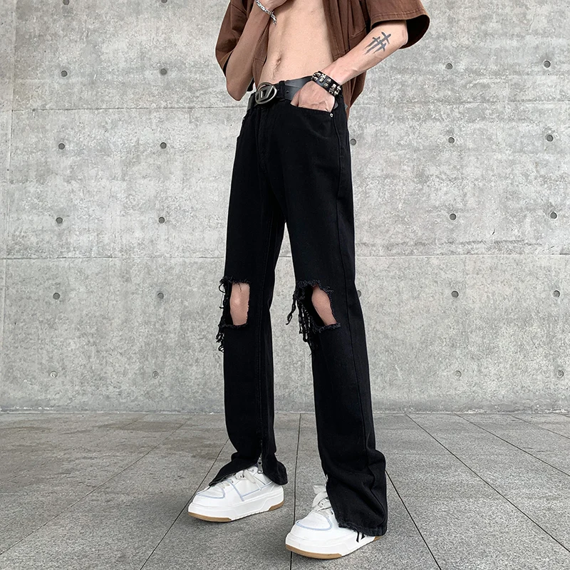 WIAOFELLAS - Men's Clothing Solid Color Button Zipper Pockets Hole Distressed Casual Spring Autumn Jeans Trousers Cargo Boot Cut Pants