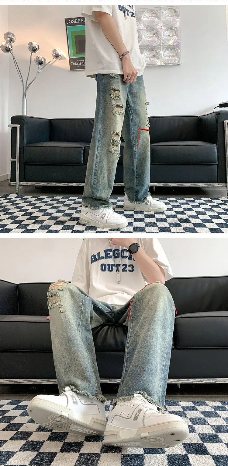 Wiaofellas Men's Jeans Y2K High Street Retro Loose Washed Ripped American Summer Straight Long Pants