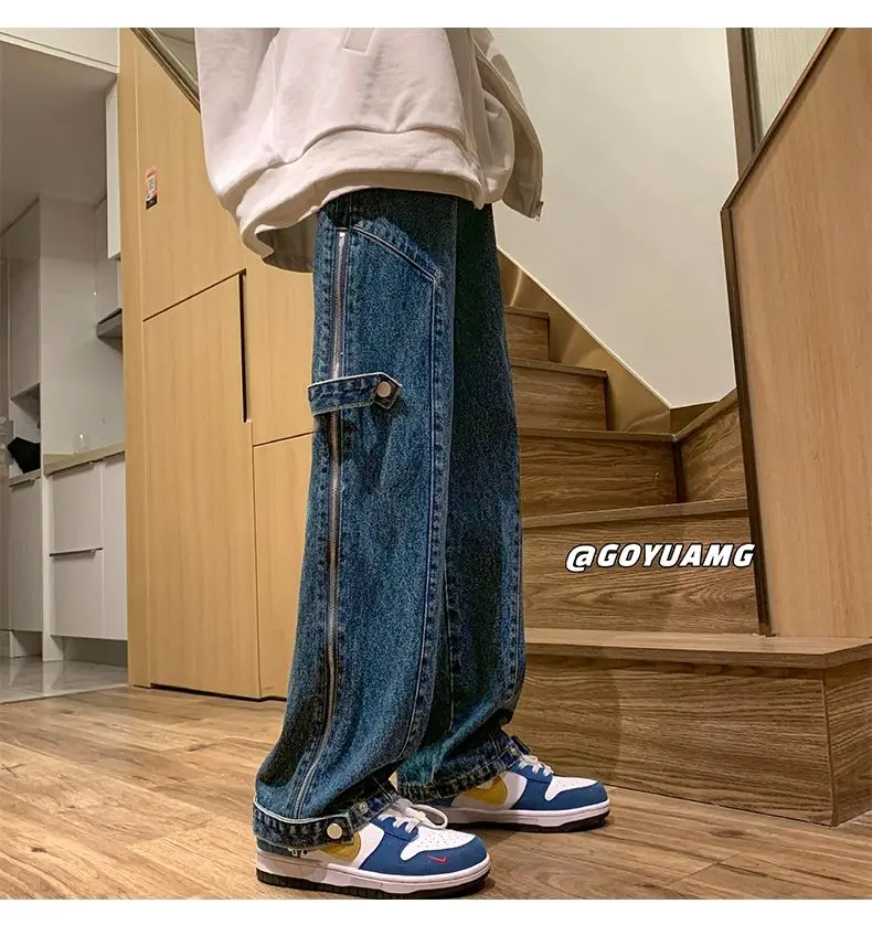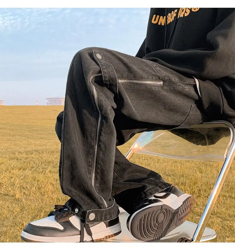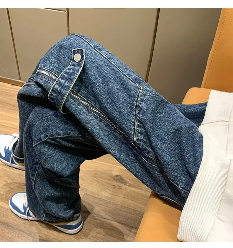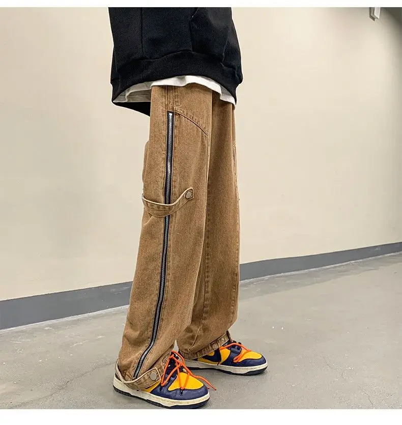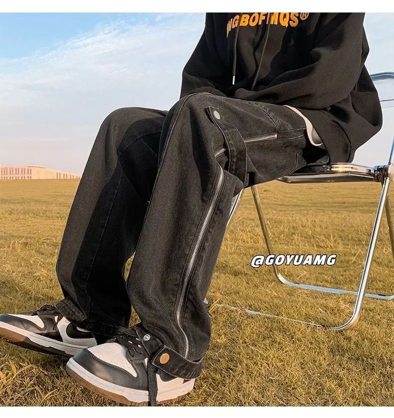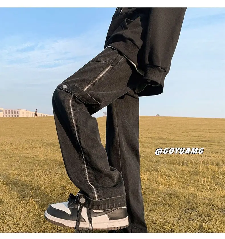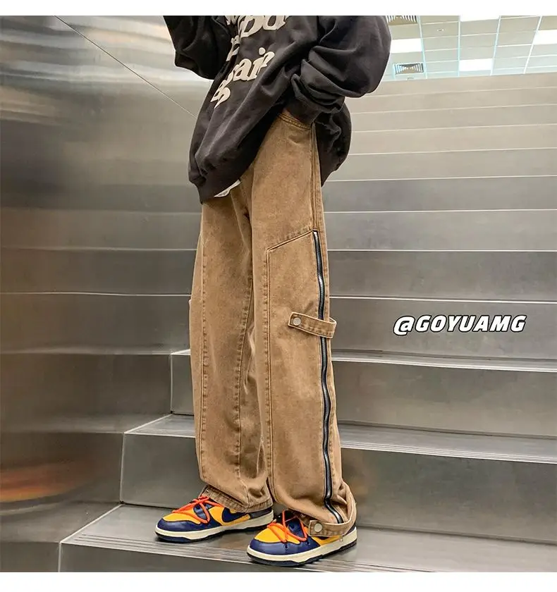 WIAOFELLAS  -  New Jeans for Men Loose and Trendy High Street Wide Leg Pants Trendy Brand Side Zipper Straight Leg Work Pants
