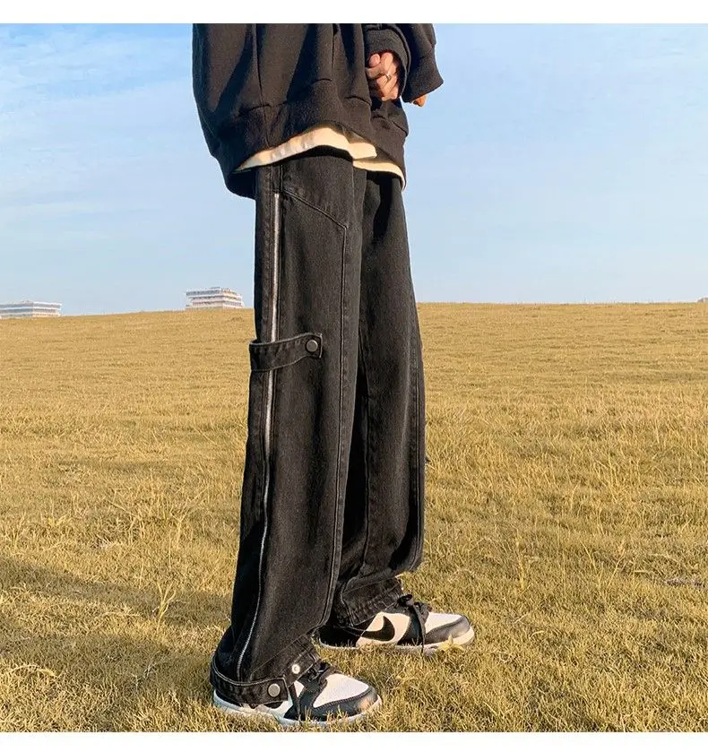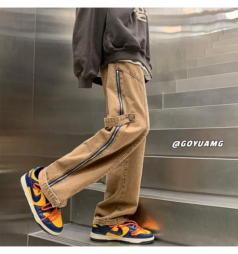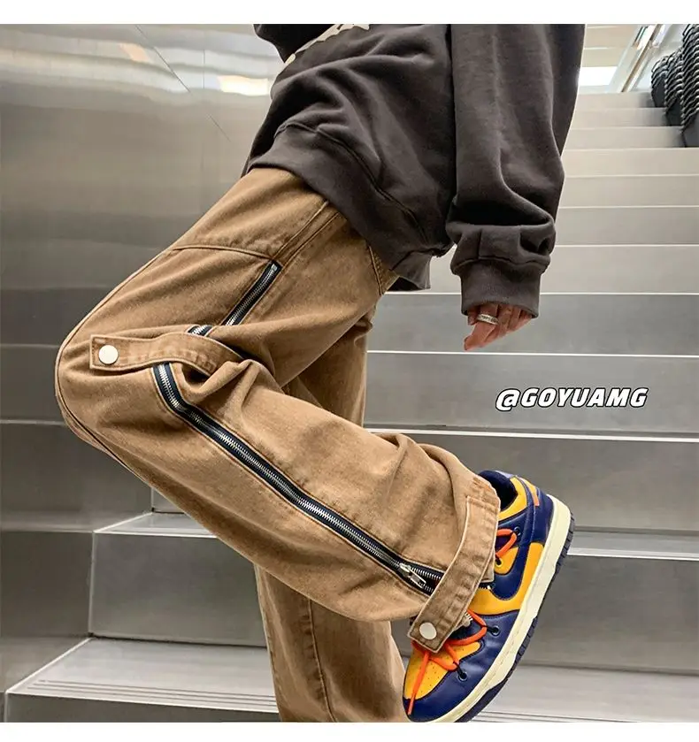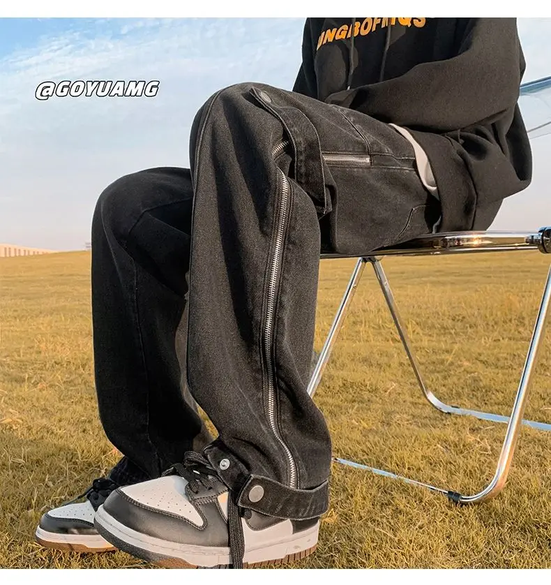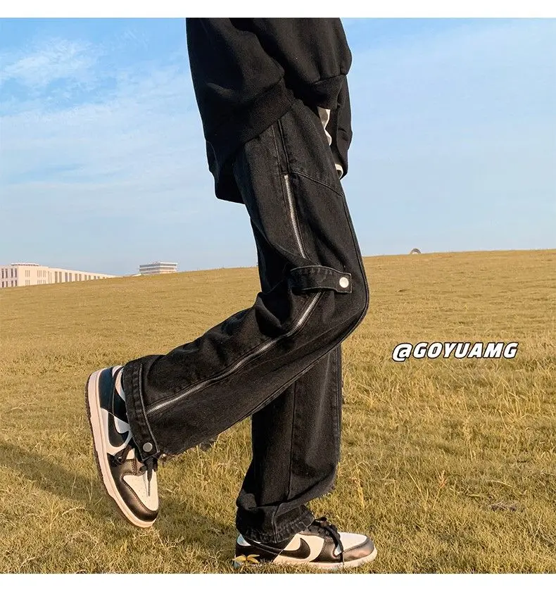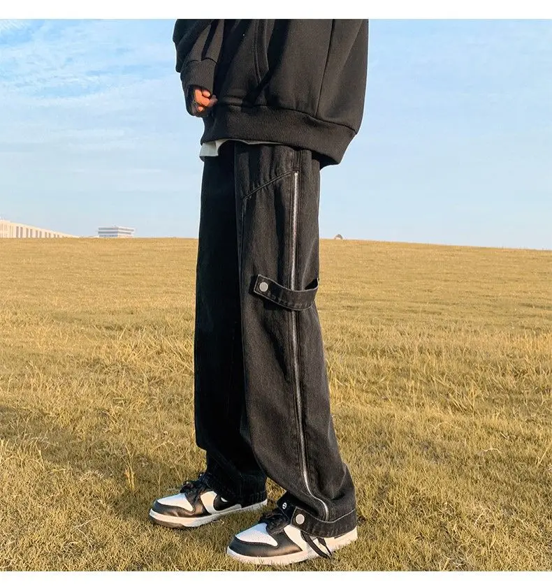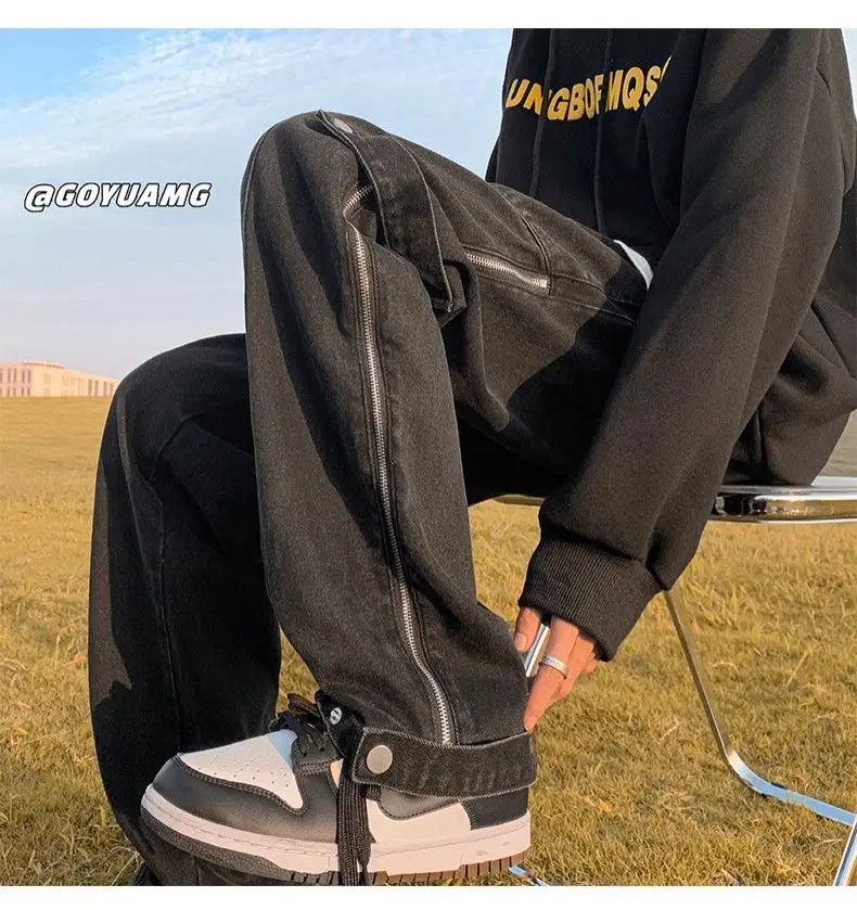 WIAOFELLAS  -  New Jeans for Men Loose and Trendy High Street Wide Leg Pants Trendy Brand Side Zipper Straight Leg Work Pants