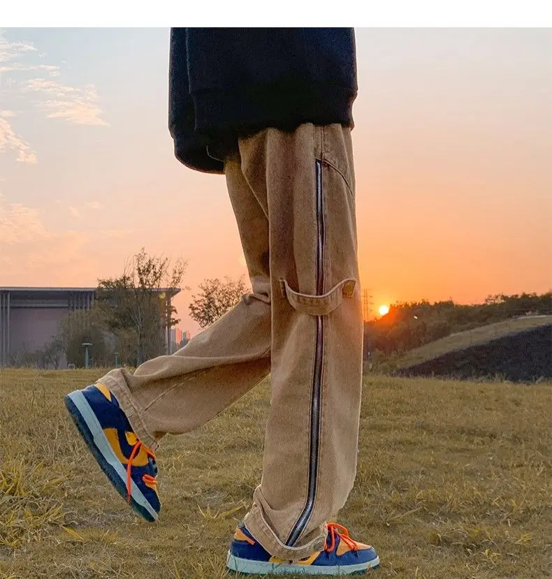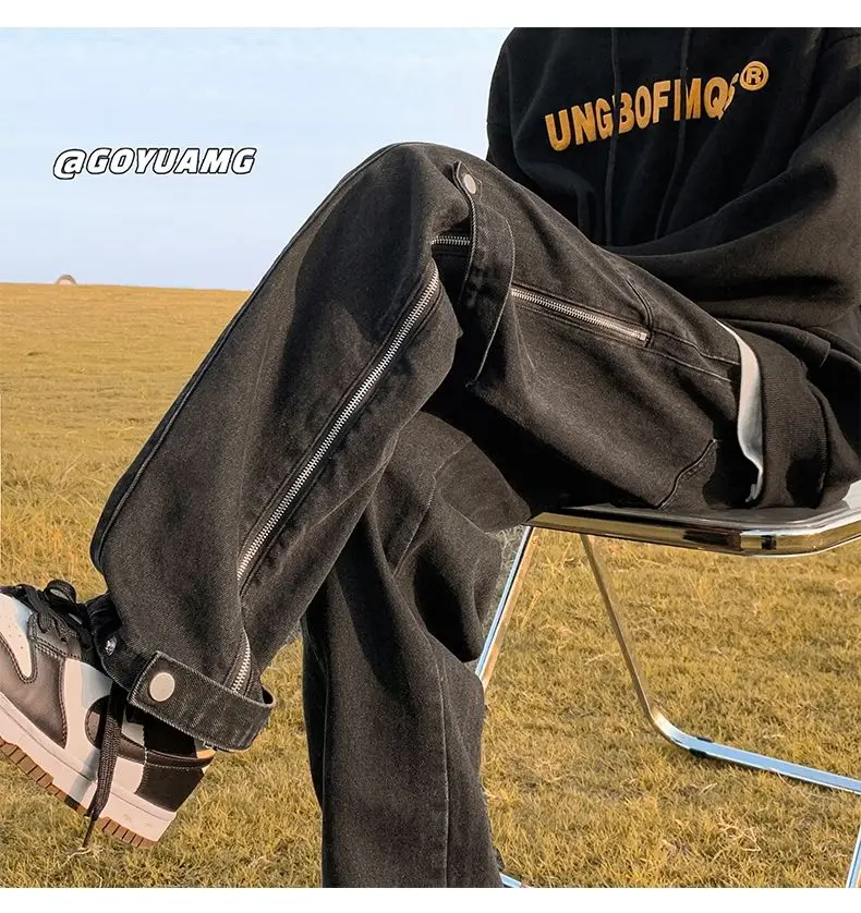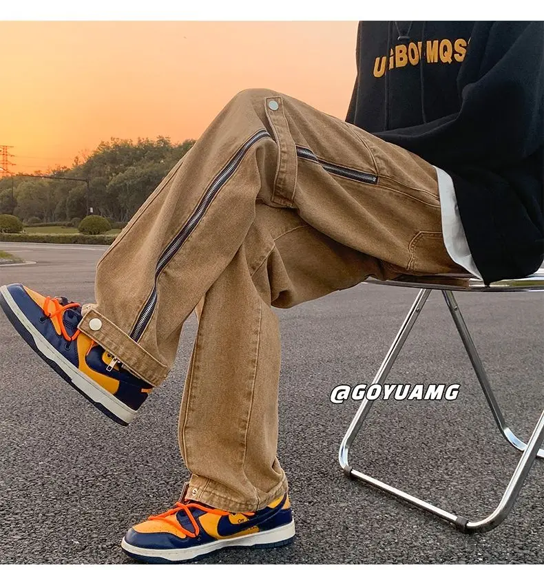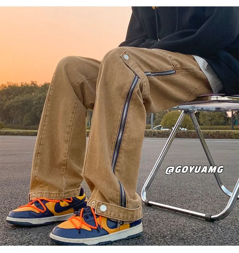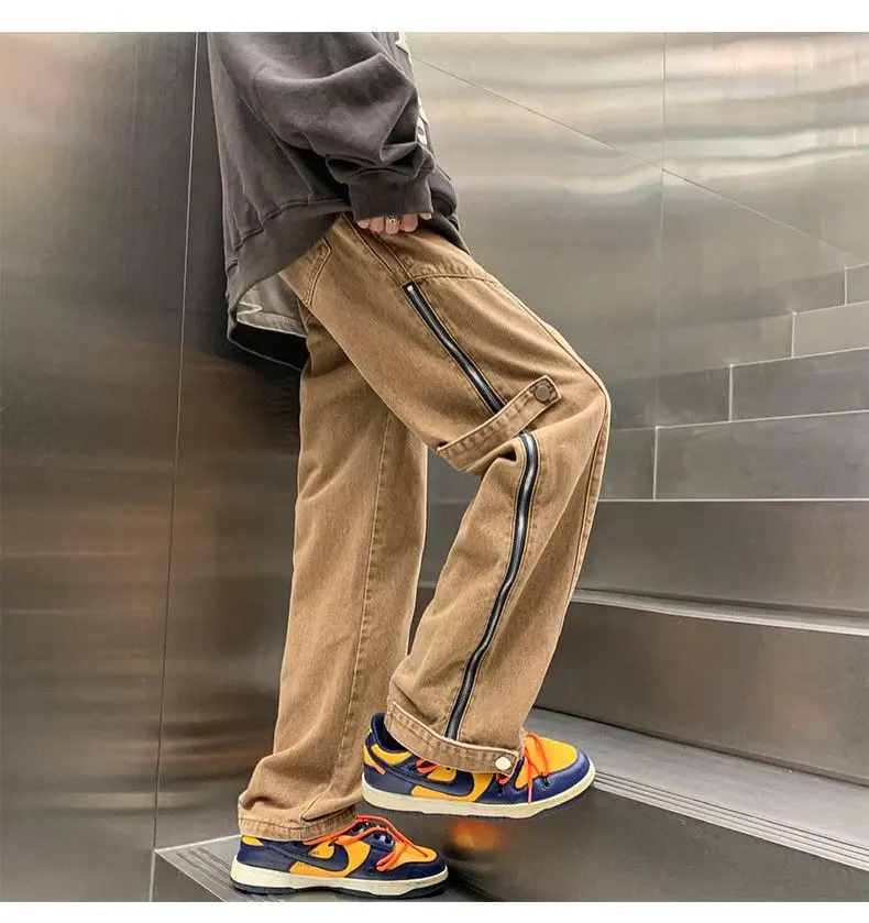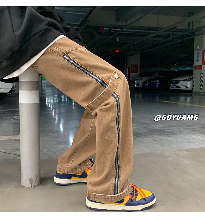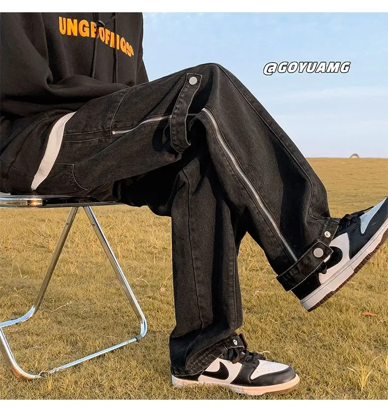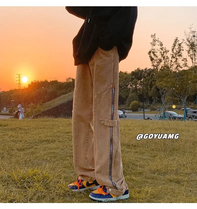 WIAOFELLAS  -  New Jeans for Men Loose and Trendy High Street Wide Leg Pants Trendy Brand Side Zipper Straight Leg Work Pants