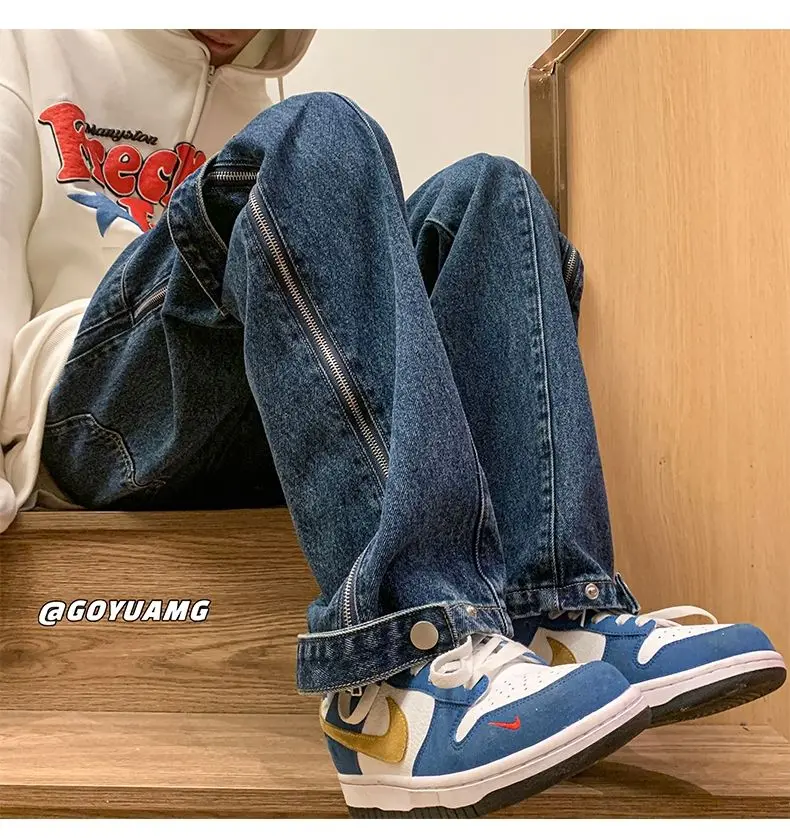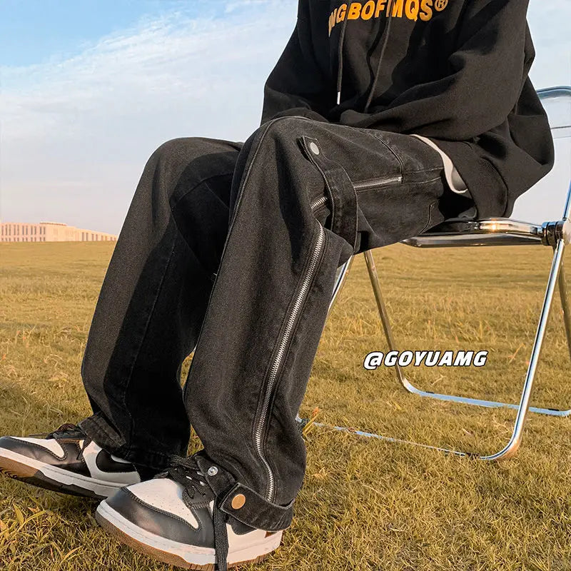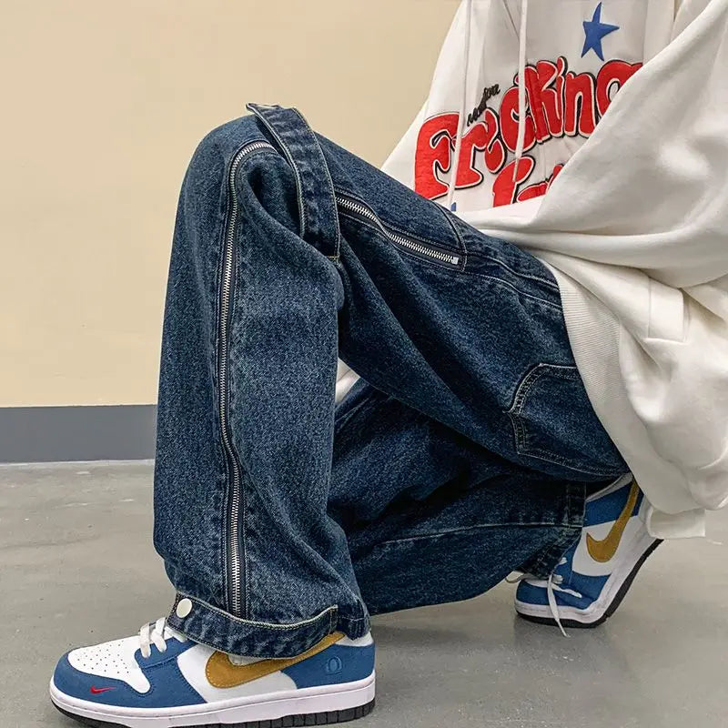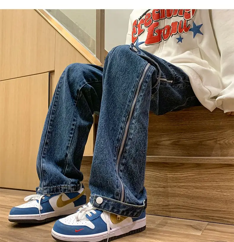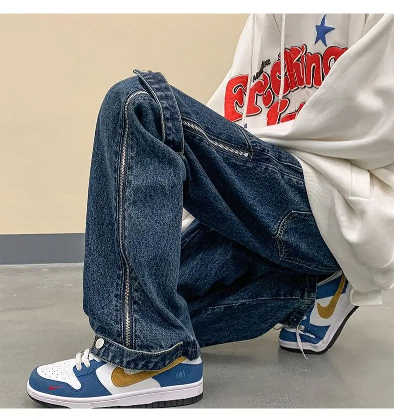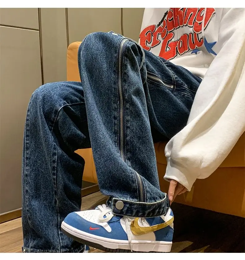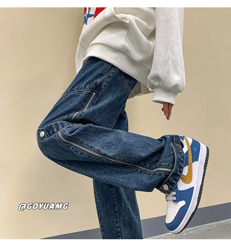 WIAOFELLAS  -  New Jeans for Men Loose and Trendy High Street Wide Leg Pants Trendy Brand Side Zipper Straight Leg Work Pants