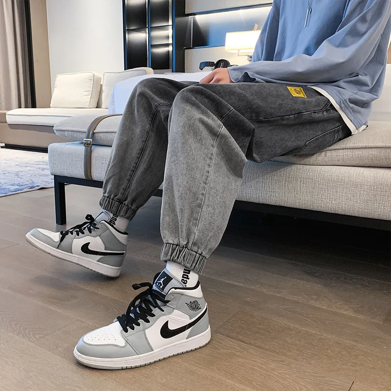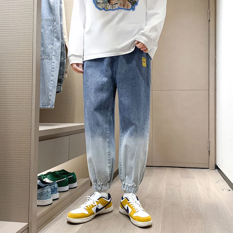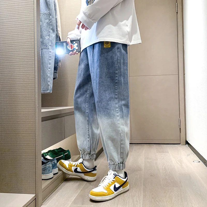 Wiaofellas New men's trousers loose casual pants tide brand gradient jeans fashion elastic waist drawstring nine-point pants punk pants