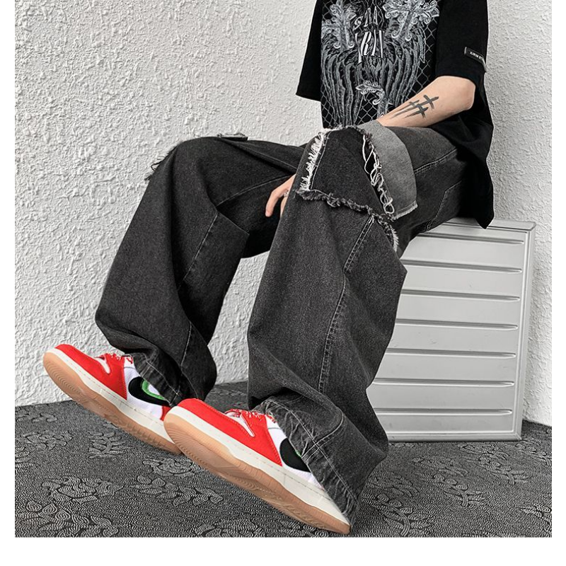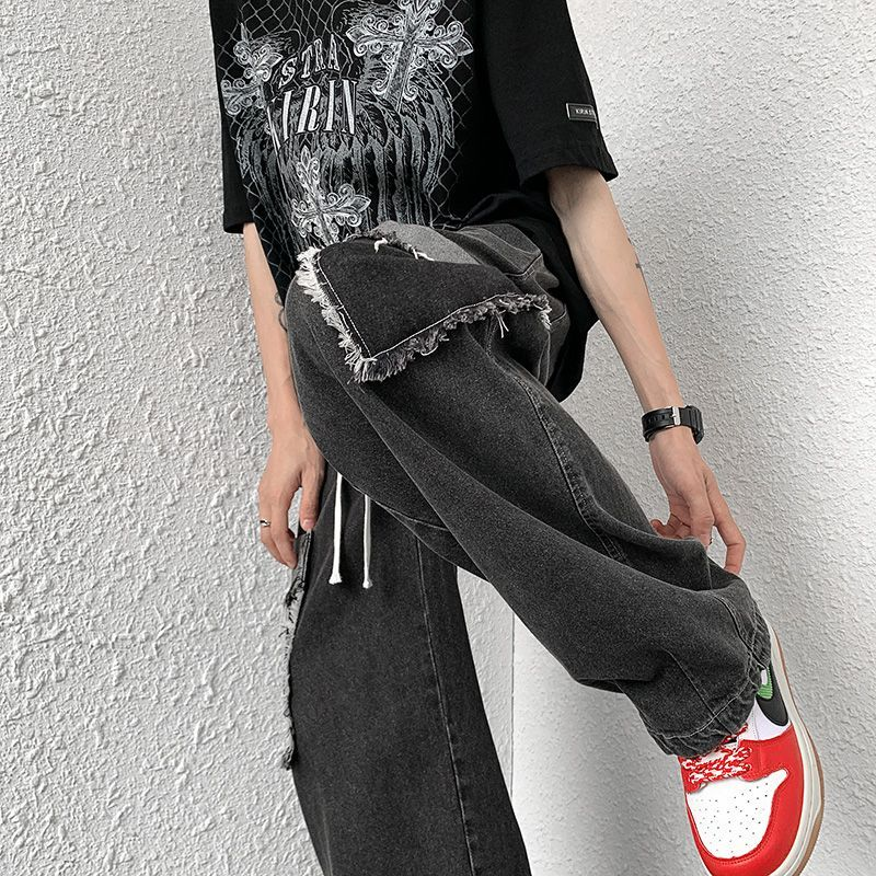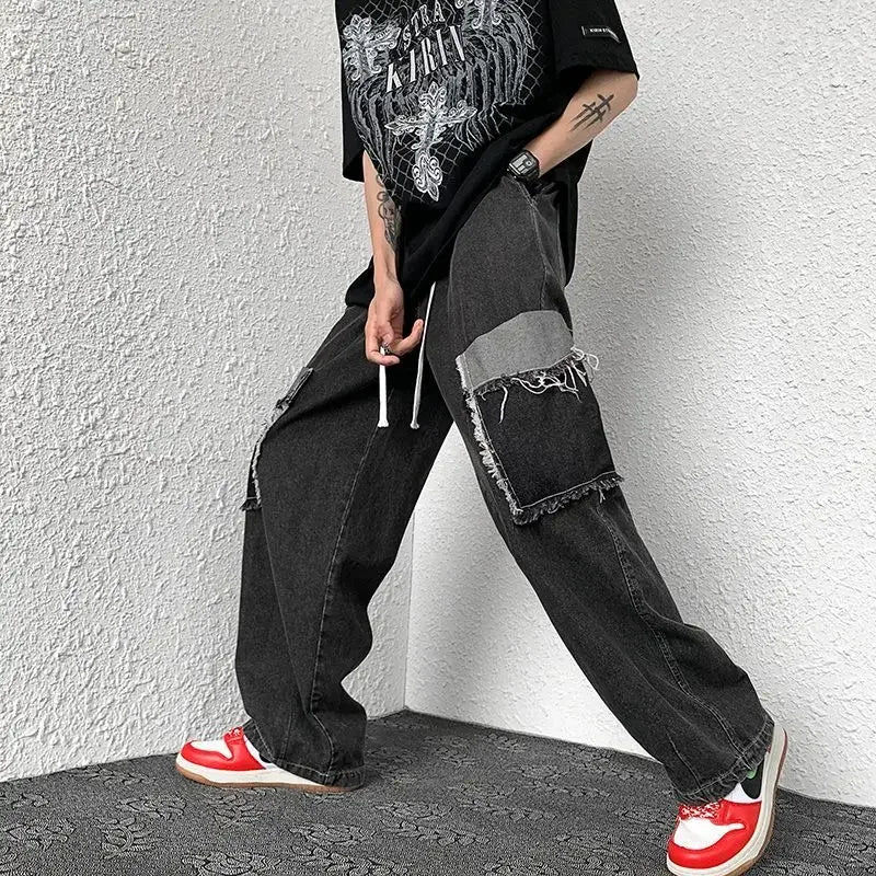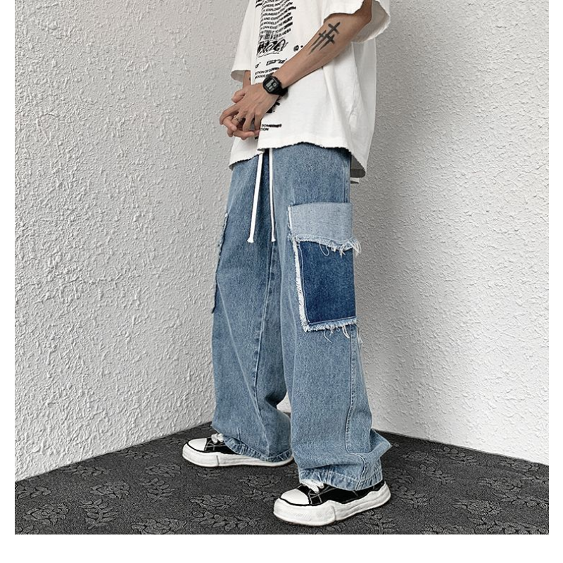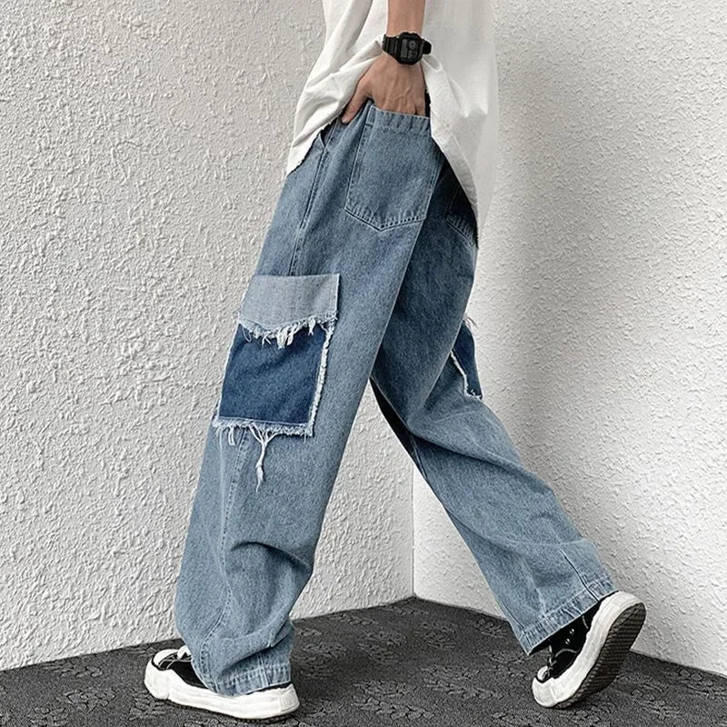 WIAOFELLAS - Spring Autumn Big Pocket American Vintage Elastic Waist Jeans Men Casual Fashion Straight Neutral Denim Trousers Male