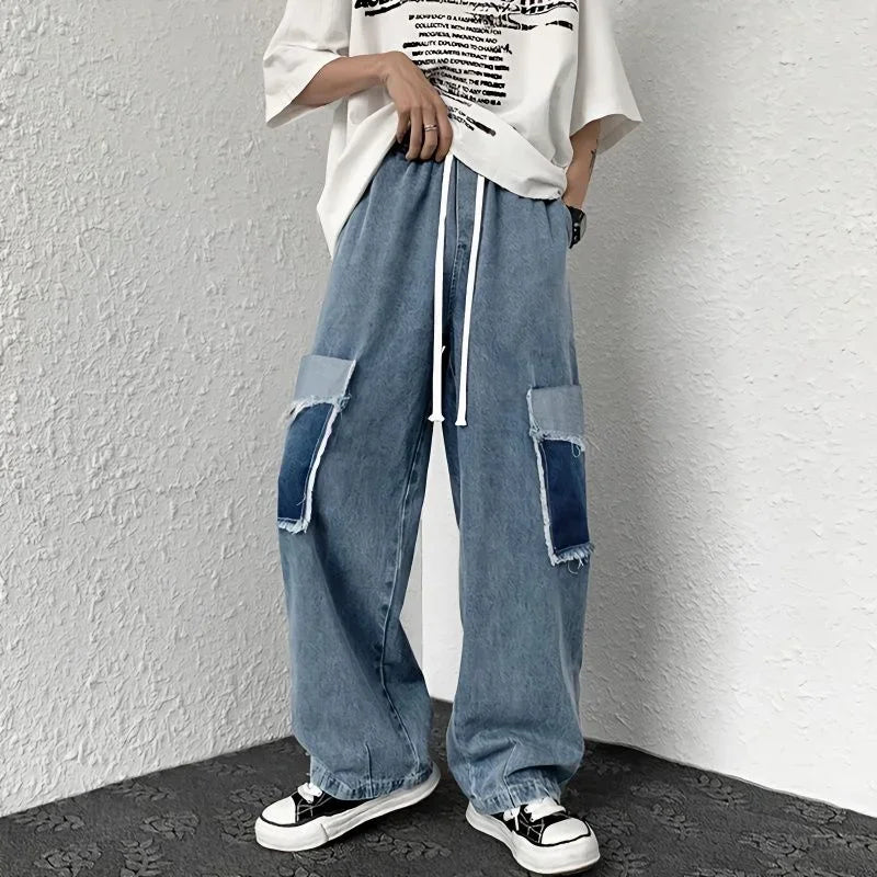 WIAOFELLAS  -  Spring Autumn Big Pocket American Vintage Elastic Waist Jeans Men Casual Fashion Straight Neutral Denim Trousers Male