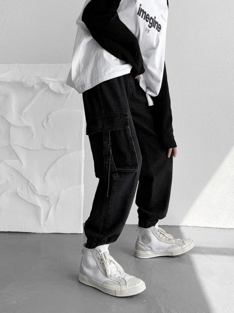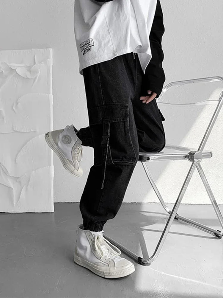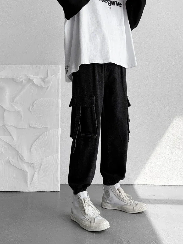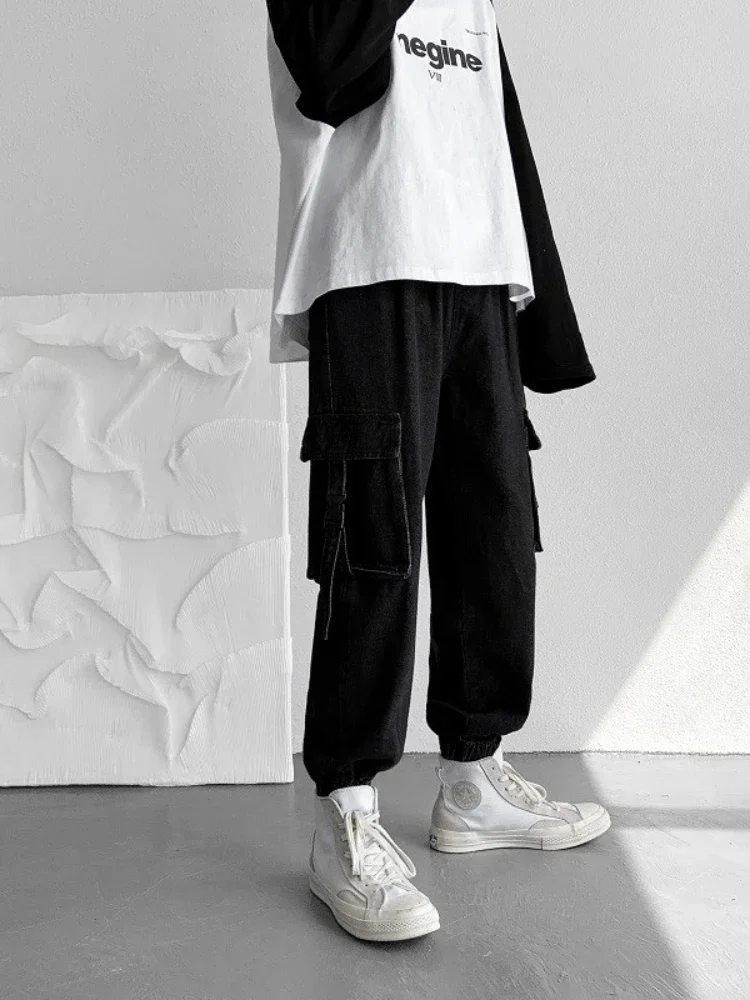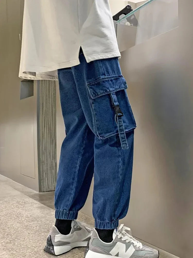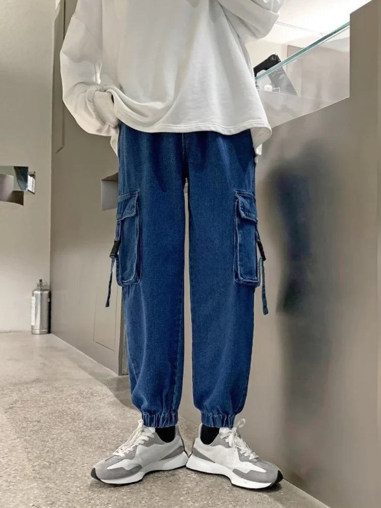 WIAOFELLAS  -  Spring Autumn Dark Functional Tooling Jeans Men's Straight-tube Trend Loose Ankle-length Casual Leggings Denim Pants
