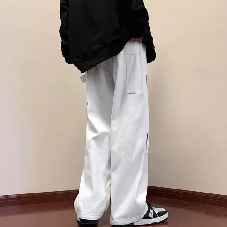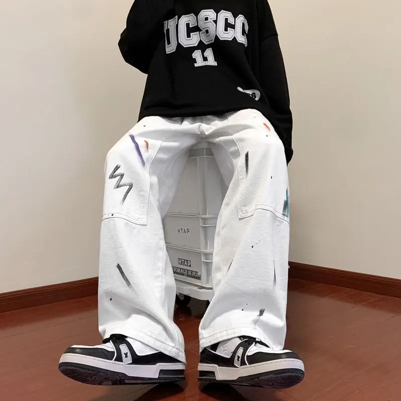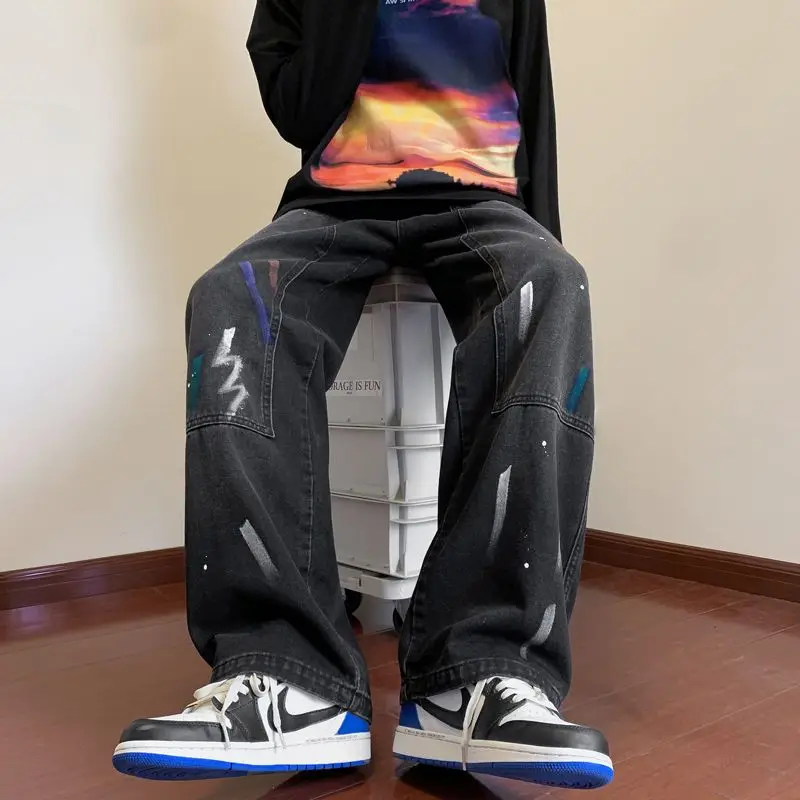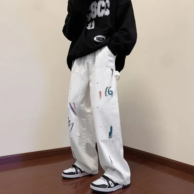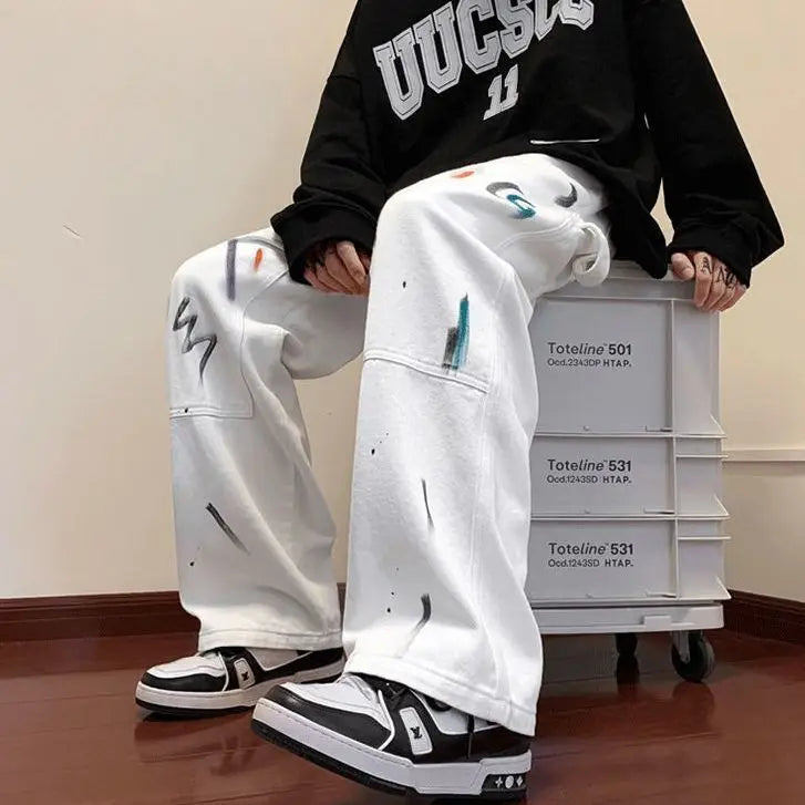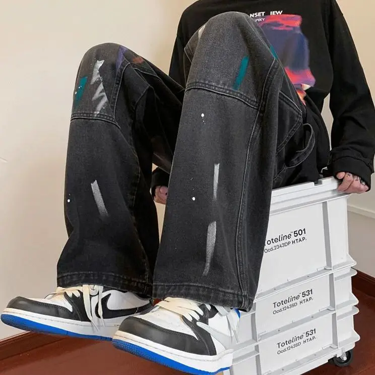 WIAOFELLAS - Spring Autumn Fashion Pure Color Splashed Ink Jeans Men's Clothing American Style Loose Casual Chaopai Wide Leg Trousers