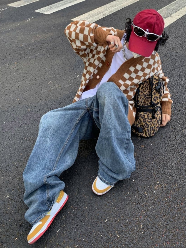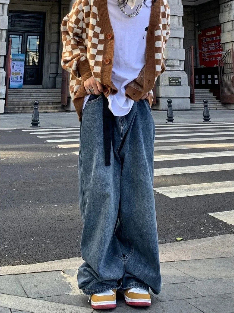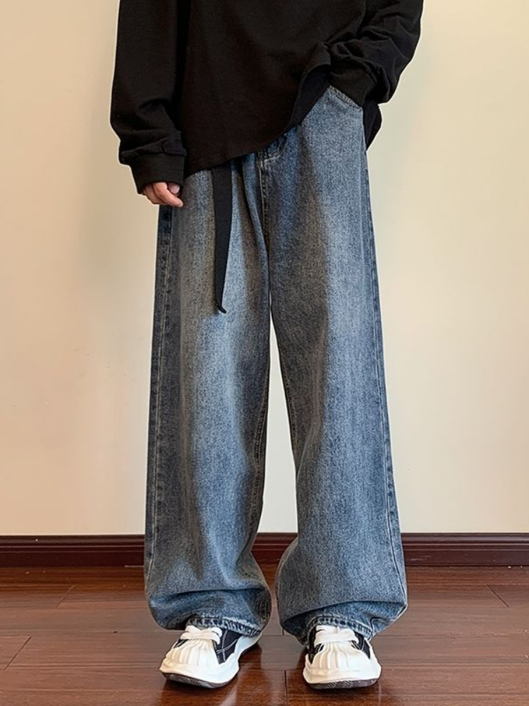 WIAOFELLAS - Spring Autumn High Street Washed Loose Wide Leg Jeans Men Vintage Trousers Straight Drape Dragging Old Denim Pants