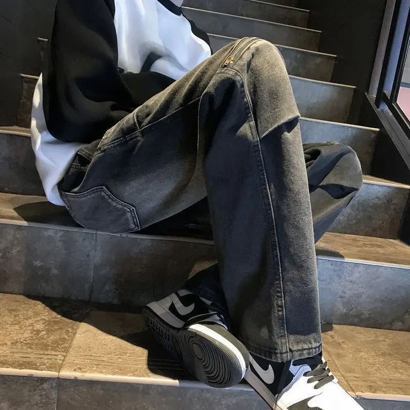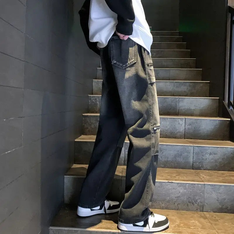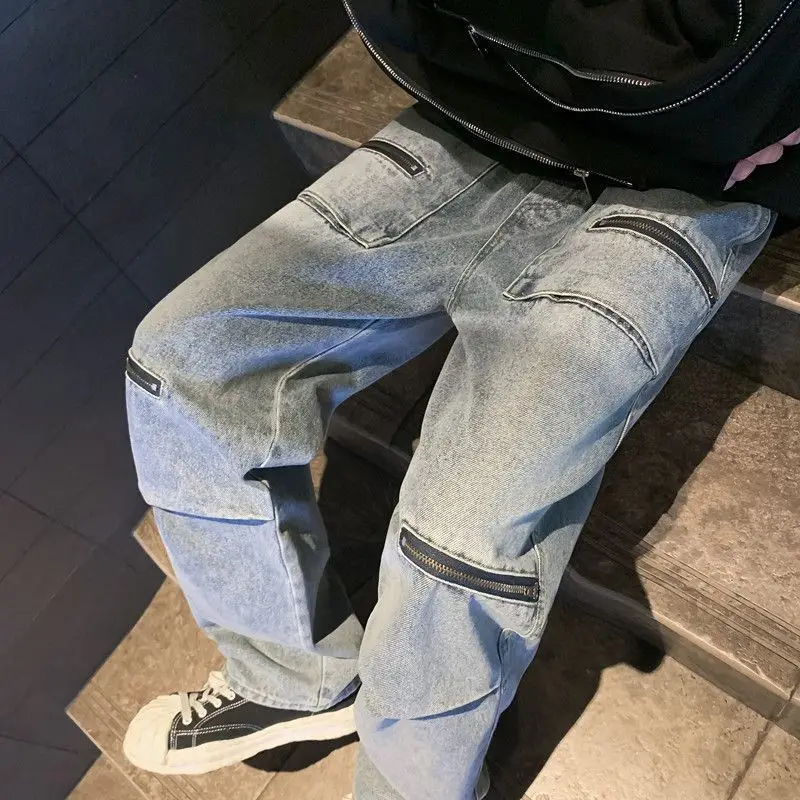 WIAOFELLAS - Spring Autumn New American Retro Jeans Washed Overalls Y2K High Waist Multi Pocket Loose Street Hip Hop Casual Men S Wear