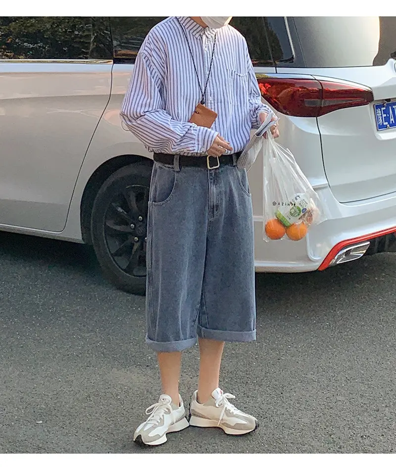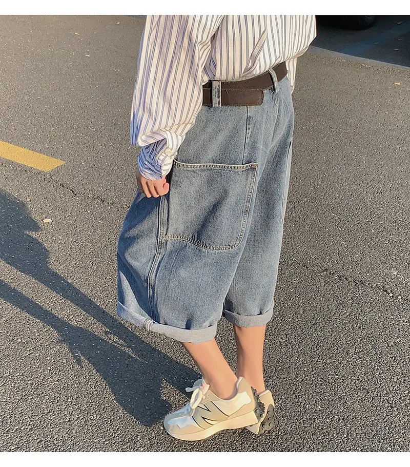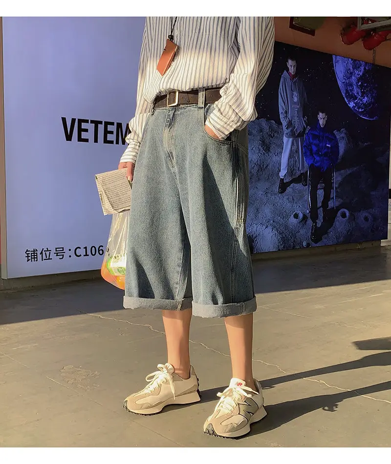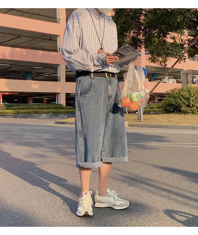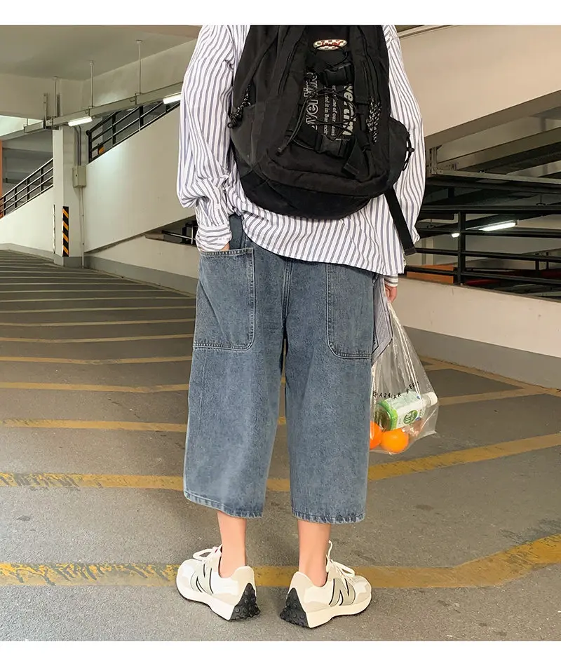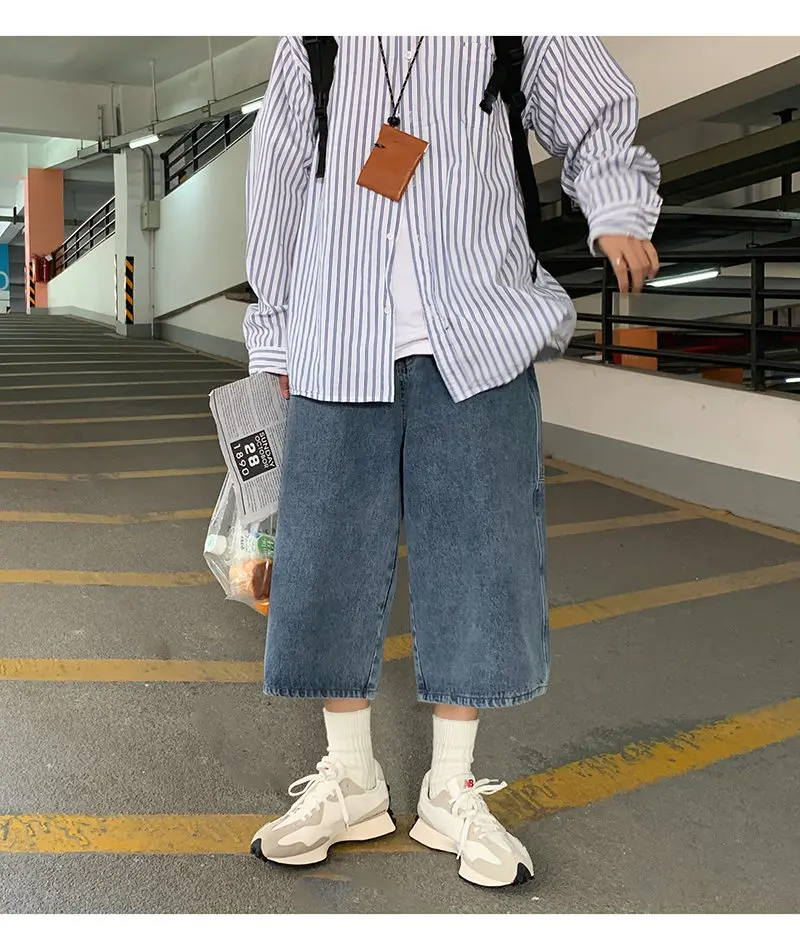 Wiaofellas Summer Blue Jeans Men Fashion Retro Oversized Jeans Mens Streetwear Hip-hop Loose Straight Denim Shorts Men Cropped Trousers