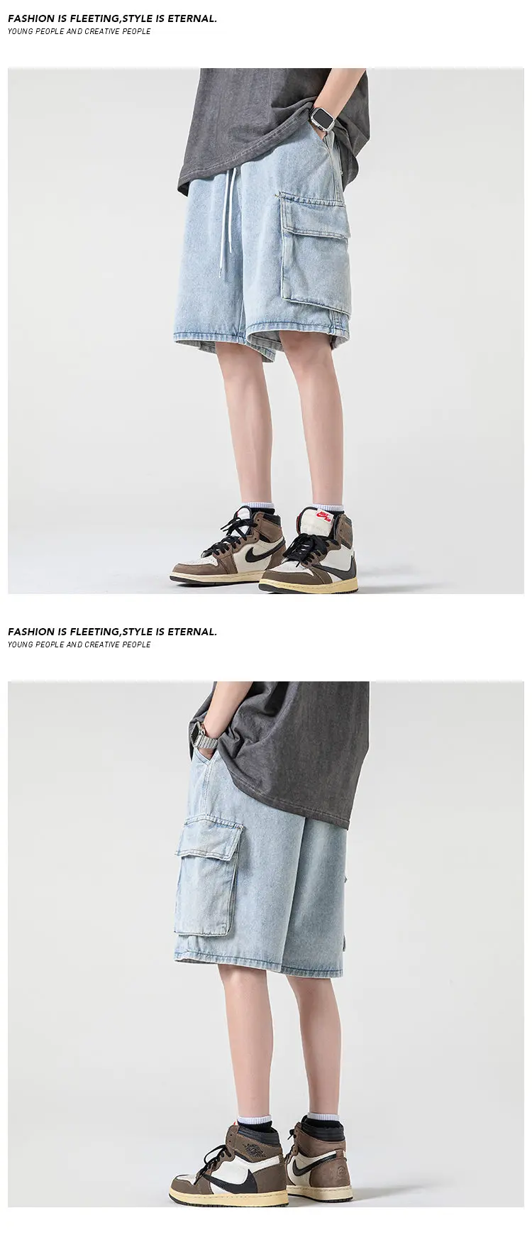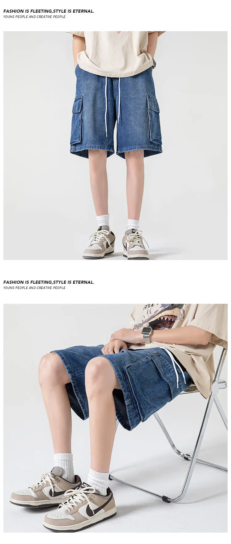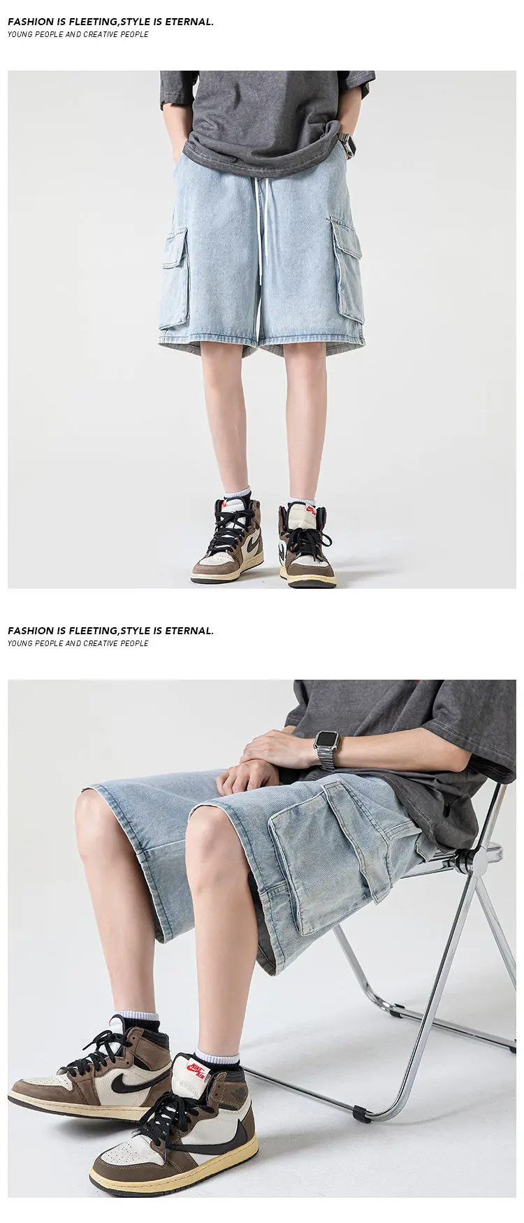 Wiaofellas Summer Cargo Denim Shorts Men Fashion Retro Pocket Denim Shorts Mens Japanese Streetwear Hip-hop Loose Blue Jeans Shorts Men